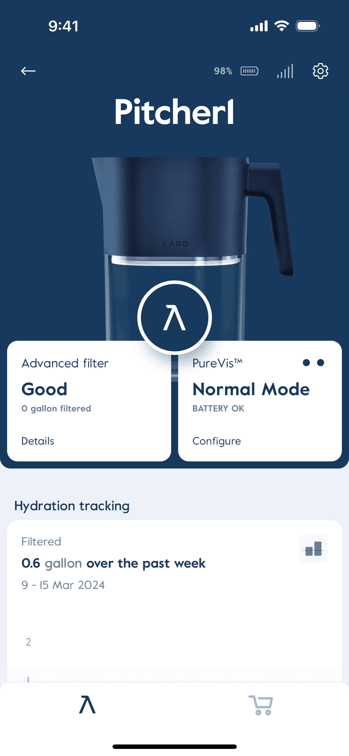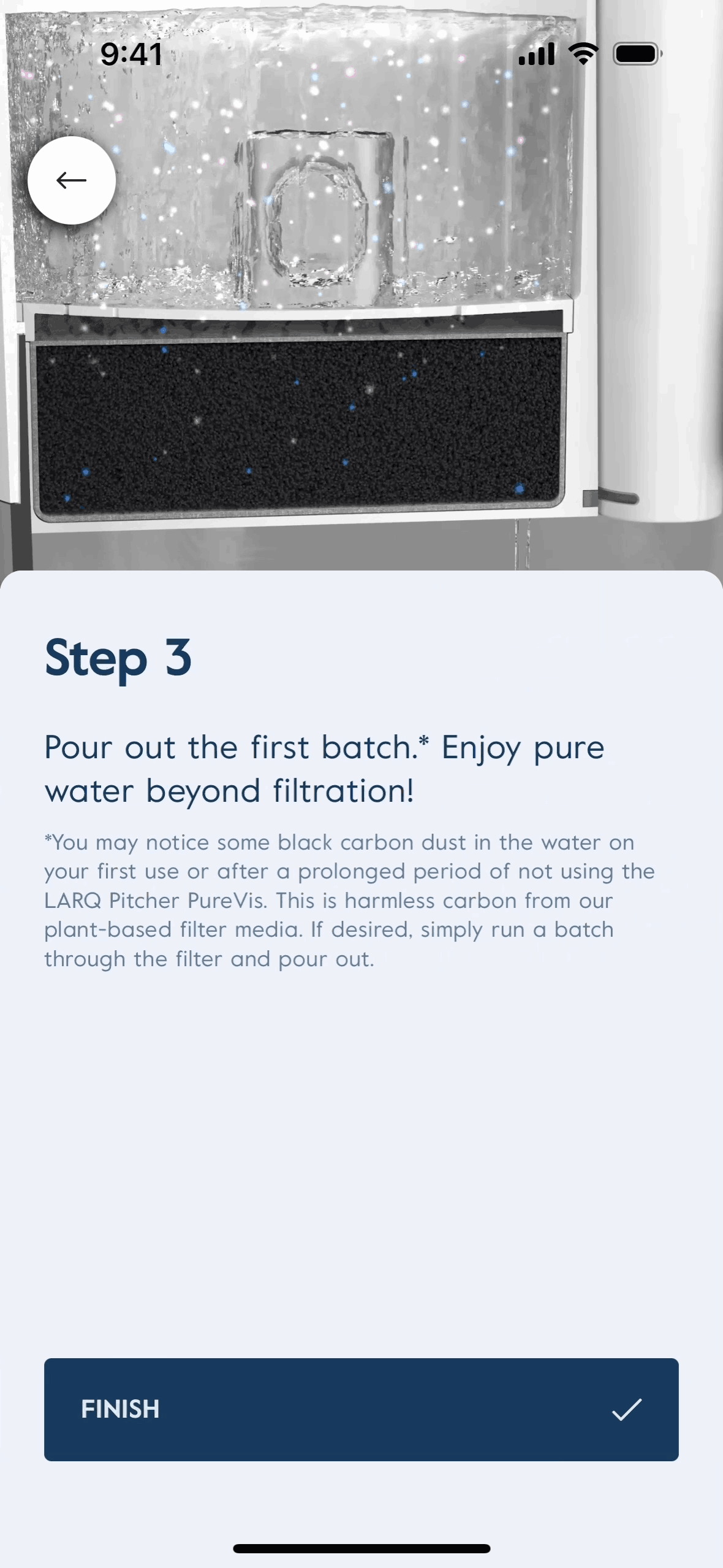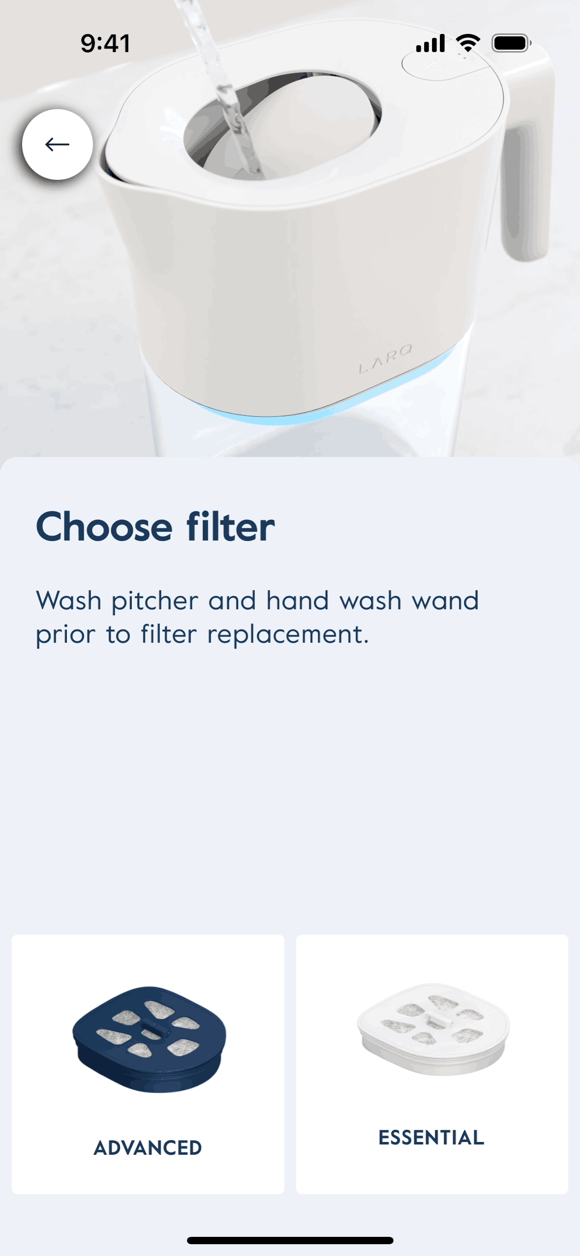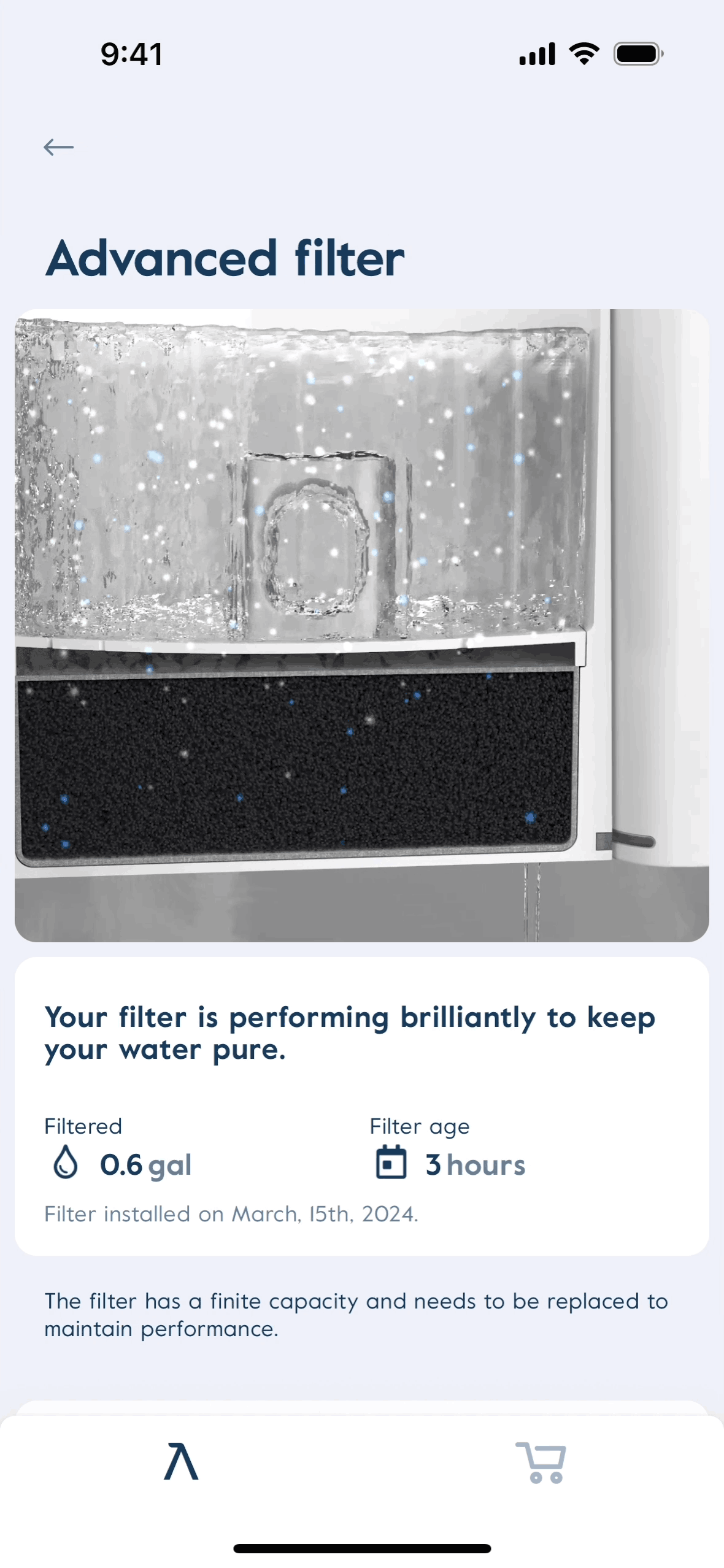 The user flow demonstrates installing a new water filter, starting from the dashboard, navigating through installation steps, and ending with updated filter details.