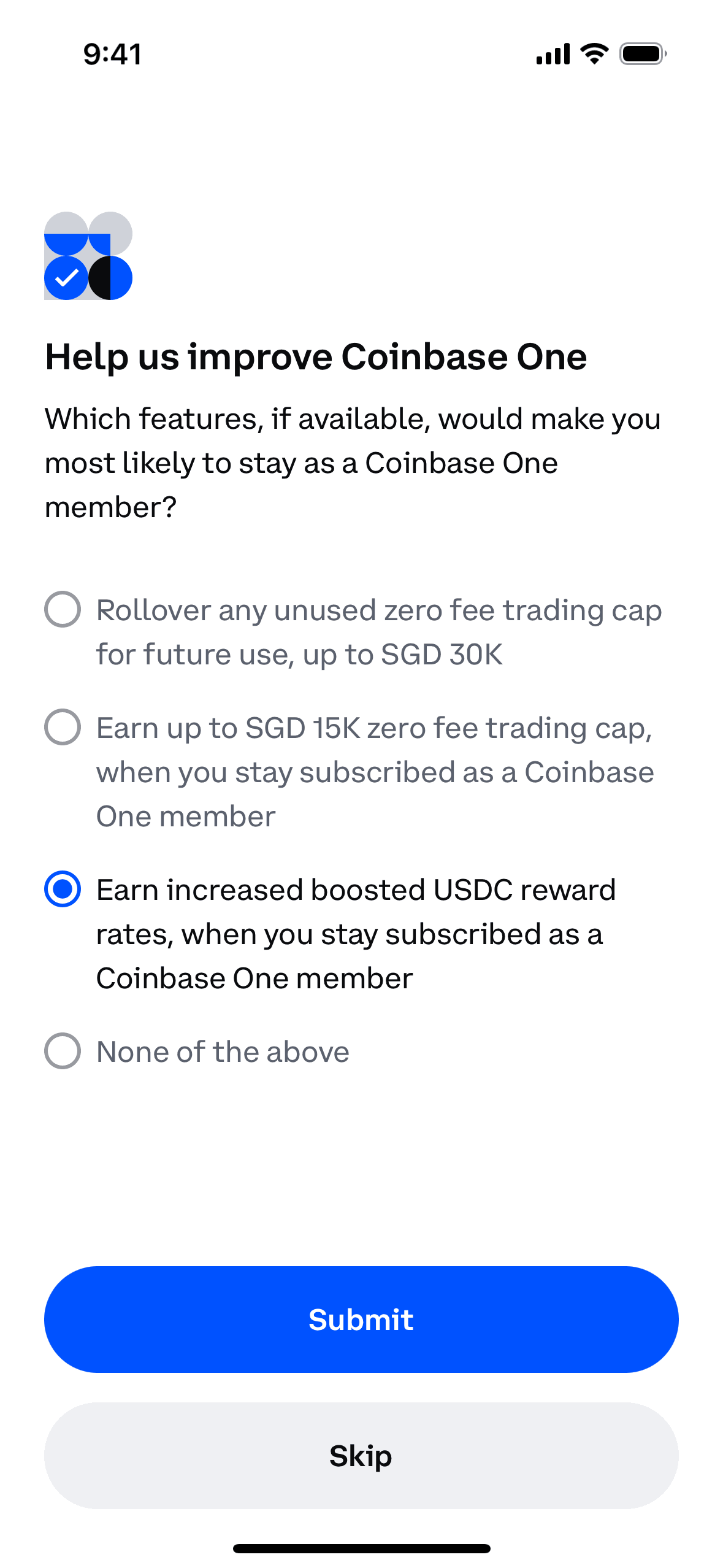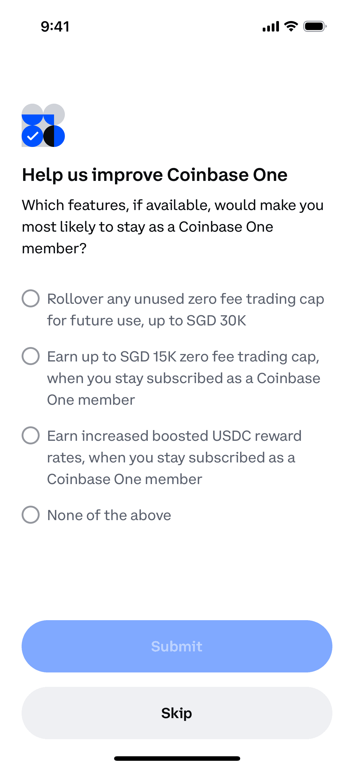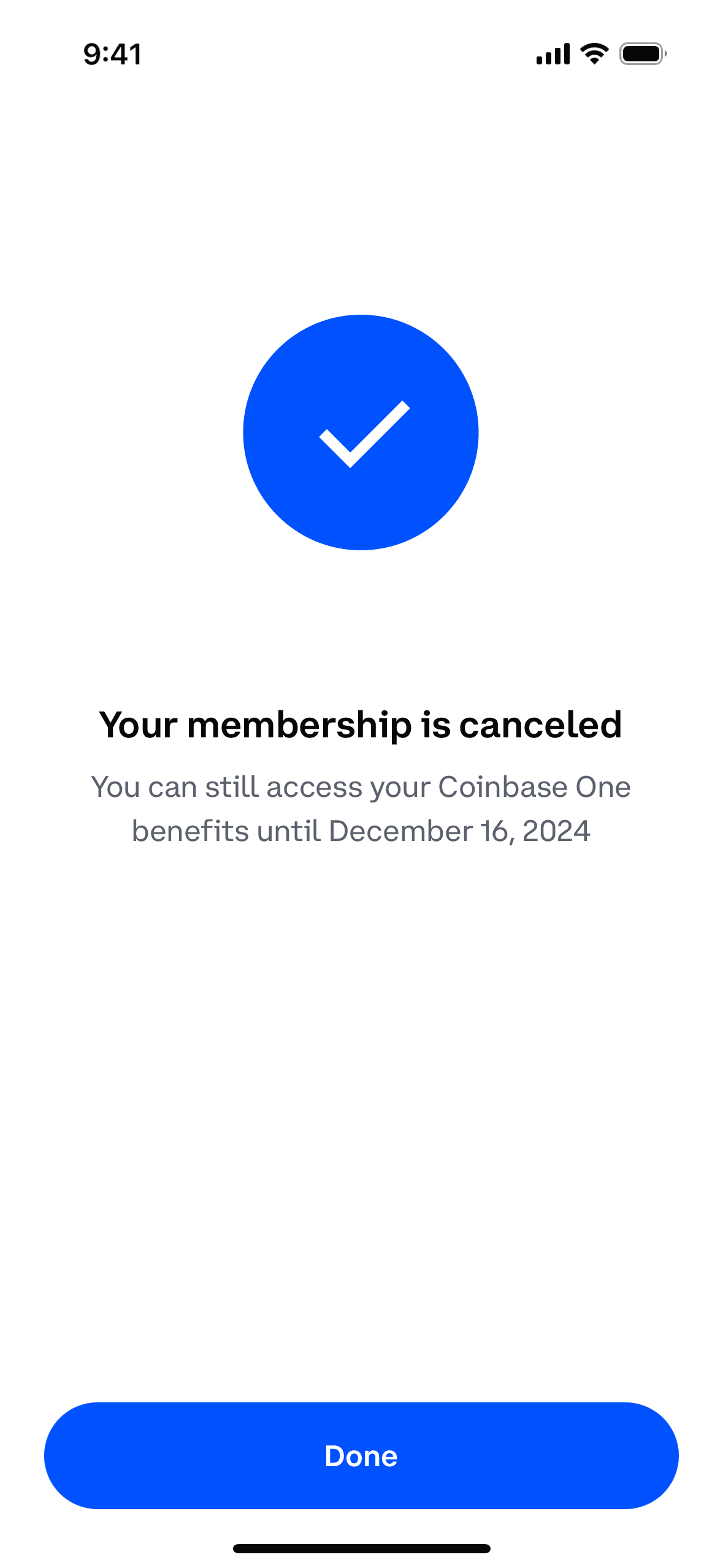 The user cancels their Coinbase One membership, confirms the cancellation, and then is presented with a survey. The flow showcases the steps to cancel a subscription.