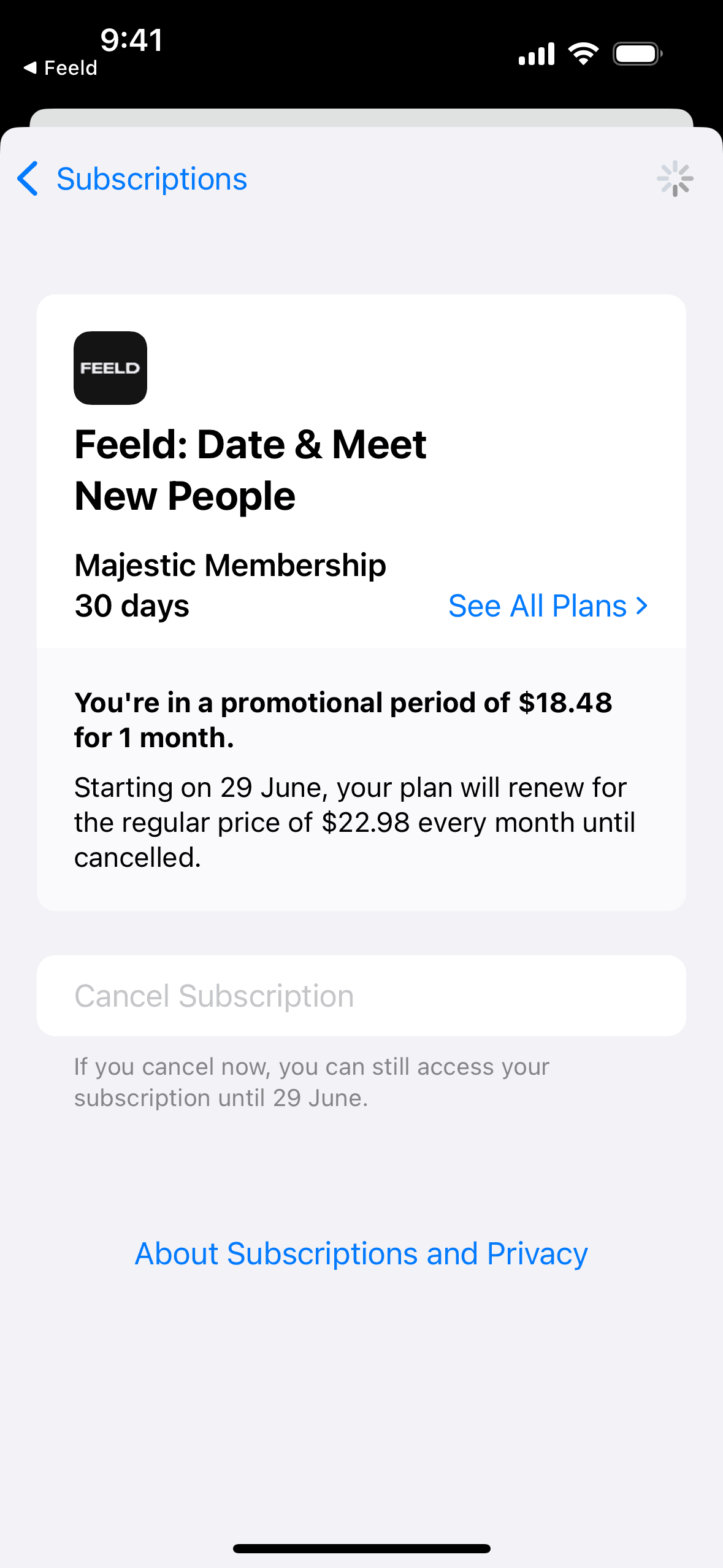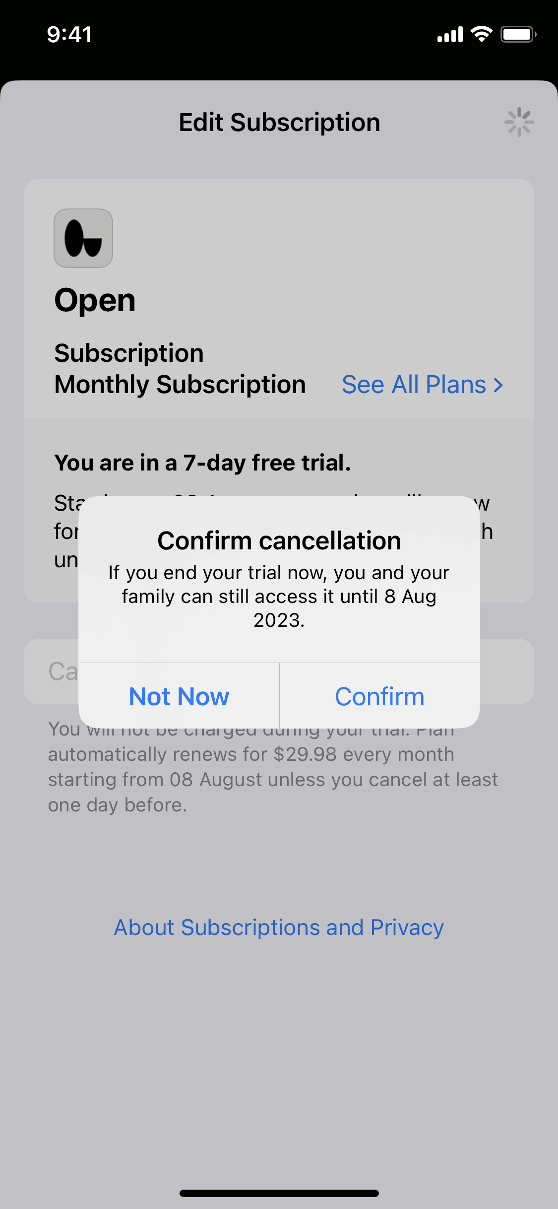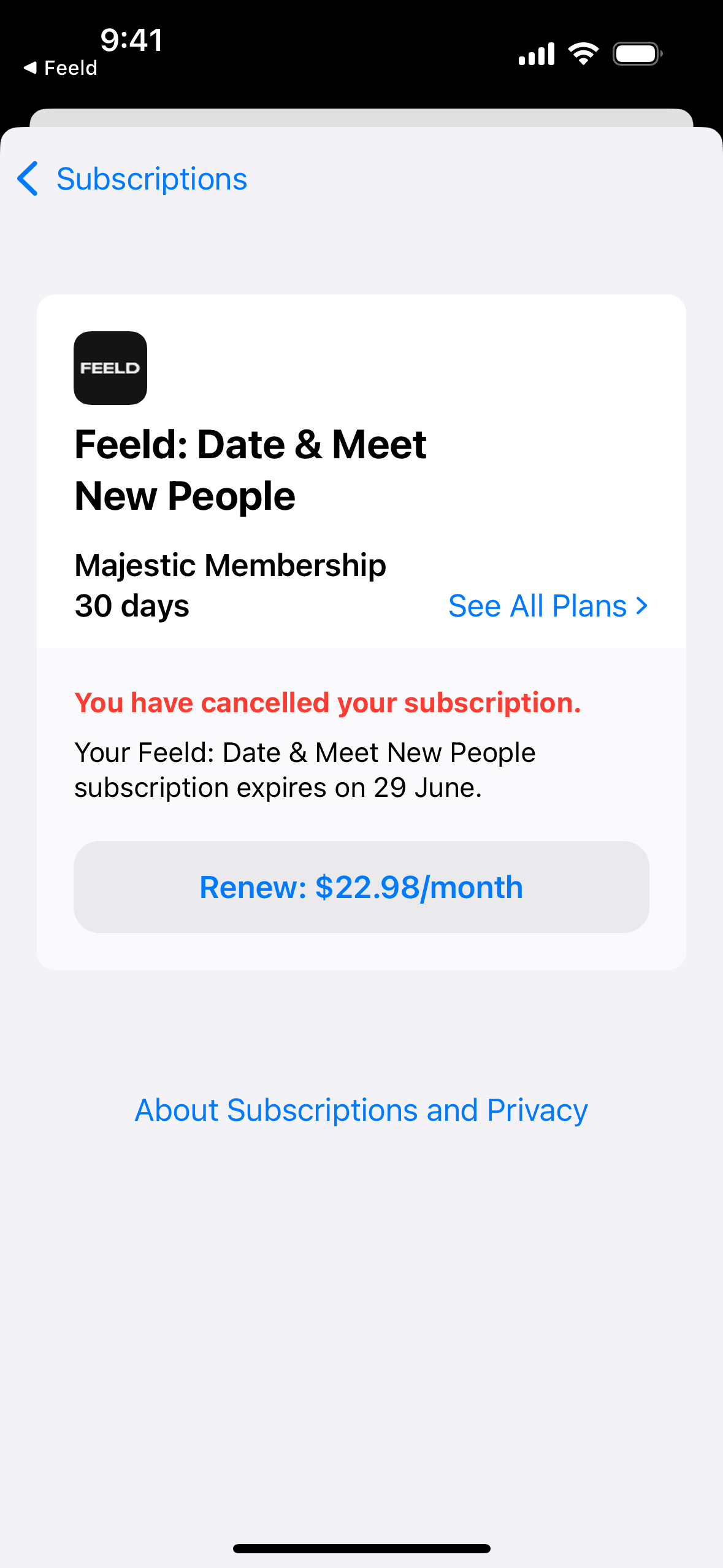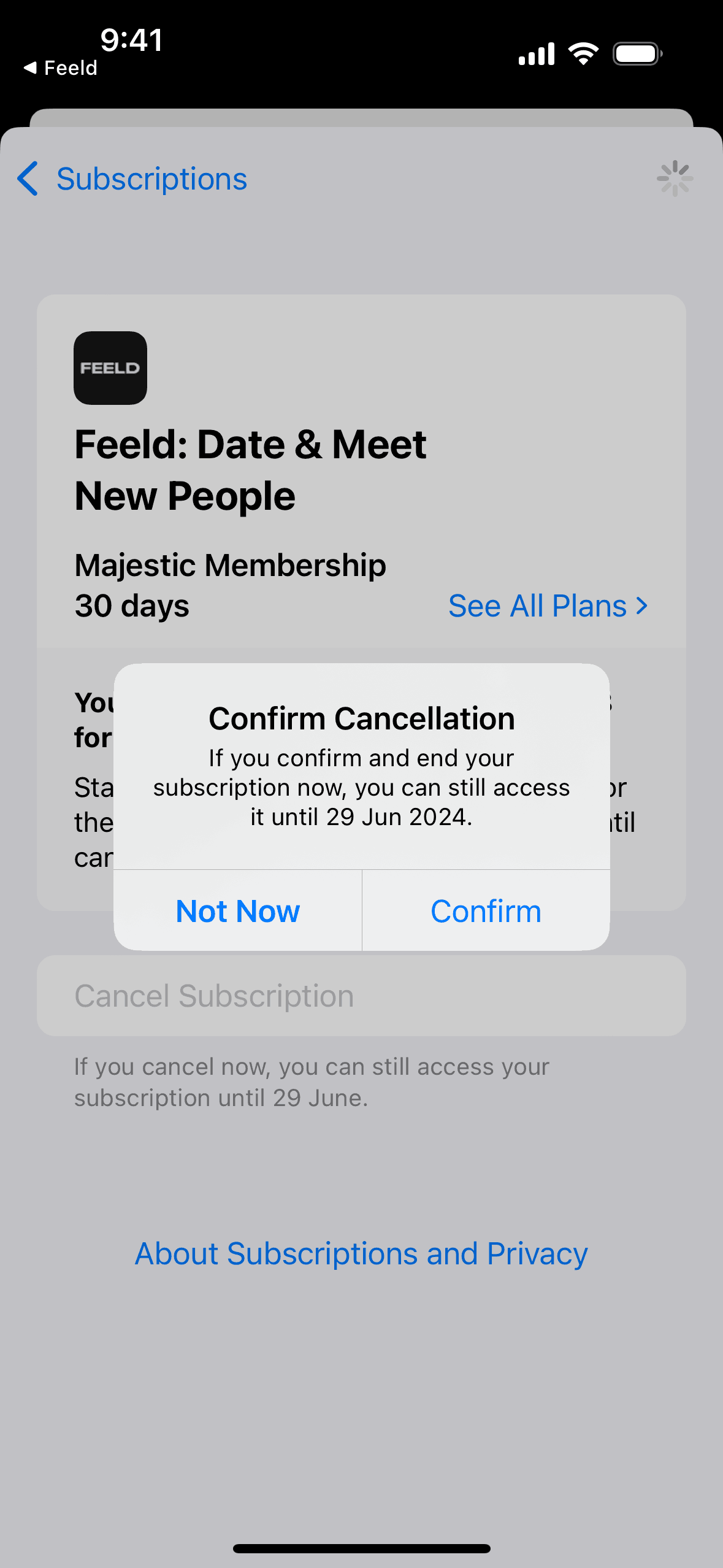 The user navigates through the settings to cancel their subscription. They confirm the cancellation, which results in the subscription expiring.