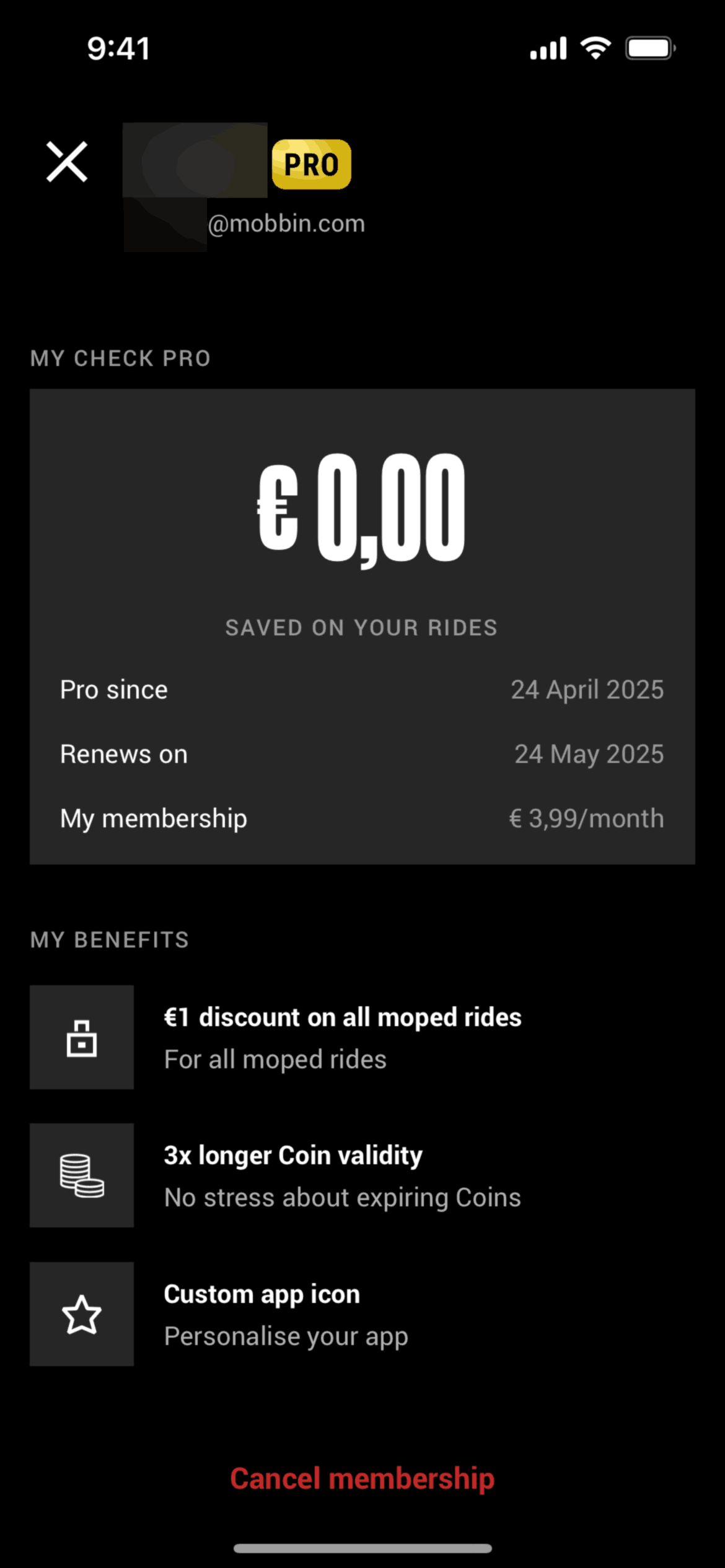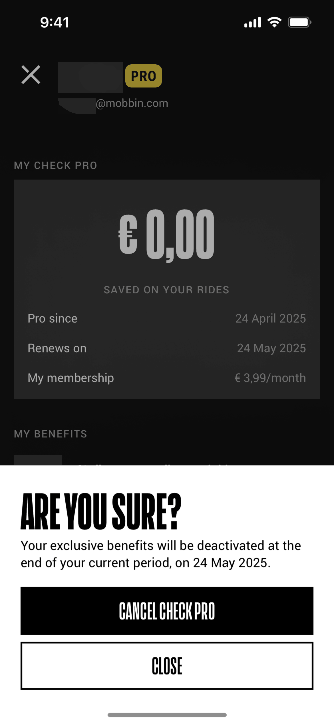 The user cancels their 'Check Pro' membership. They navigate through settings, confirm cancellation, and see the expiring membership status.