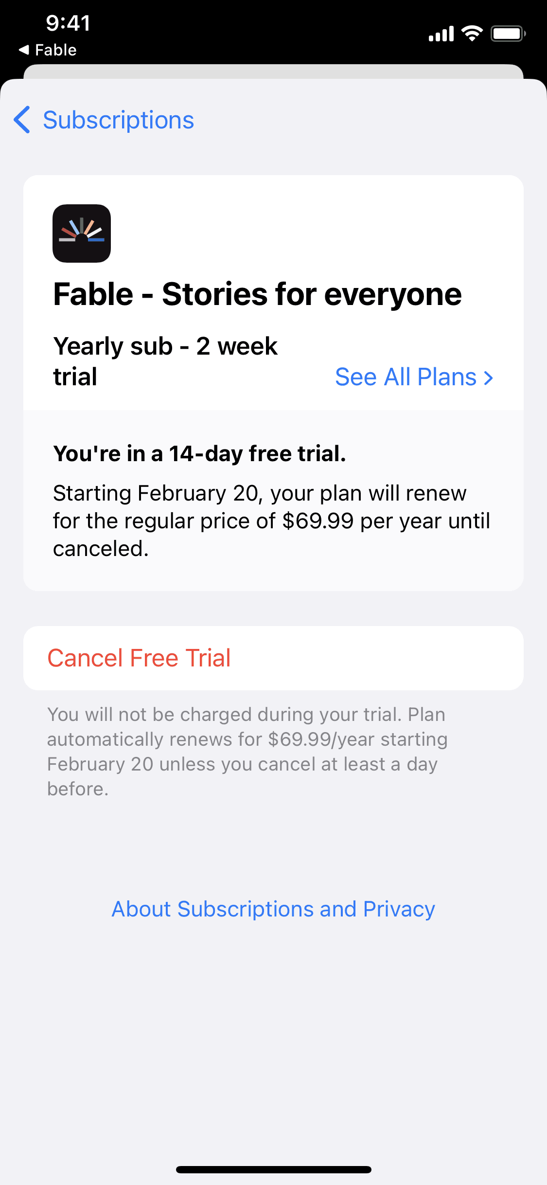 The user navigates through settings to manage subscriptions. They view subscription lists and details, with options to cancel subscriptions or free trials.