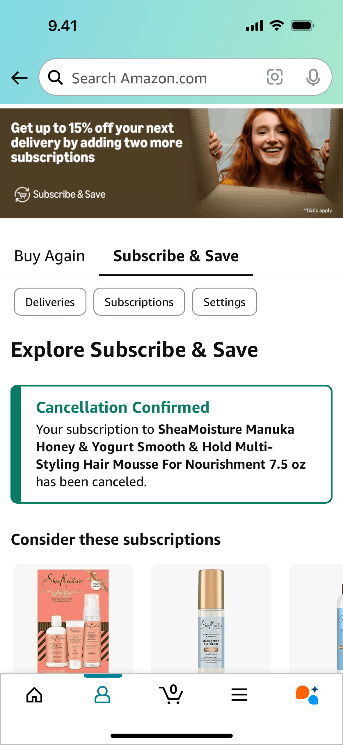 The user cancels their subscription, confirming the action on a confirmation screen. The subscription details page then updates to reflect the cancellation.
