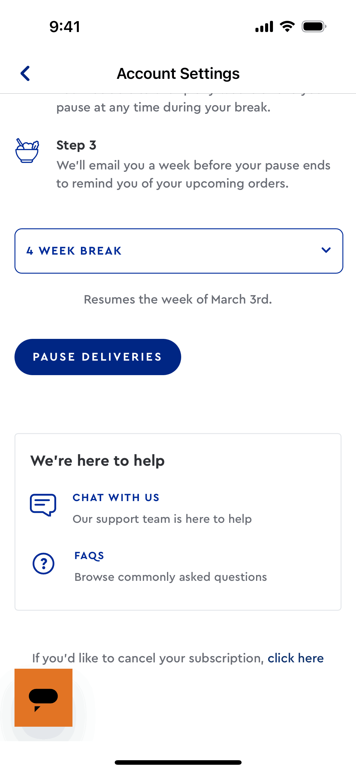 User attempts to cancel subscription, is offered a pause, provides cancellation reasons, and is then redirected to a login screen.