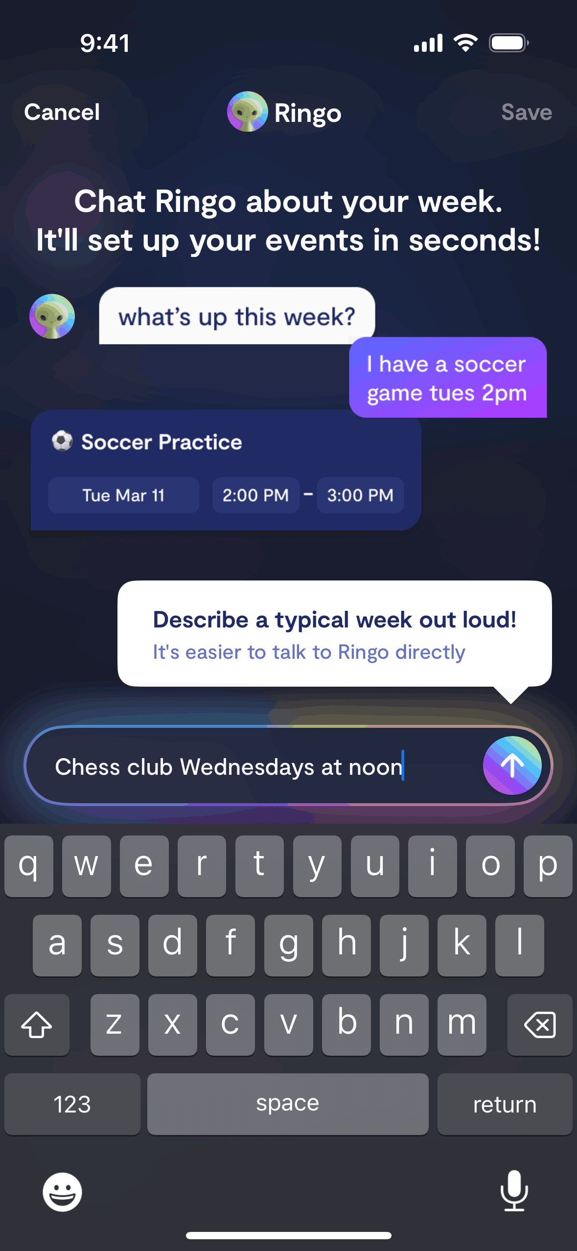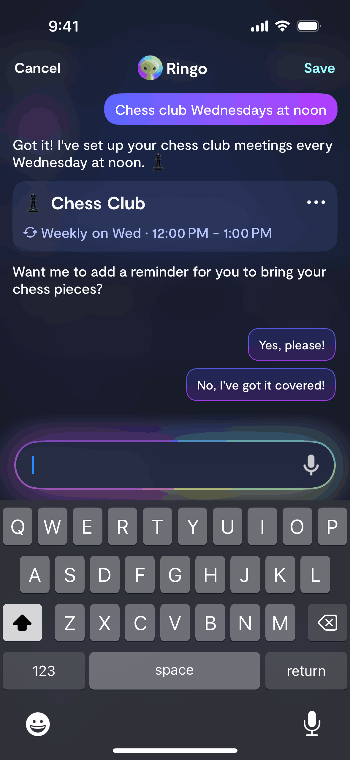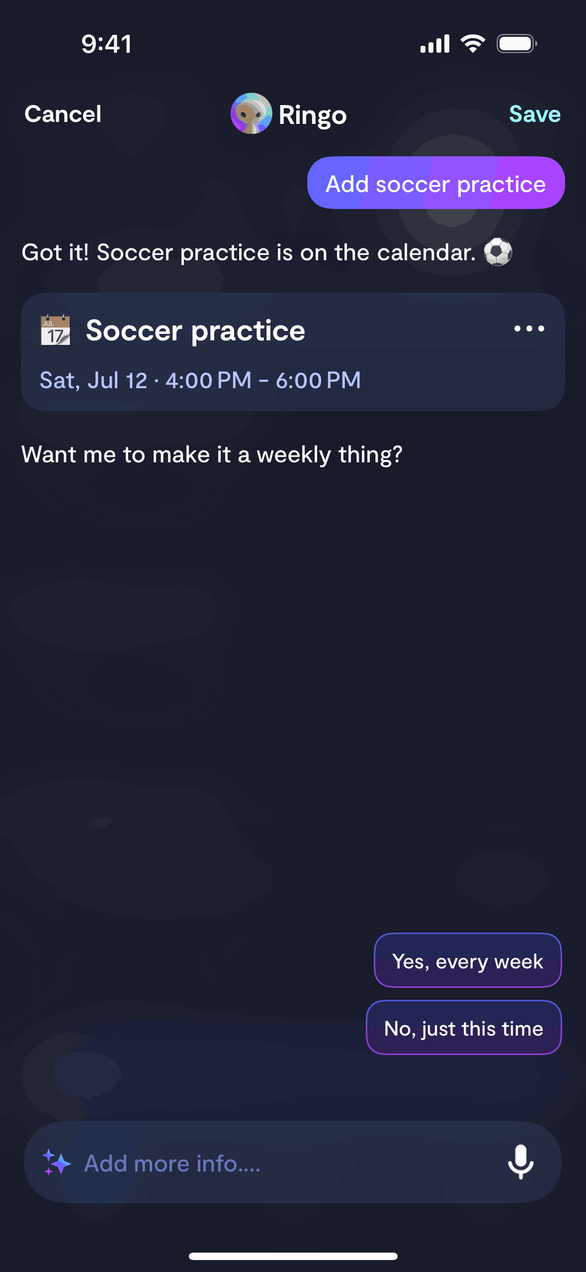 The user adds an event by voice or text input. The app confirms the event and offers recurrence options.