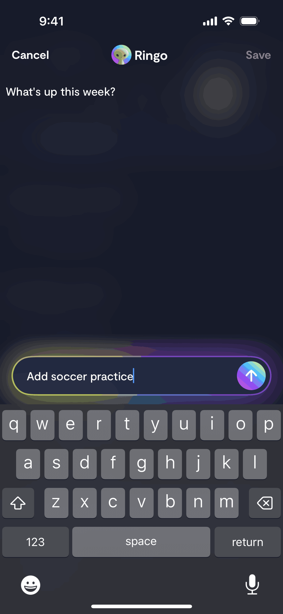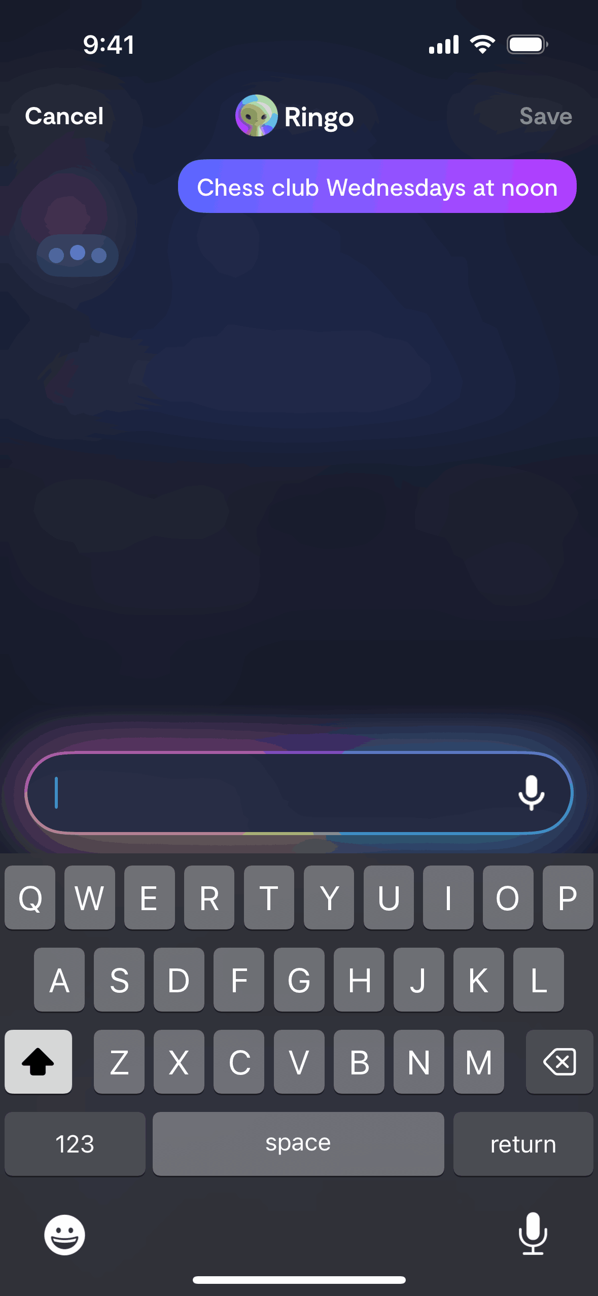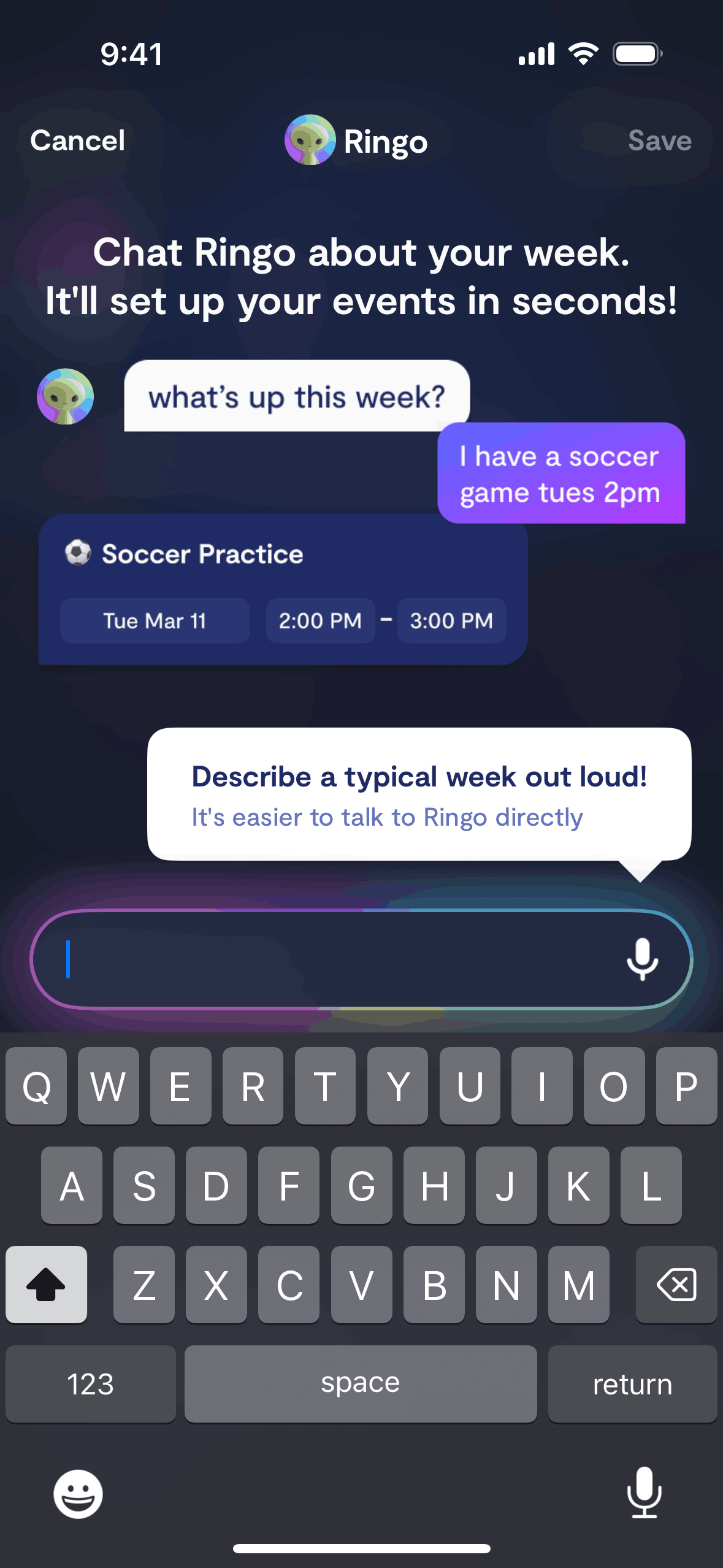 The user adds an event by voice or text input. The app confirms the event and offers recurrence options.