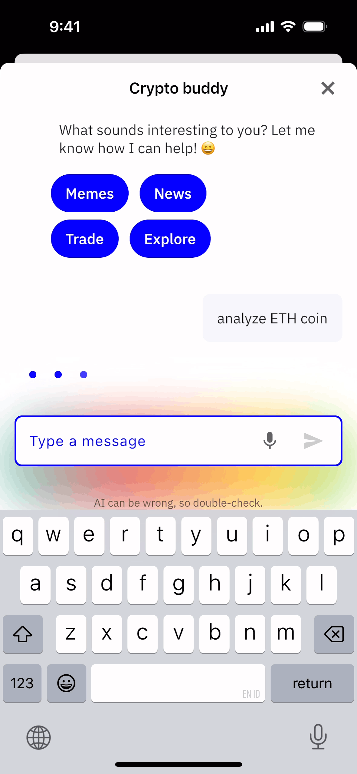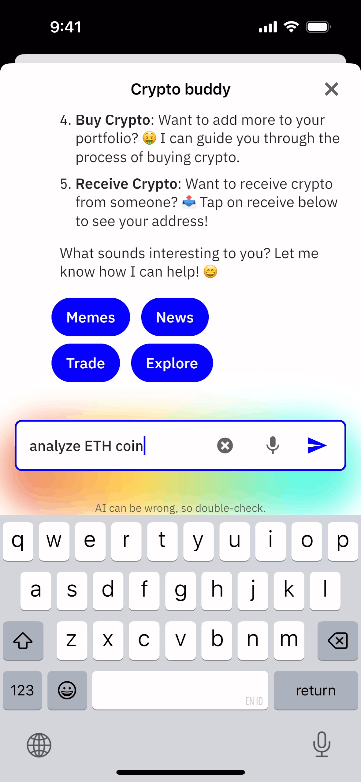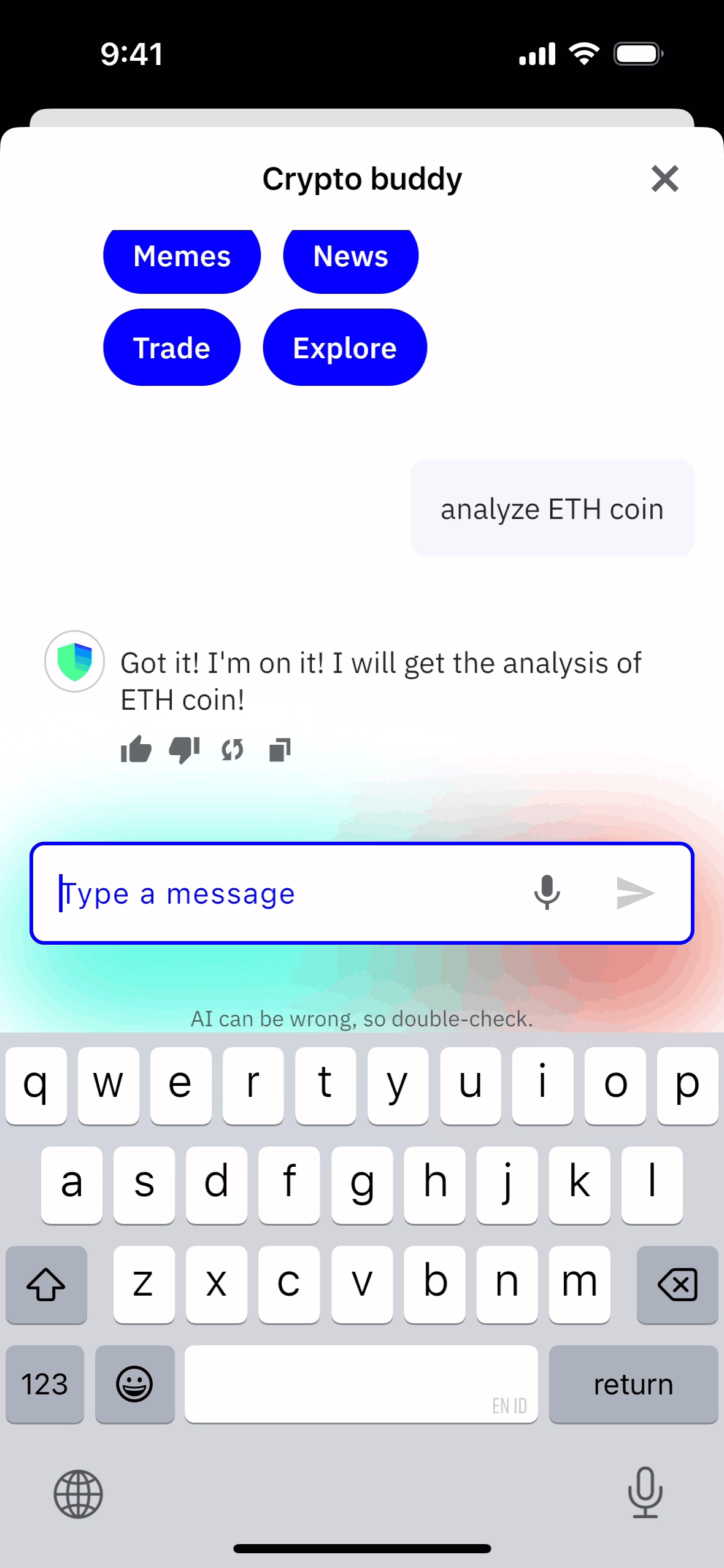The user interacts with a Crypto buddy AI assistant. The user requests analysis of ETH coin and the AI confirms the request.