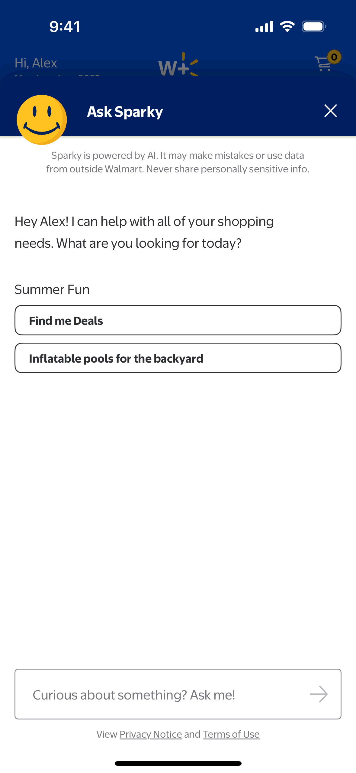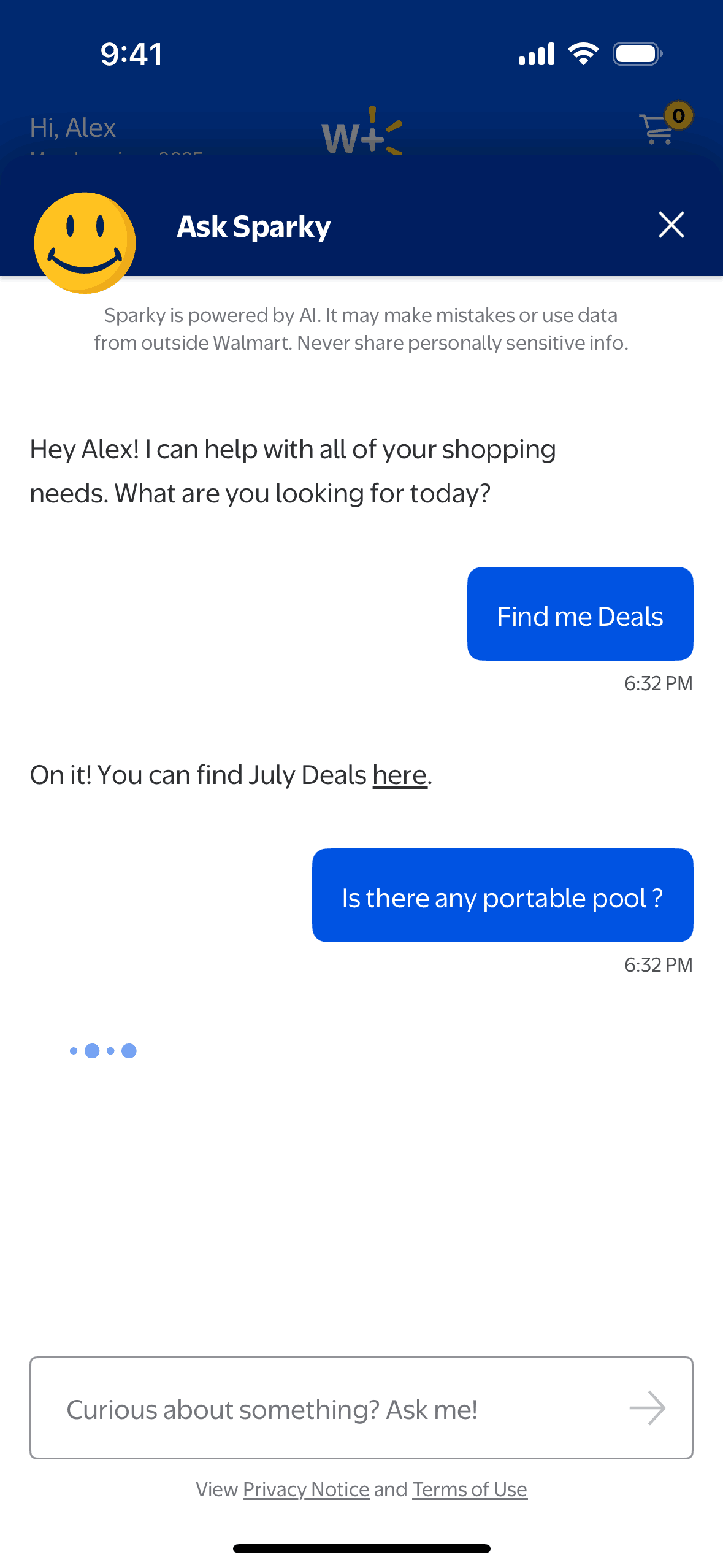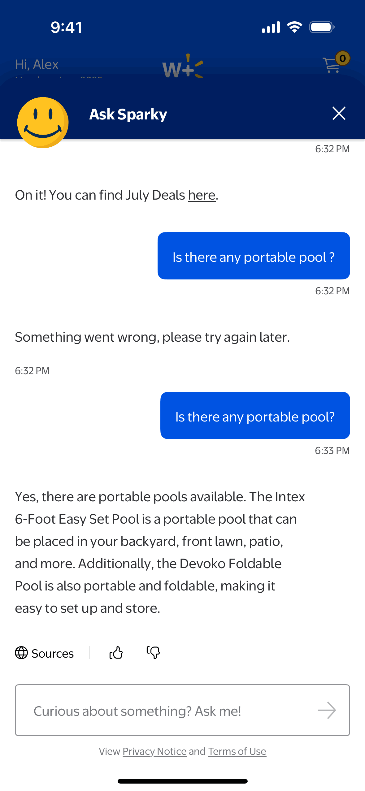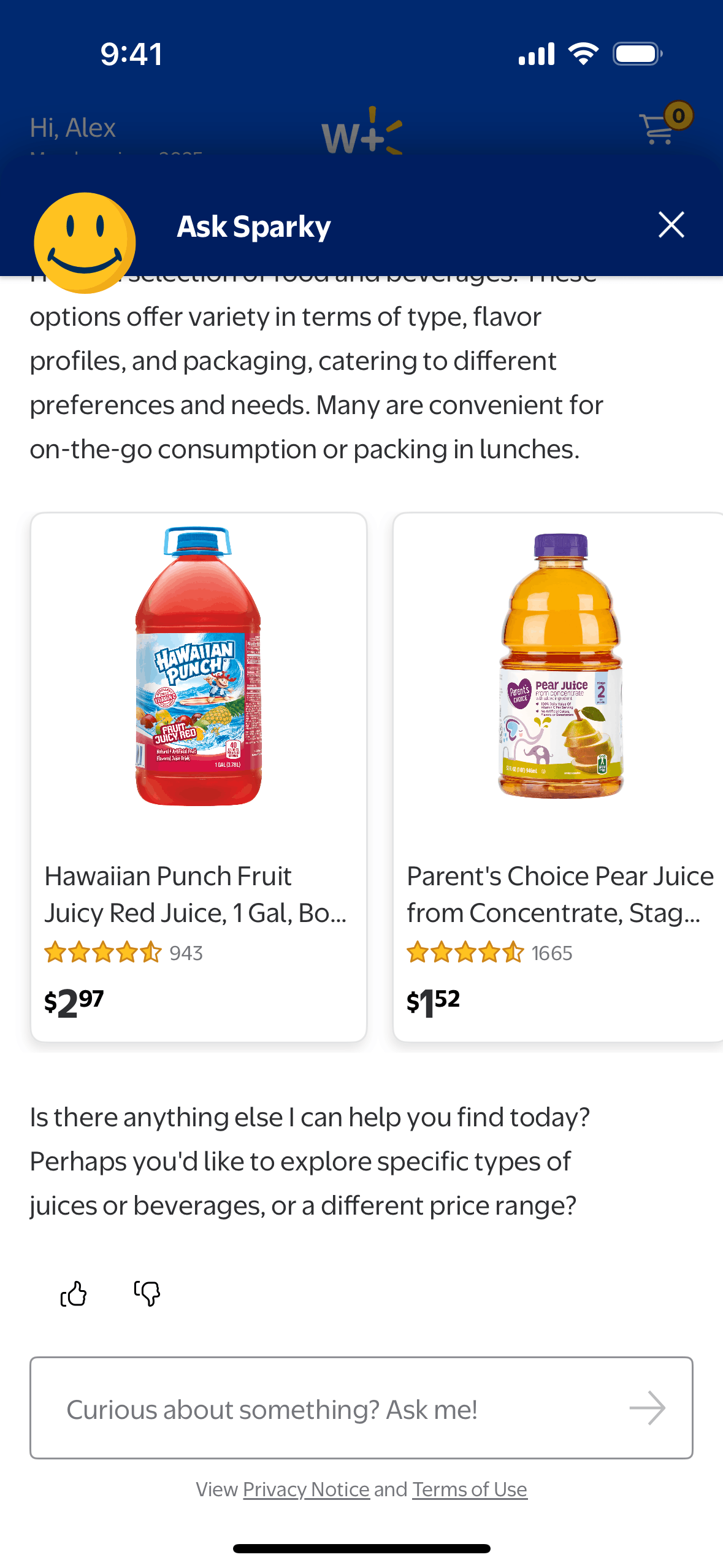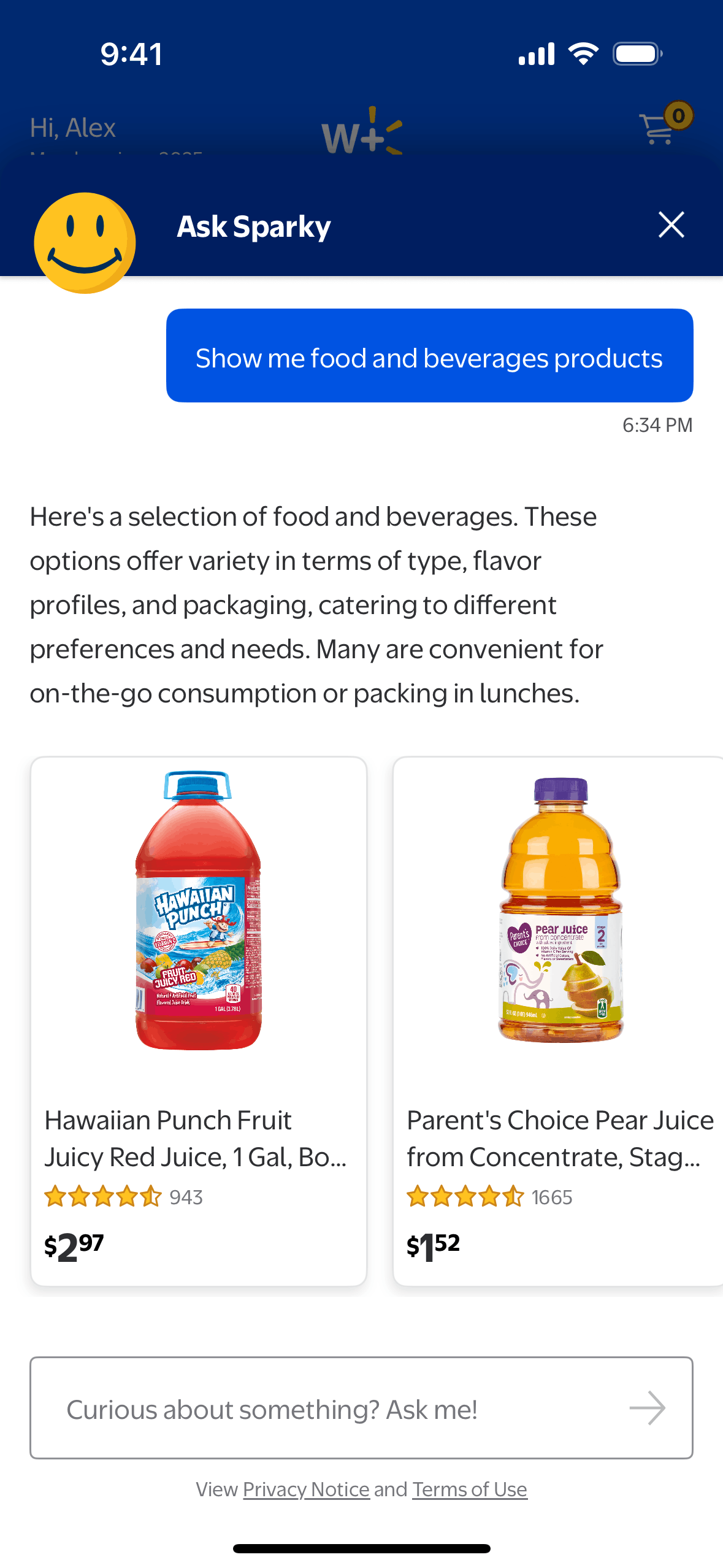 The user interacts with the "Ask Sparky" AI assistant to find deals, ask questions about products, and receive suggestions. Sparky provides responses and follow-up questions to refine the search.