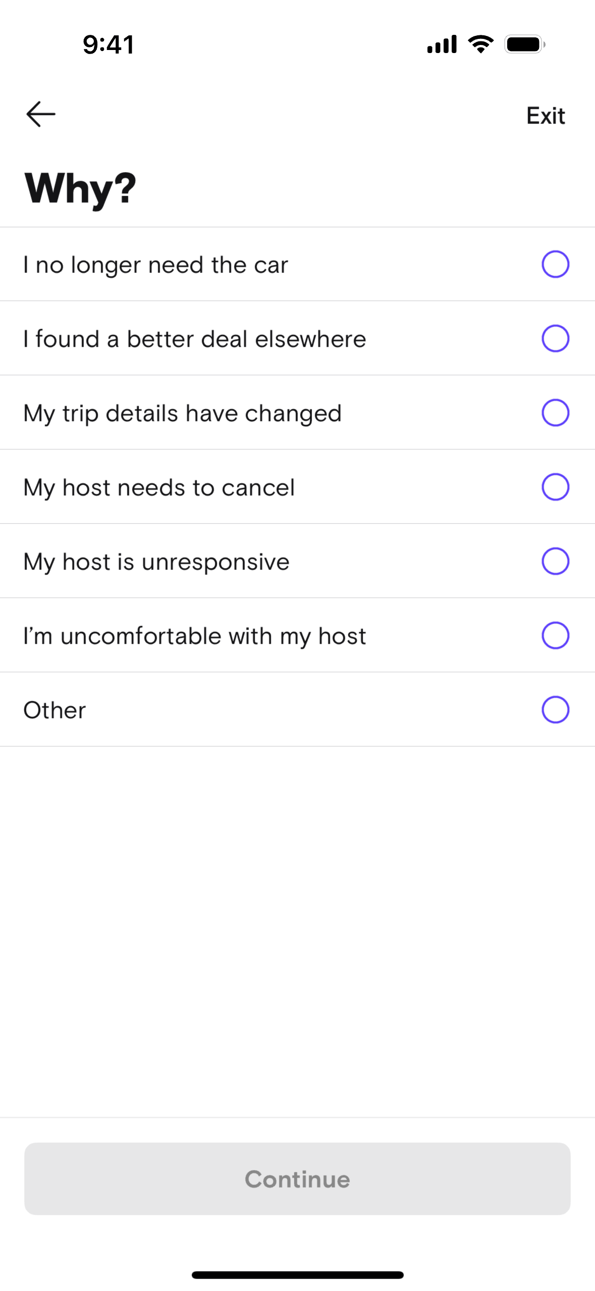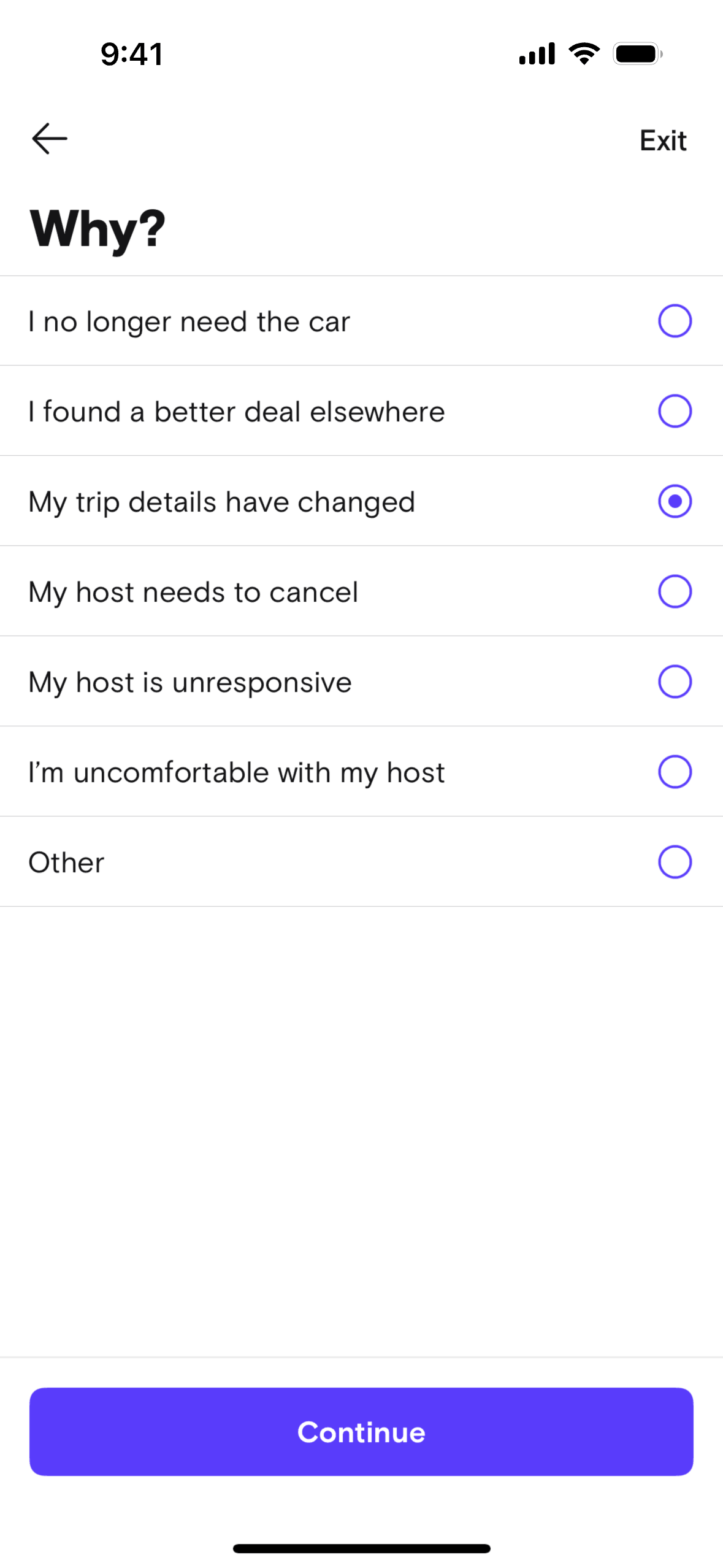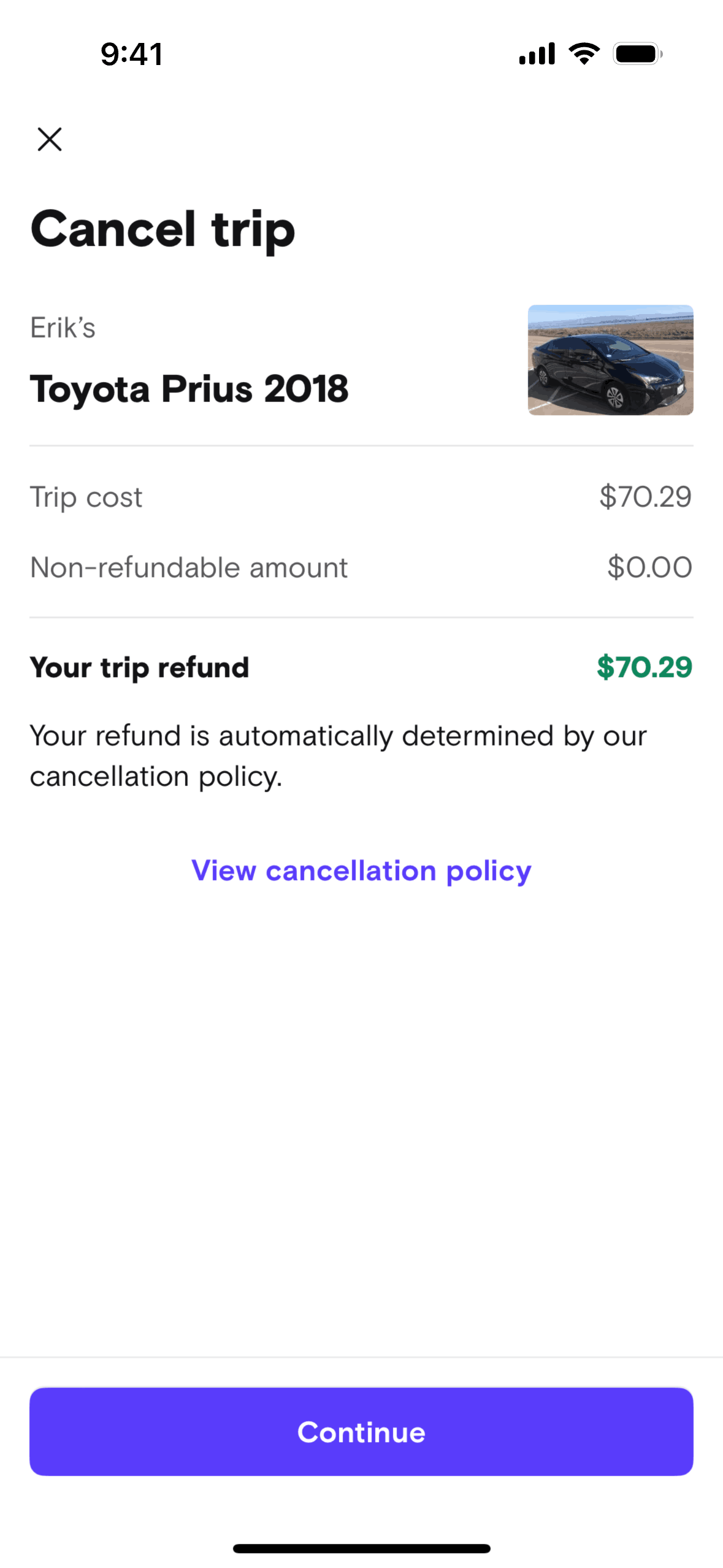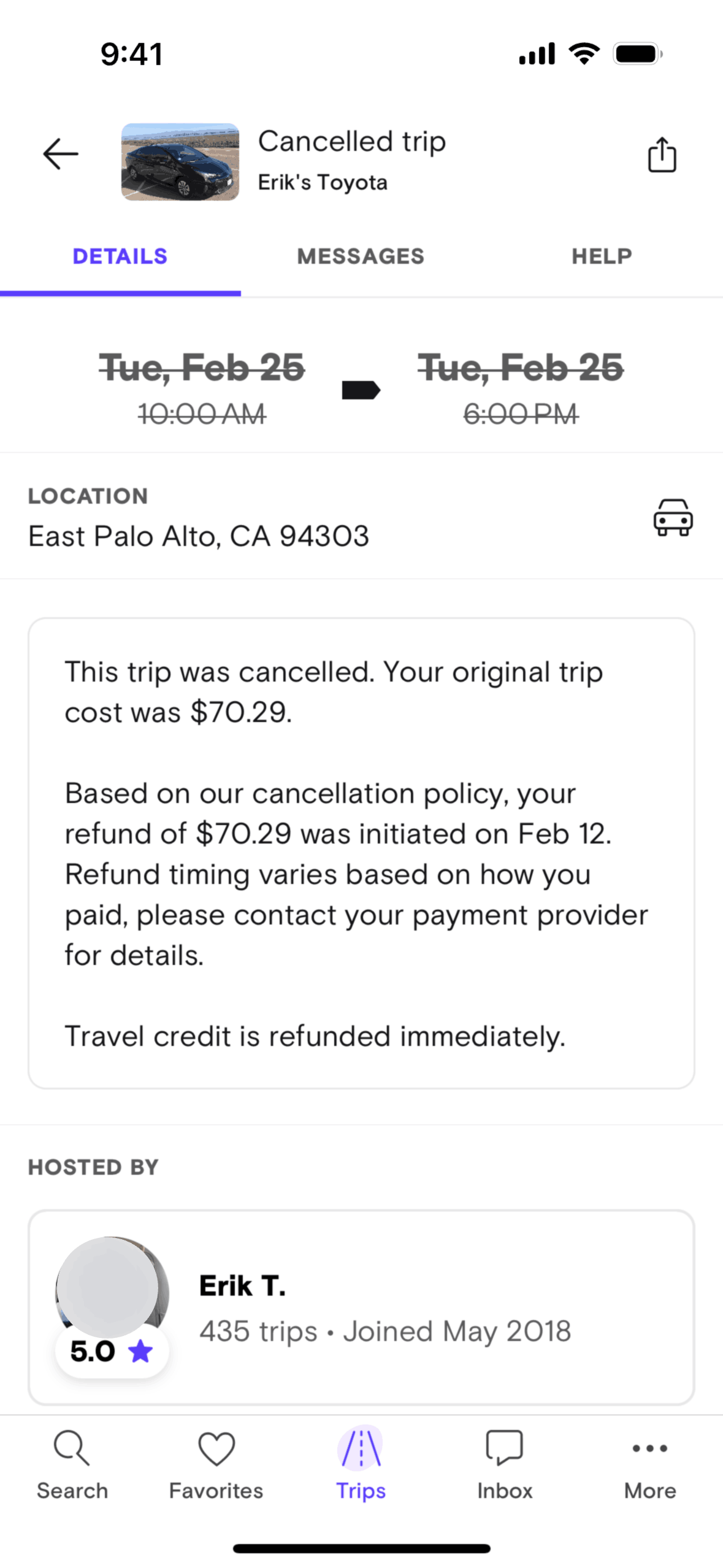 The user cancels a booked trip by providing a reason, messaging the host, and selecting a refund option. The flow concludes with a cancellation confirmation.