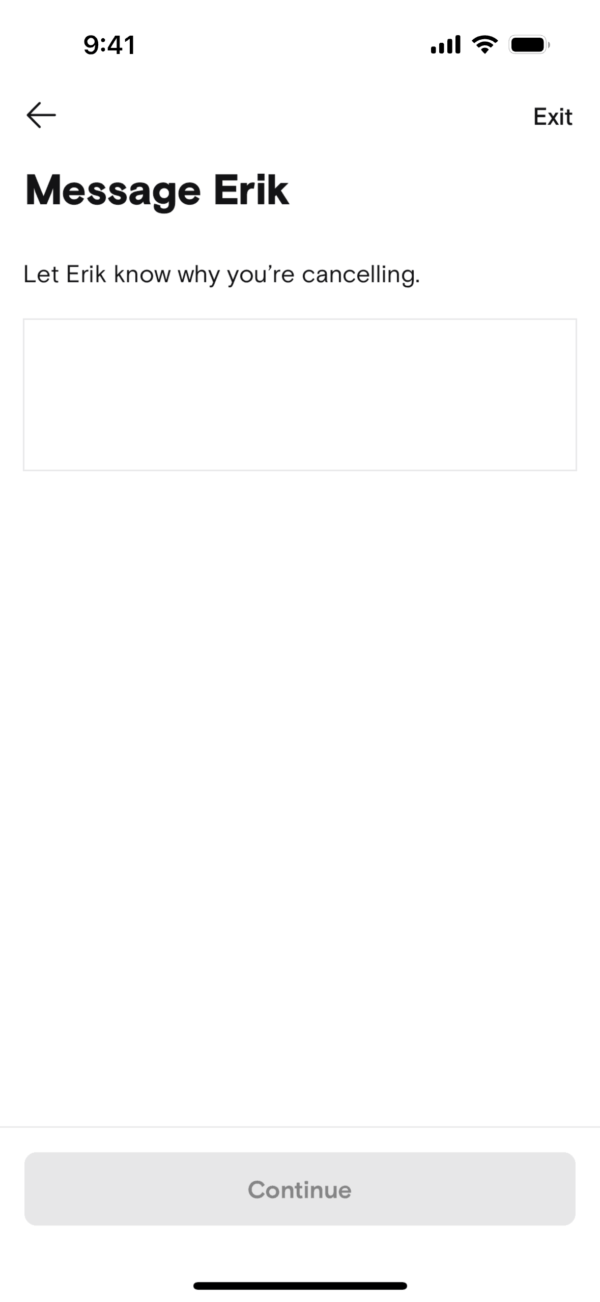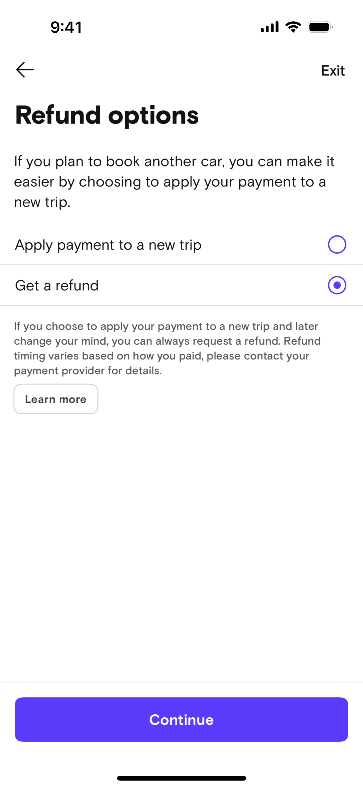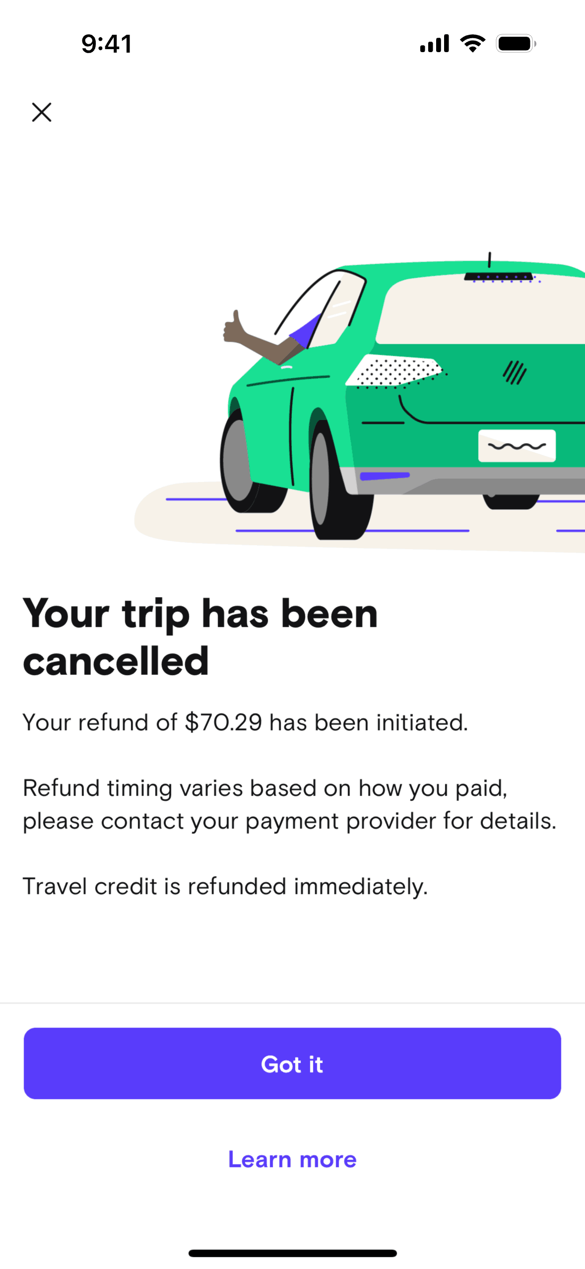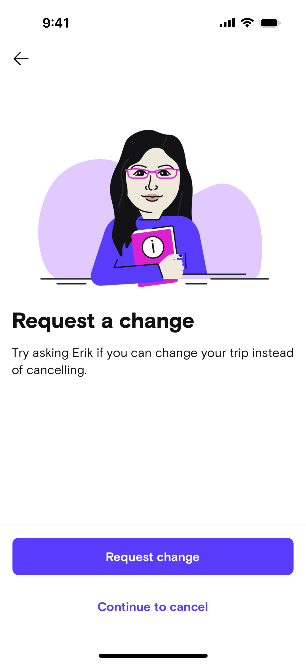 The user cancels a booked trip by providing a reason, messaging the host, and selecting a refund option. The flow concludes with a cancellation confirmation.