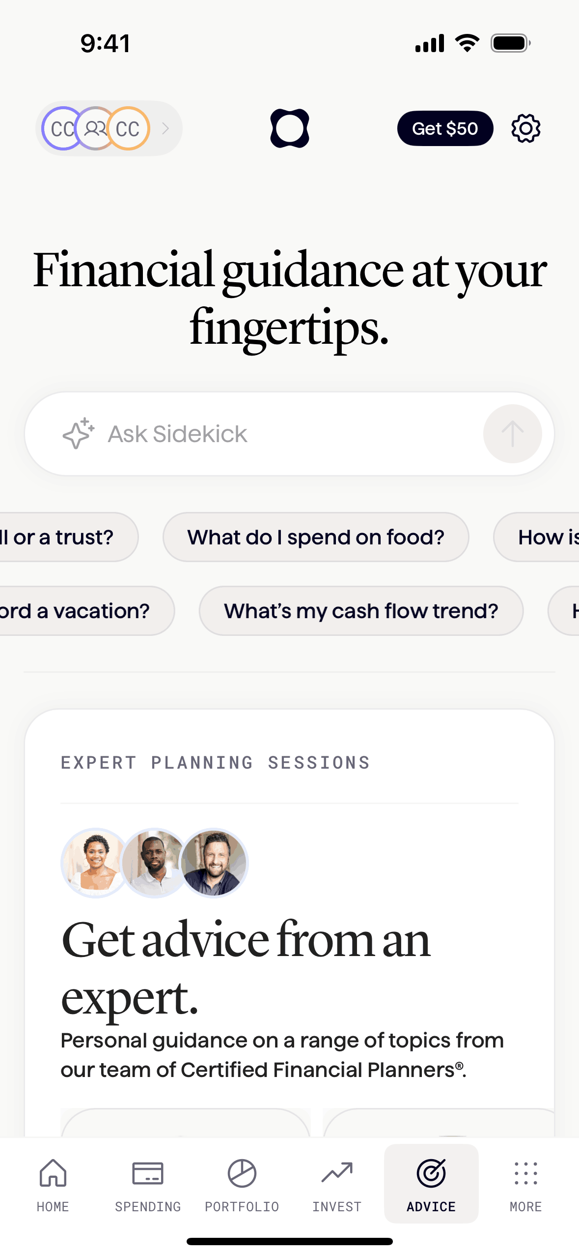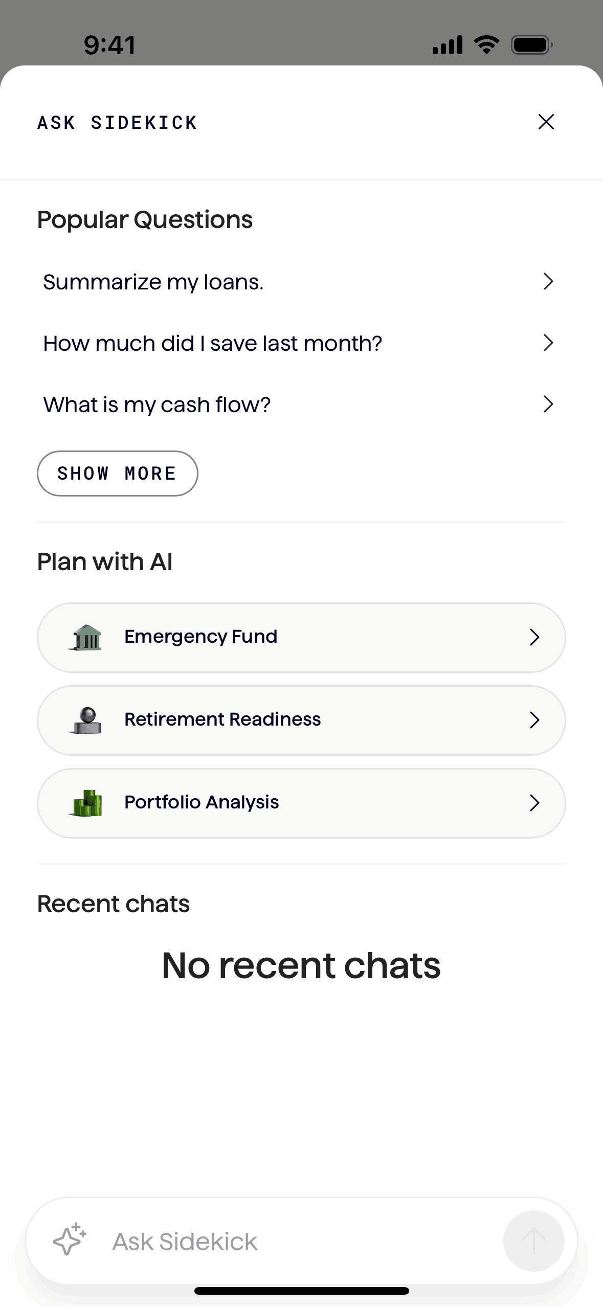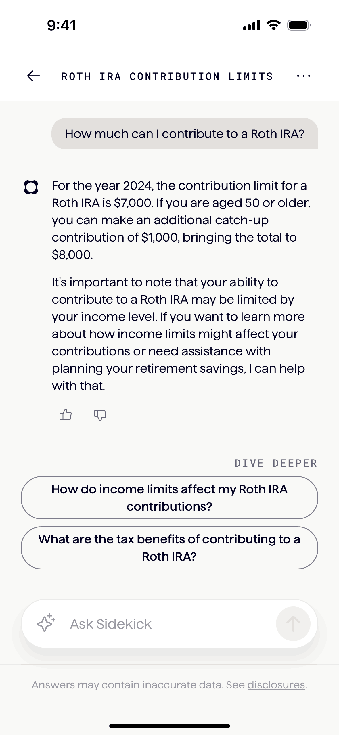 The user interacts with an AI assistant, Sidekick, to get financial advice. They ask a question about Roth IRA contributions and receive a detailed response.