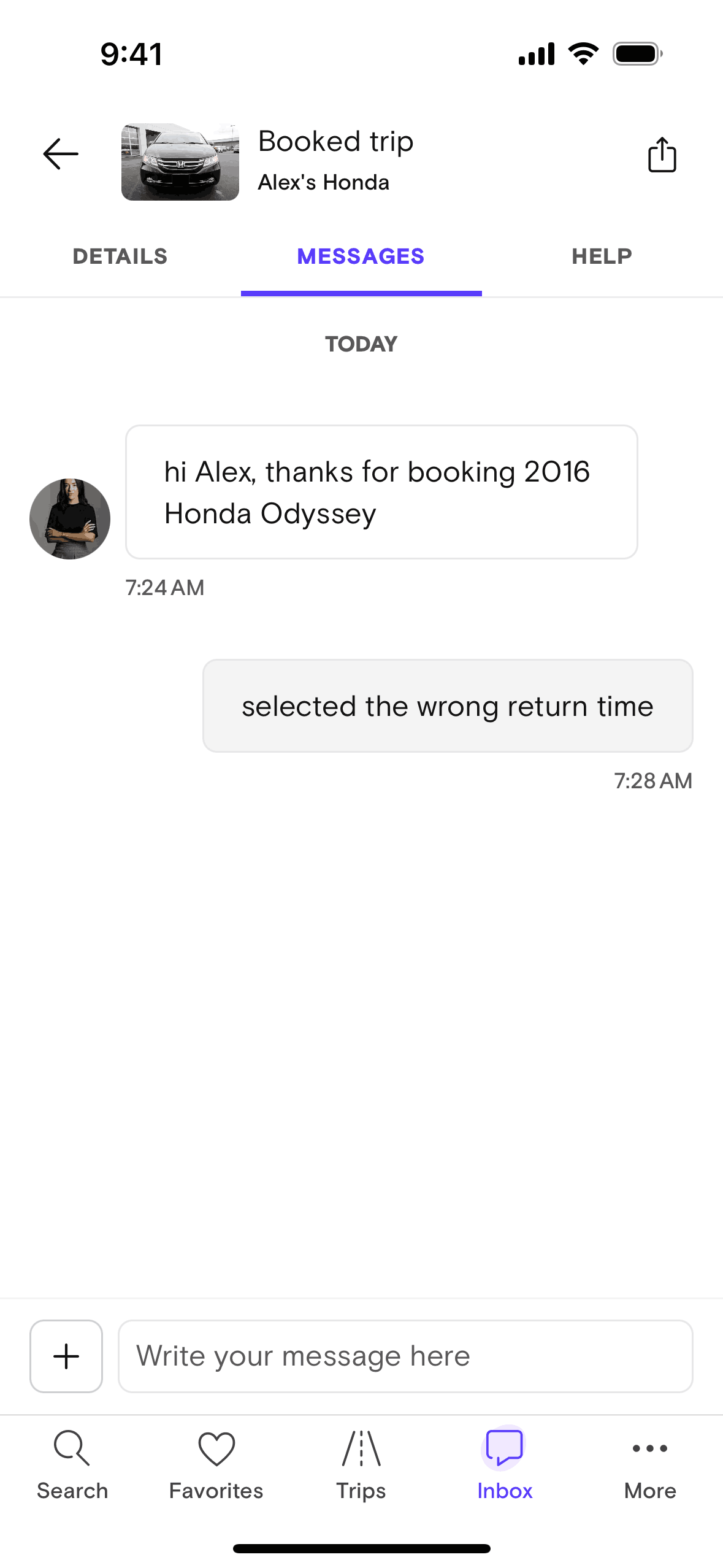 The user navigates to a message thread, composes a message, and sends it. The final screen confirms the message was successfully sent.