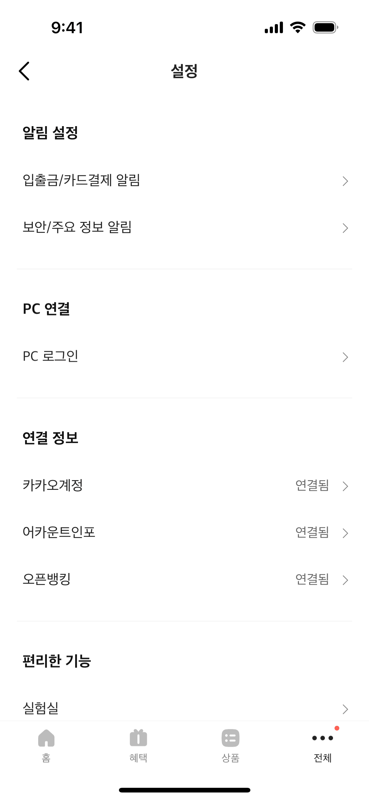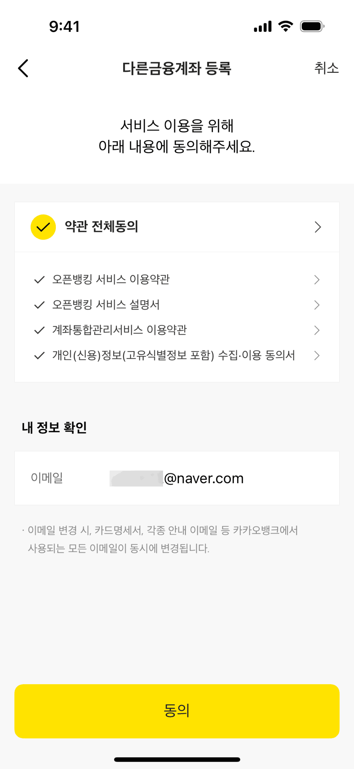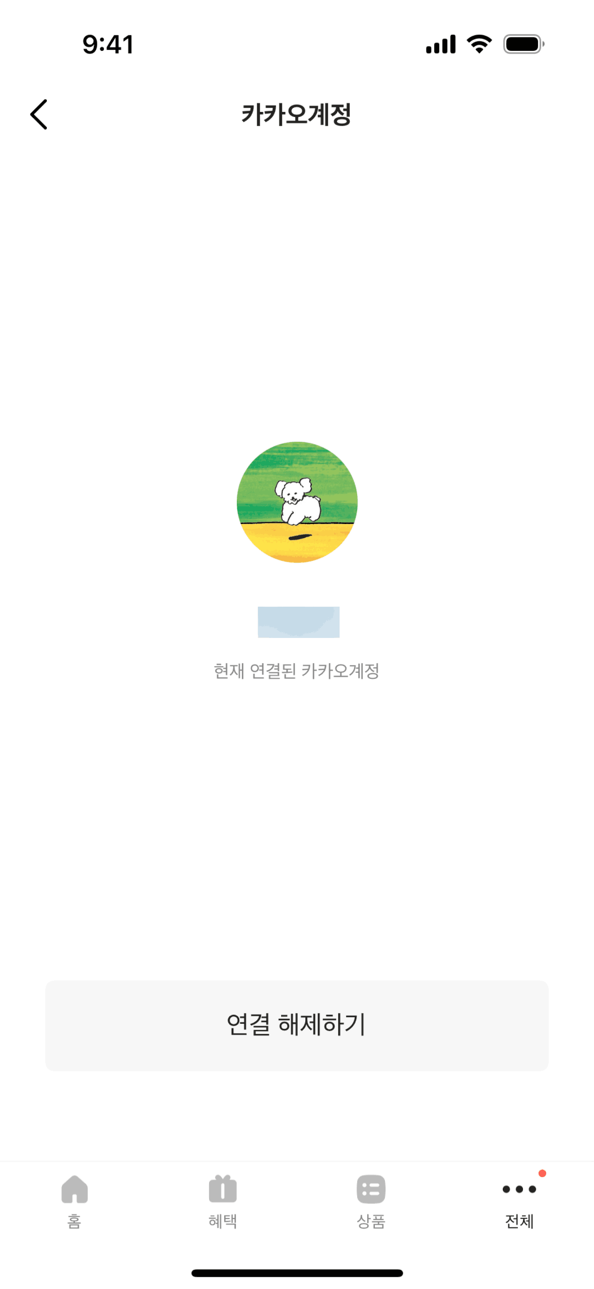 The user navigates through settings to connect their Kakao account. After connecting, the user is presented with the option to disconnect.