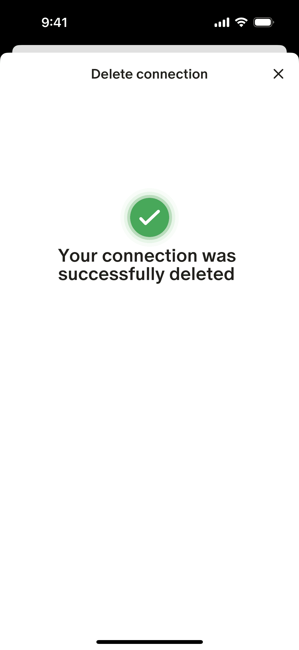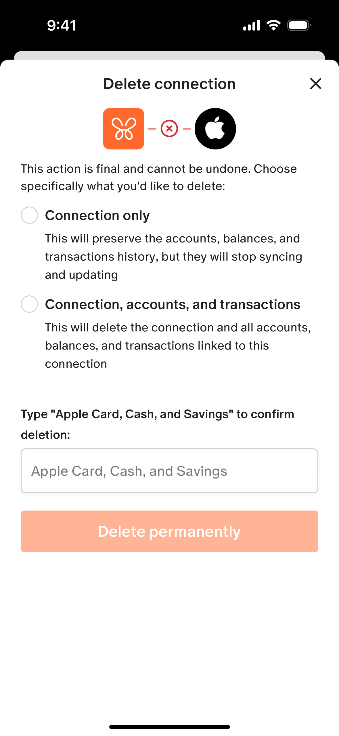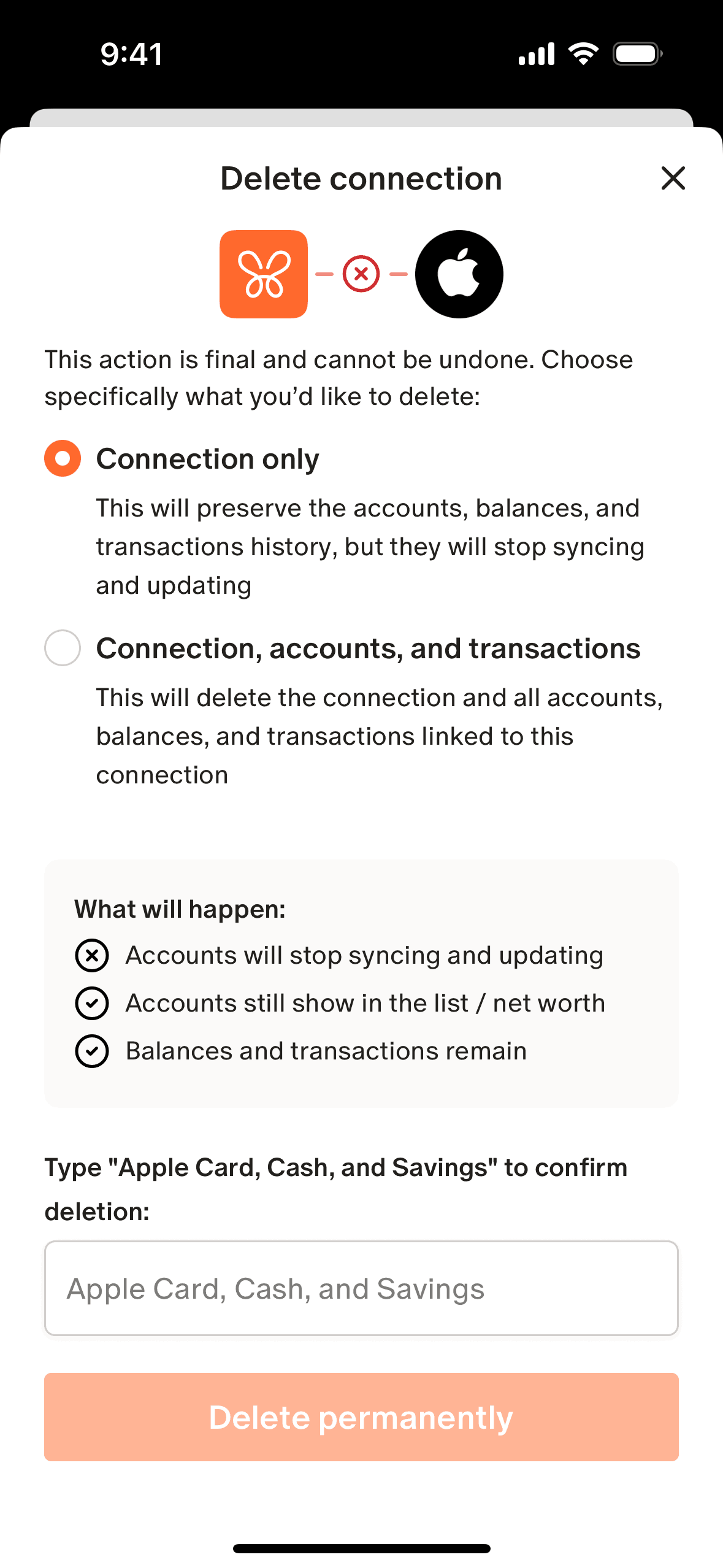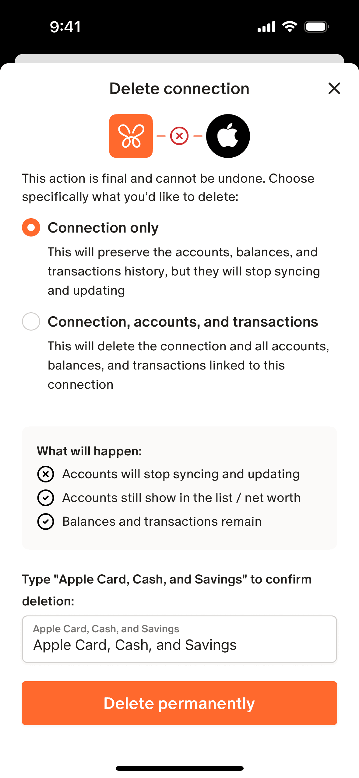 The user flow demonstrates deleting an account connection. It involves navigating to settings, confirming the deletion scope, and verifying the action.