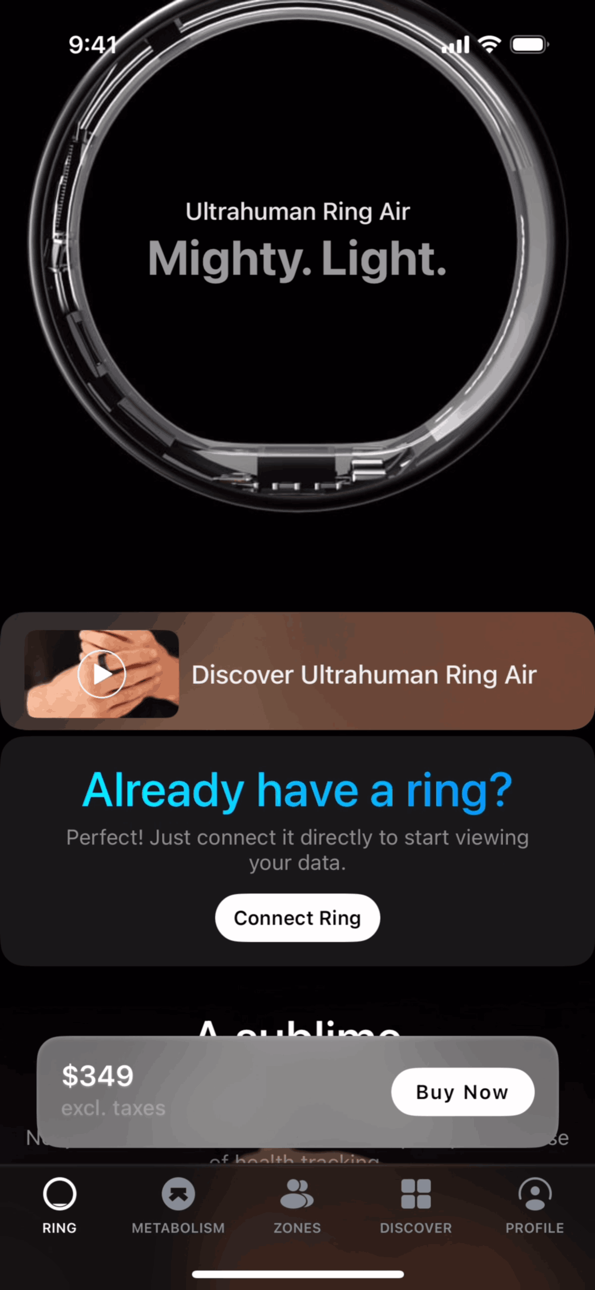 The user connects an existing Ultrahuman ring by logging in, following setup instructions, and providing personal information to reach the main dashboard.