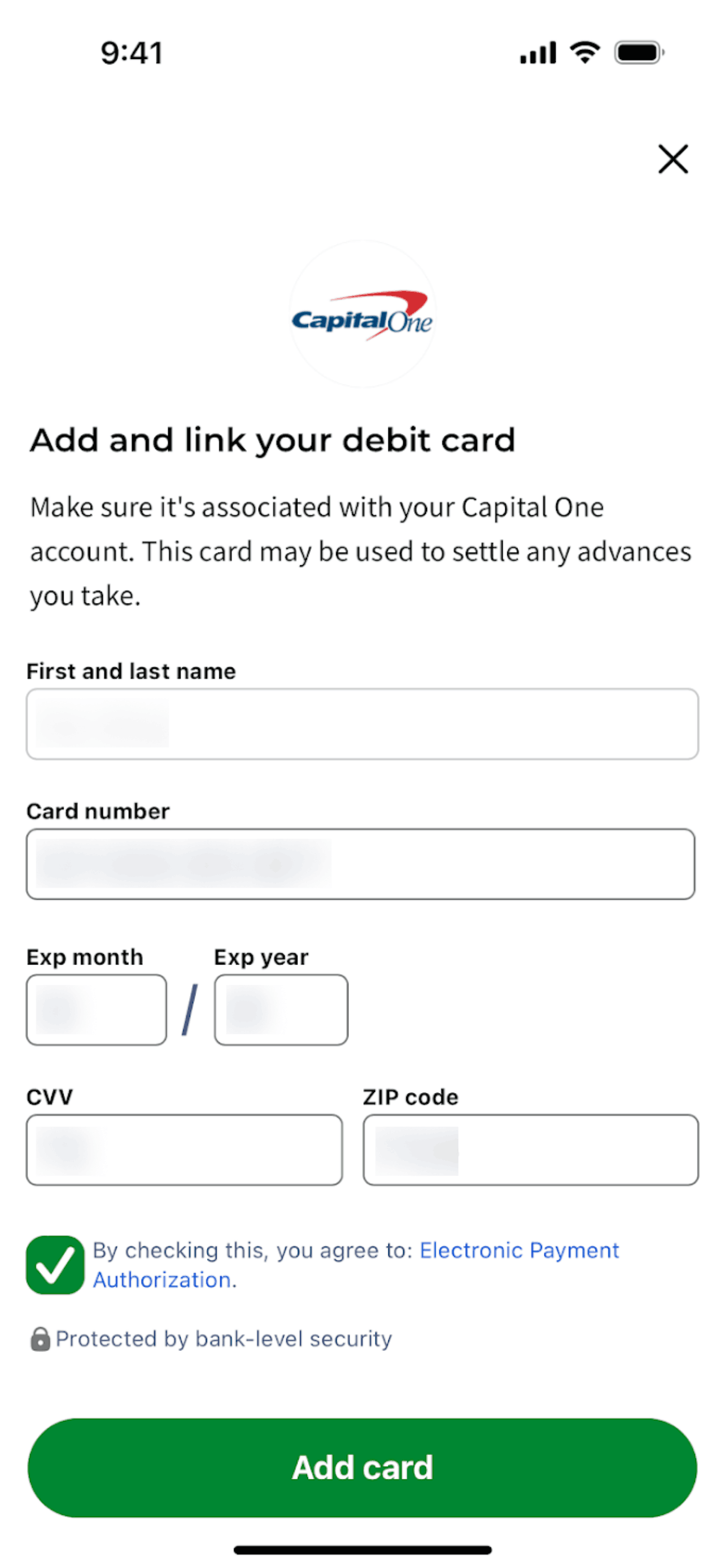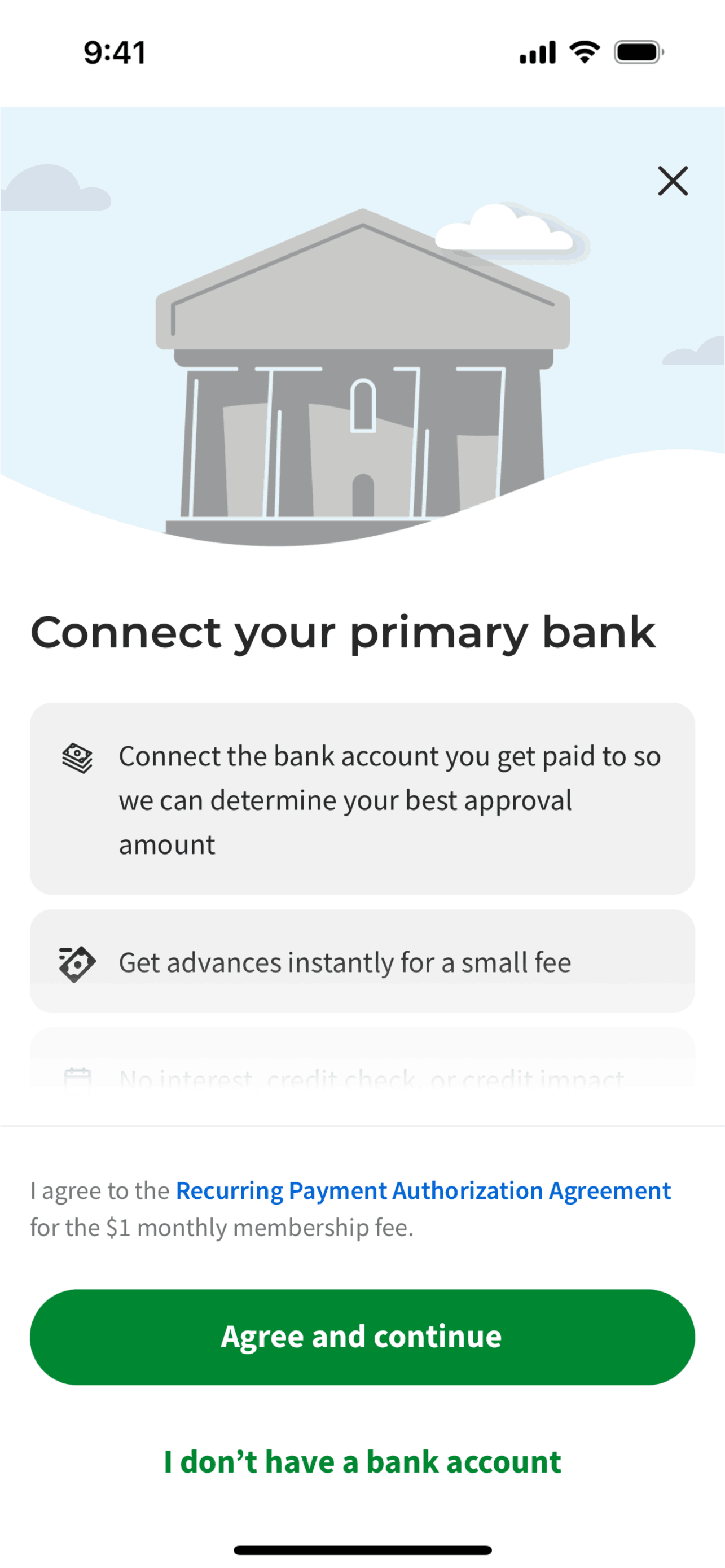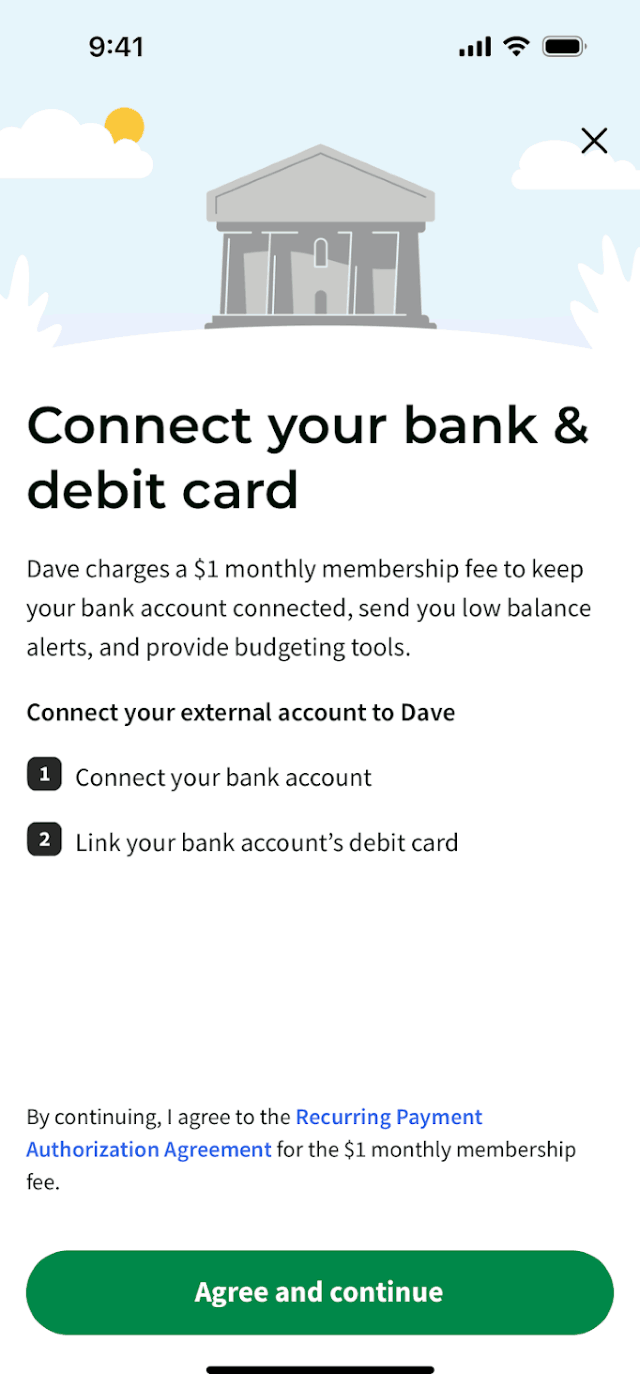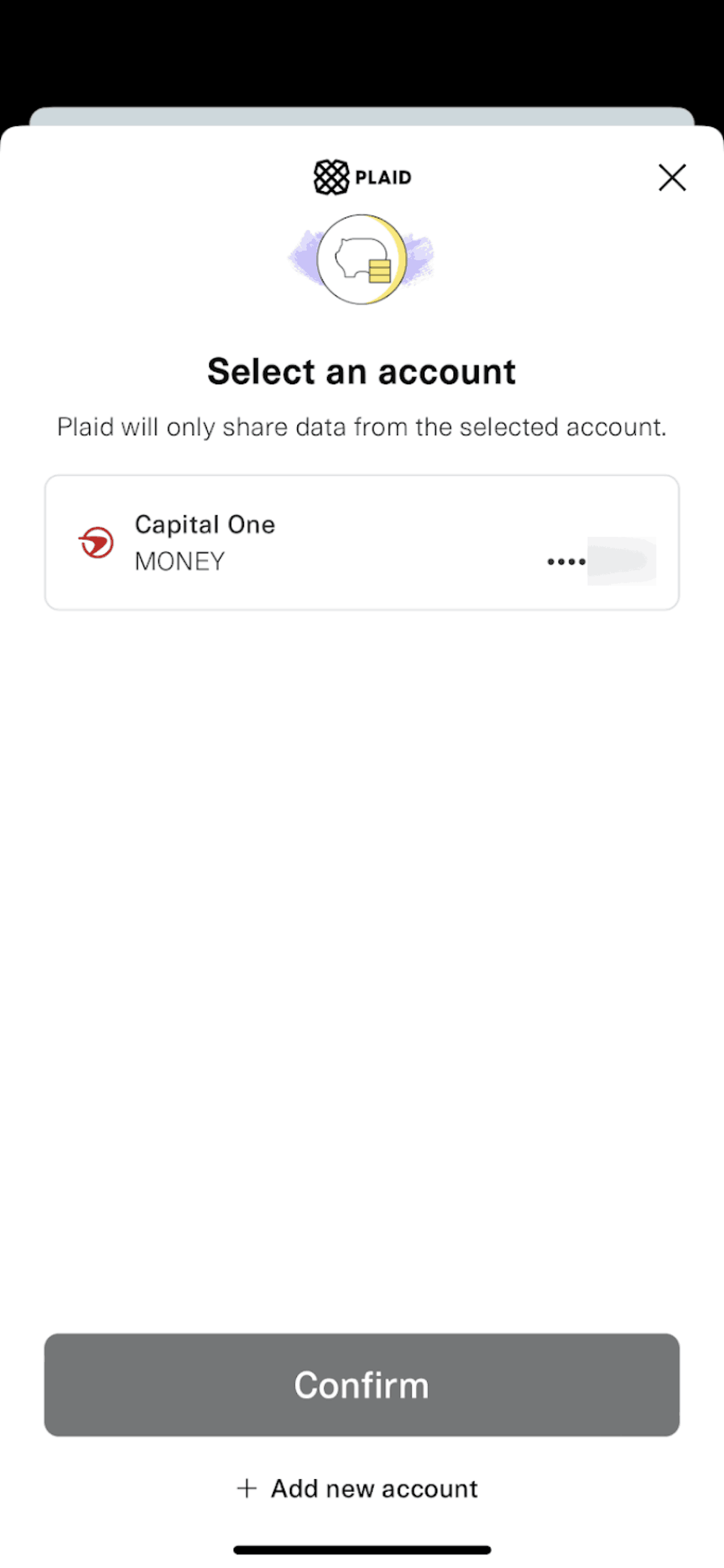 The user connects their bank account to the app. They navigate from the dashboard, authenticate with their bank, and return to the dashboard with the connected account.