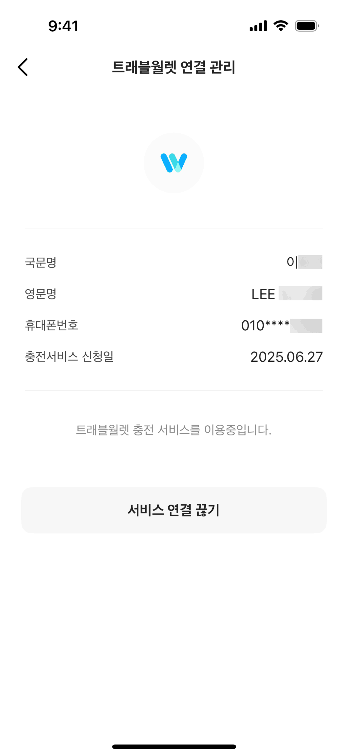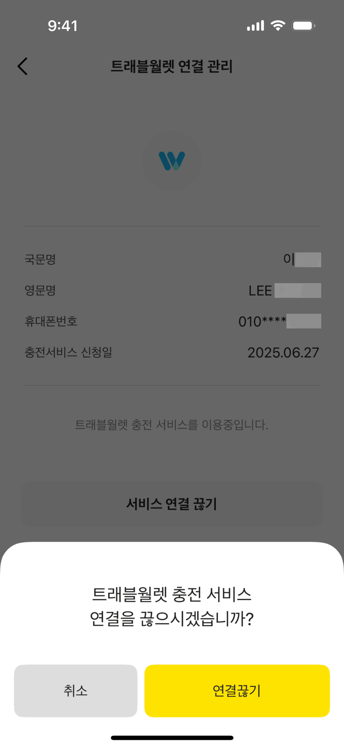 The user disconnects their Travel Wallet. The flow involves navigating to the connection management screen, confirming the disconnection, and receiving a confirmation message.