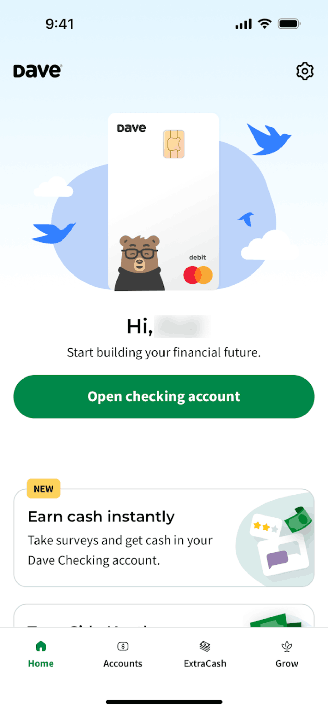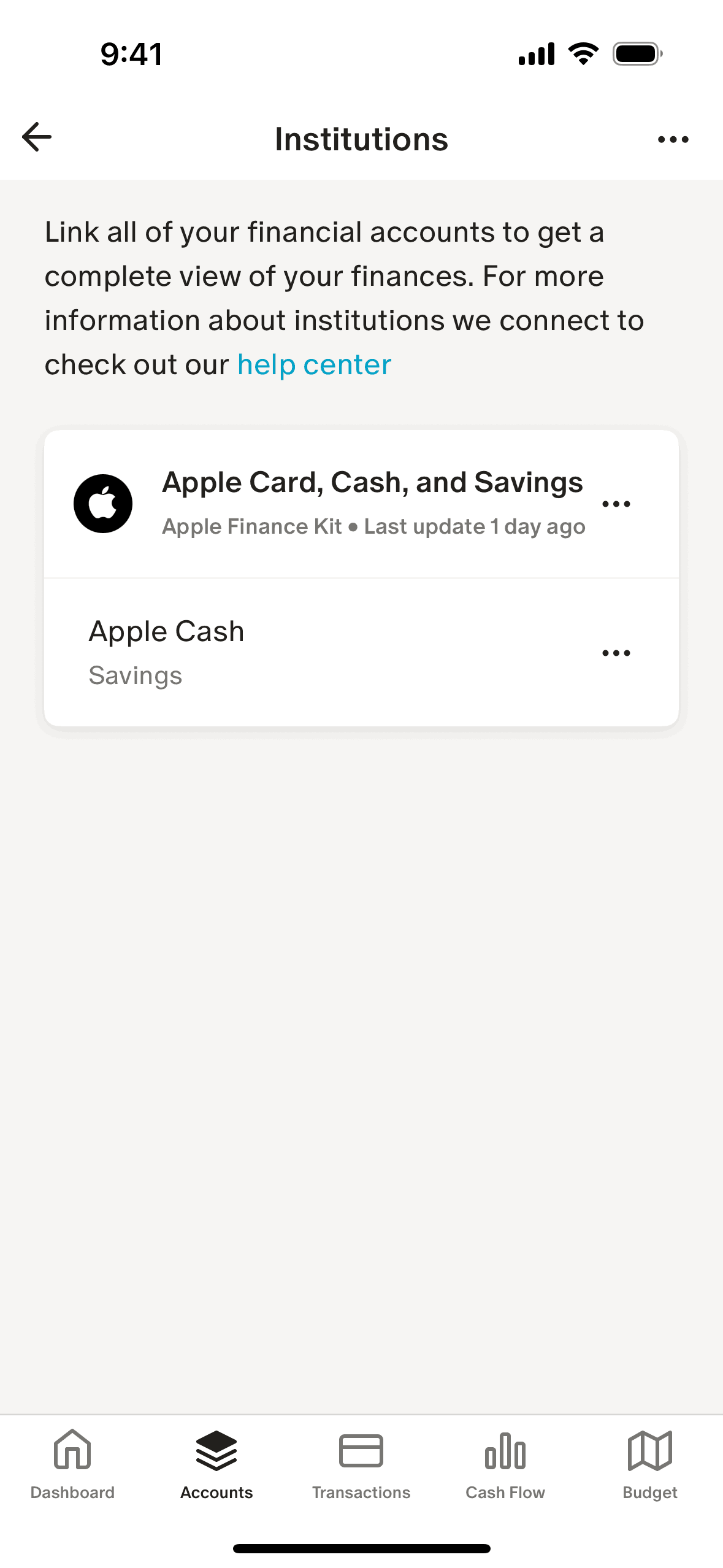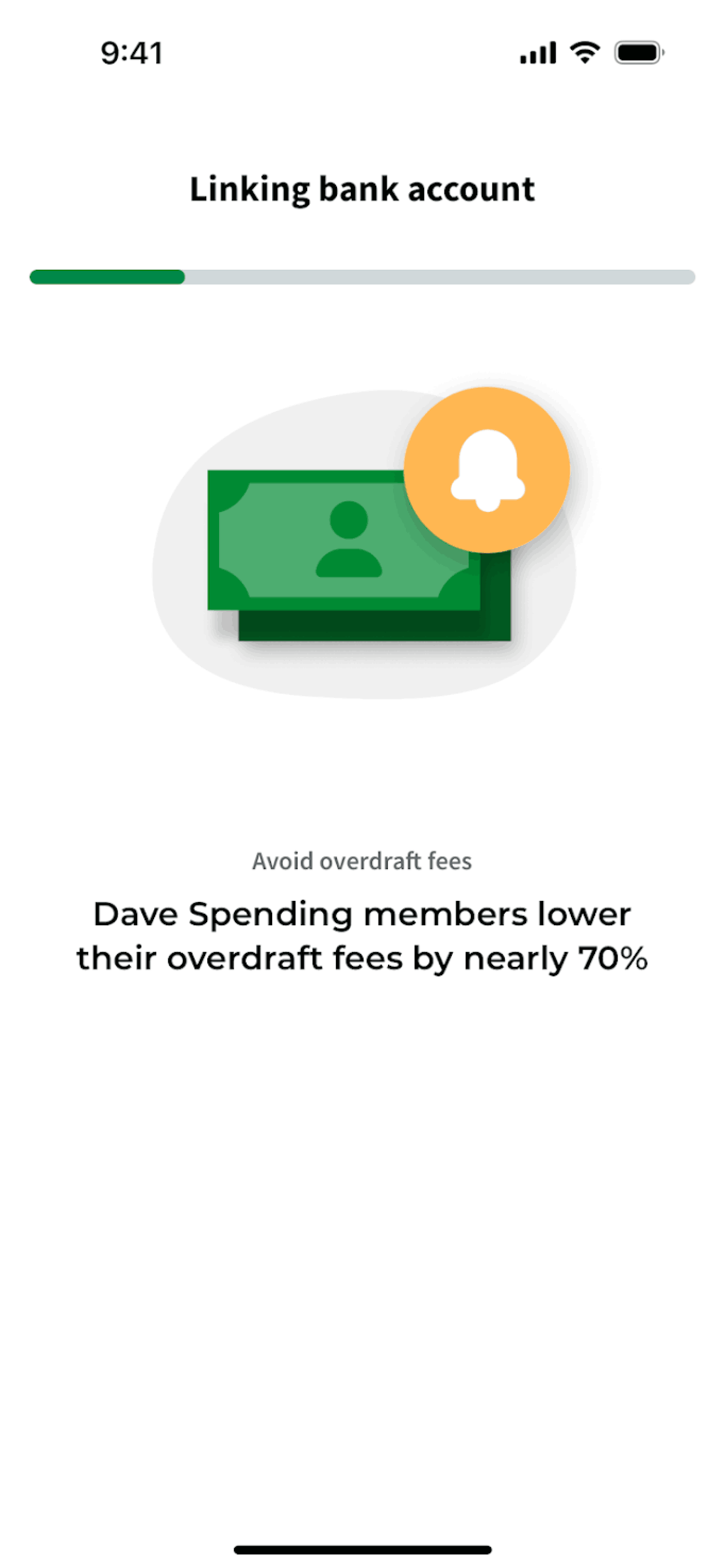 The user connects their bank account, configures notifications, and views the updated account on the dashboard. The flow guides the user through the account connection process.