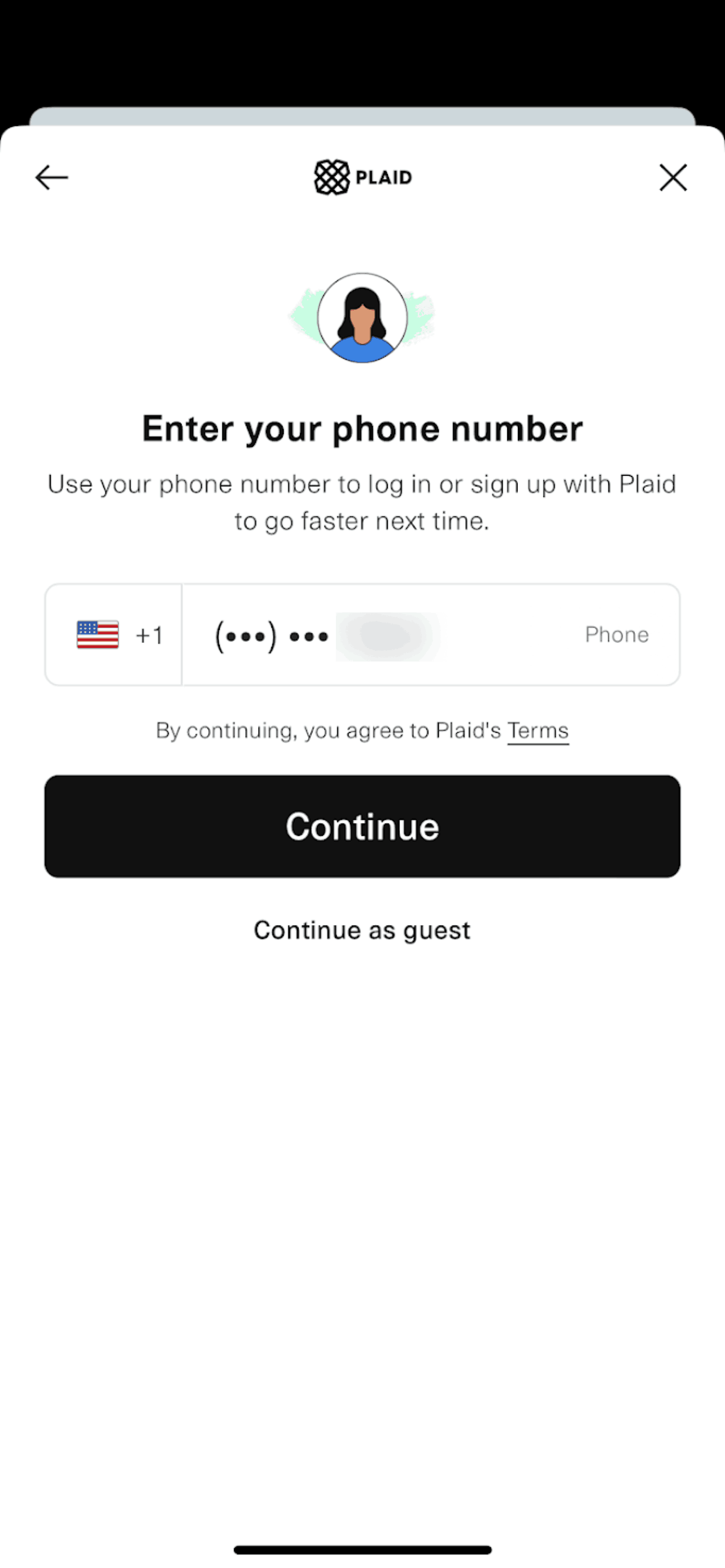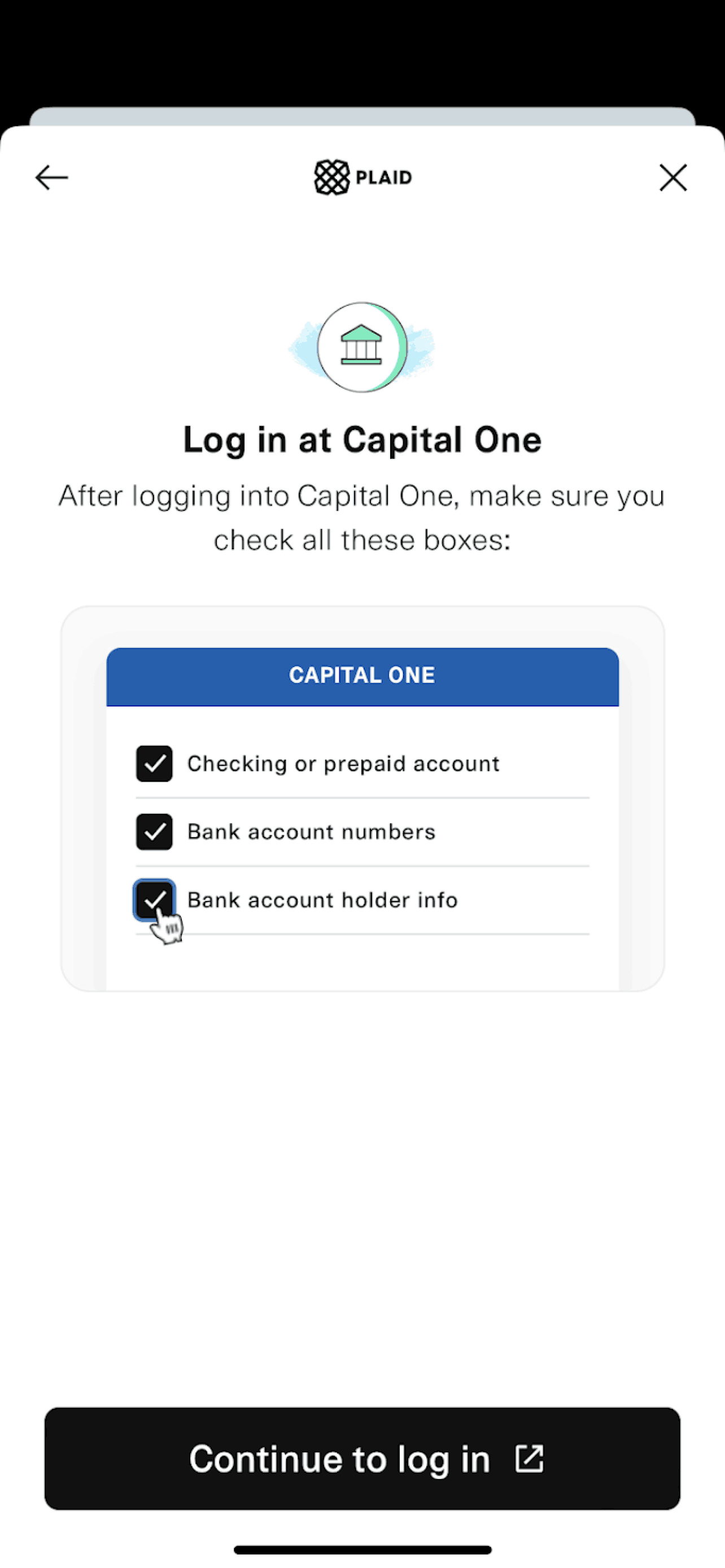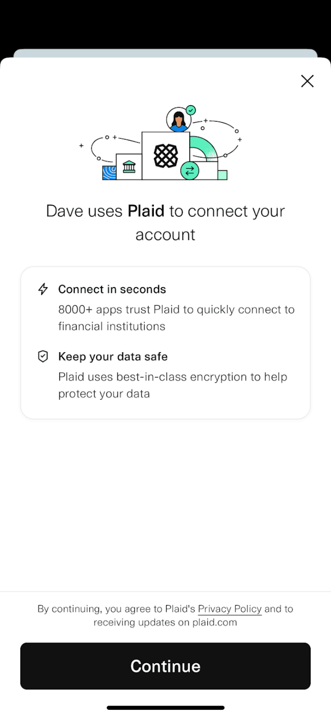 The user flow guides the user to connect their bank account and debit card through Plaid. It ends with the user on the application home screen.