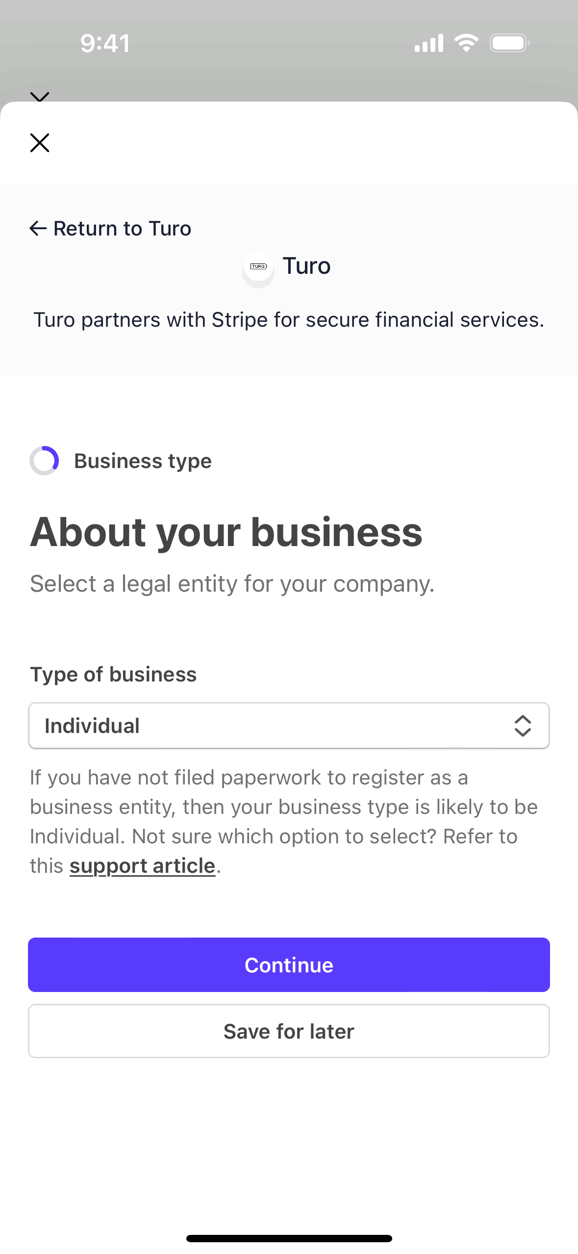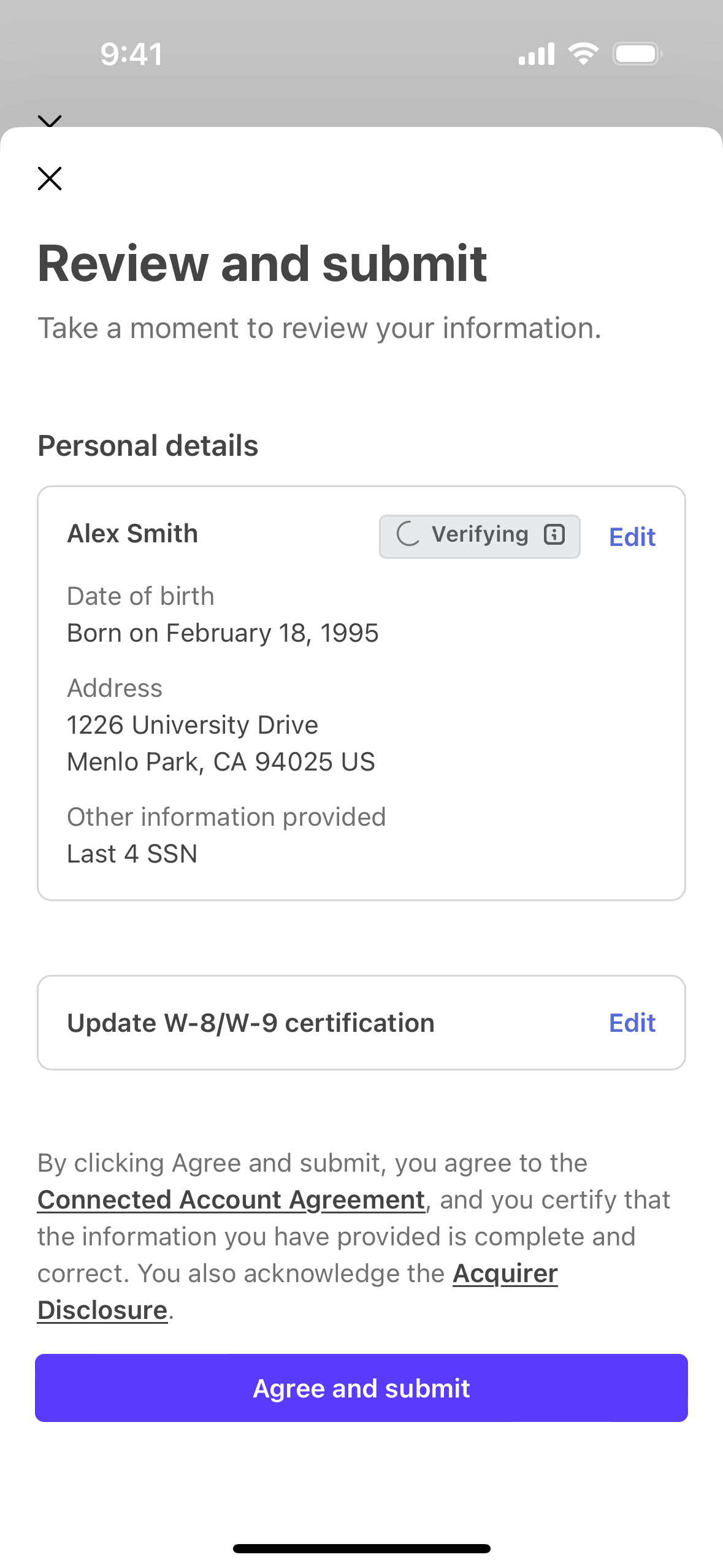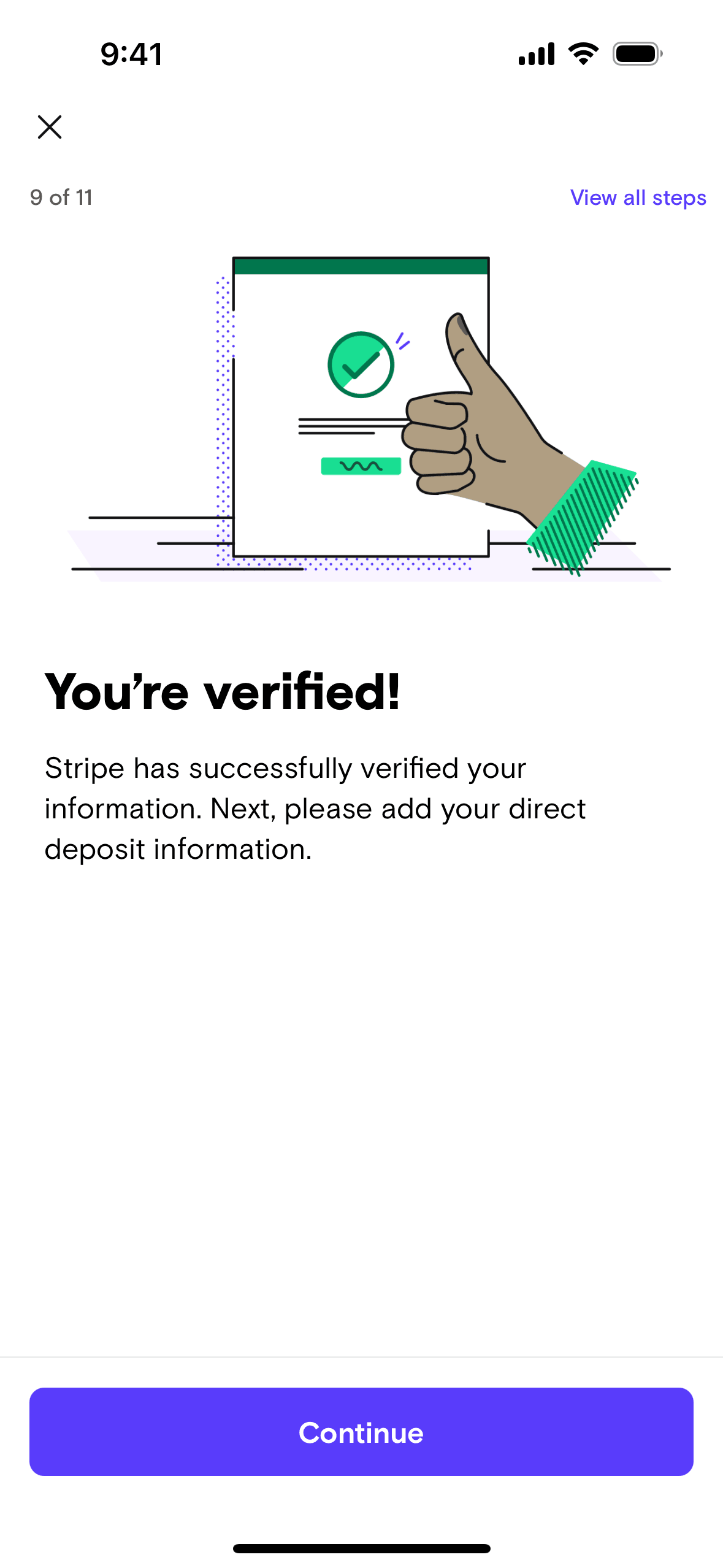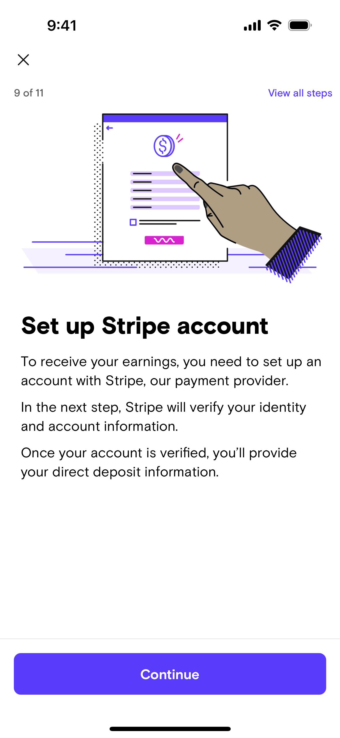 The user flow guides a user through connecting to Stripe. It involves providing necessary information and awaiting verification.