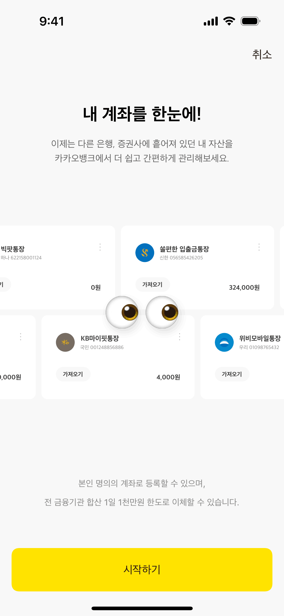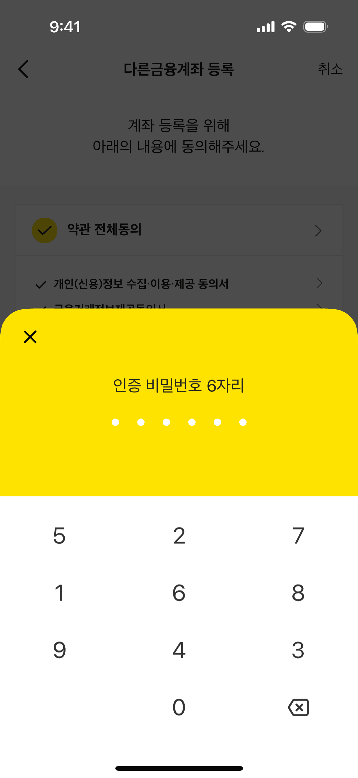 The user links external bank accounts by agreeing to terms, selecting accounts, and entering a PIN. The flow concludes with a registration confirmation.