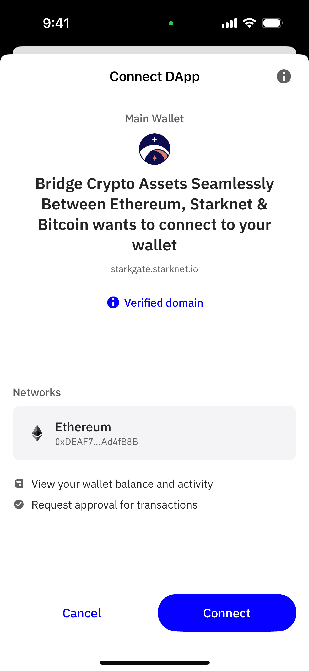 The user navigates through settings to connect a DApp. They authorize the connection and view it in their DApp connection list.