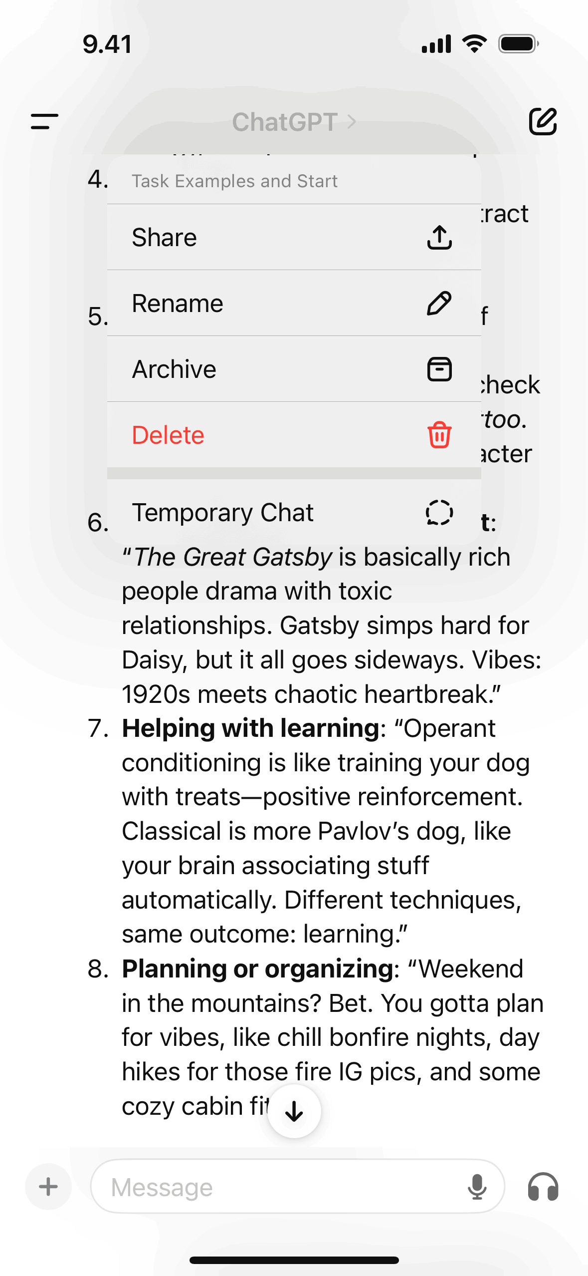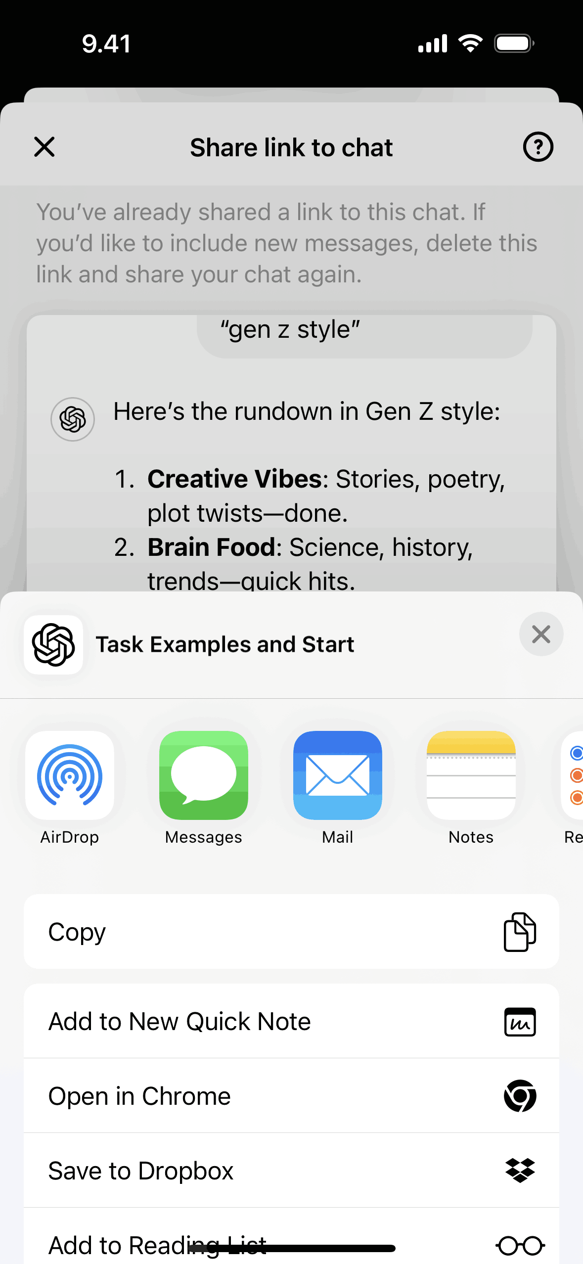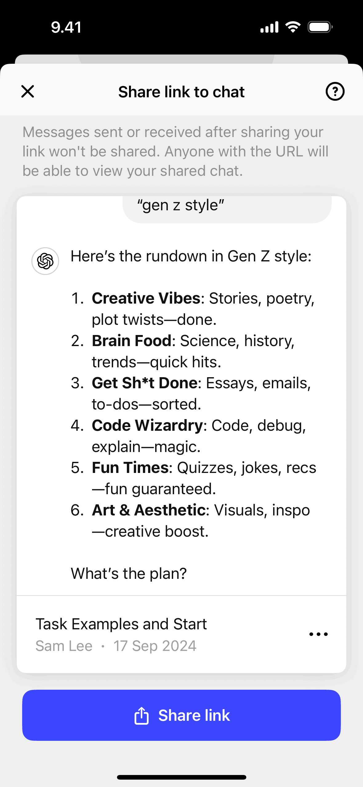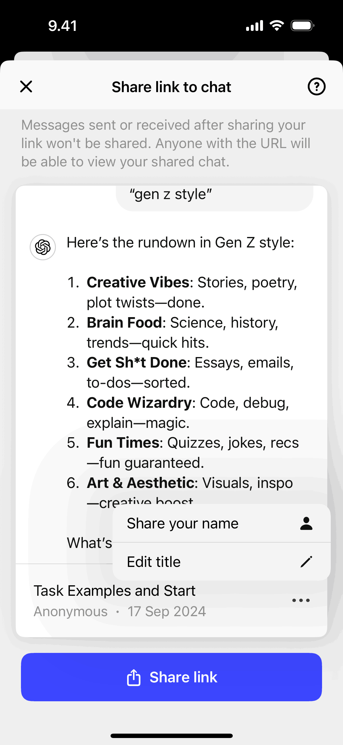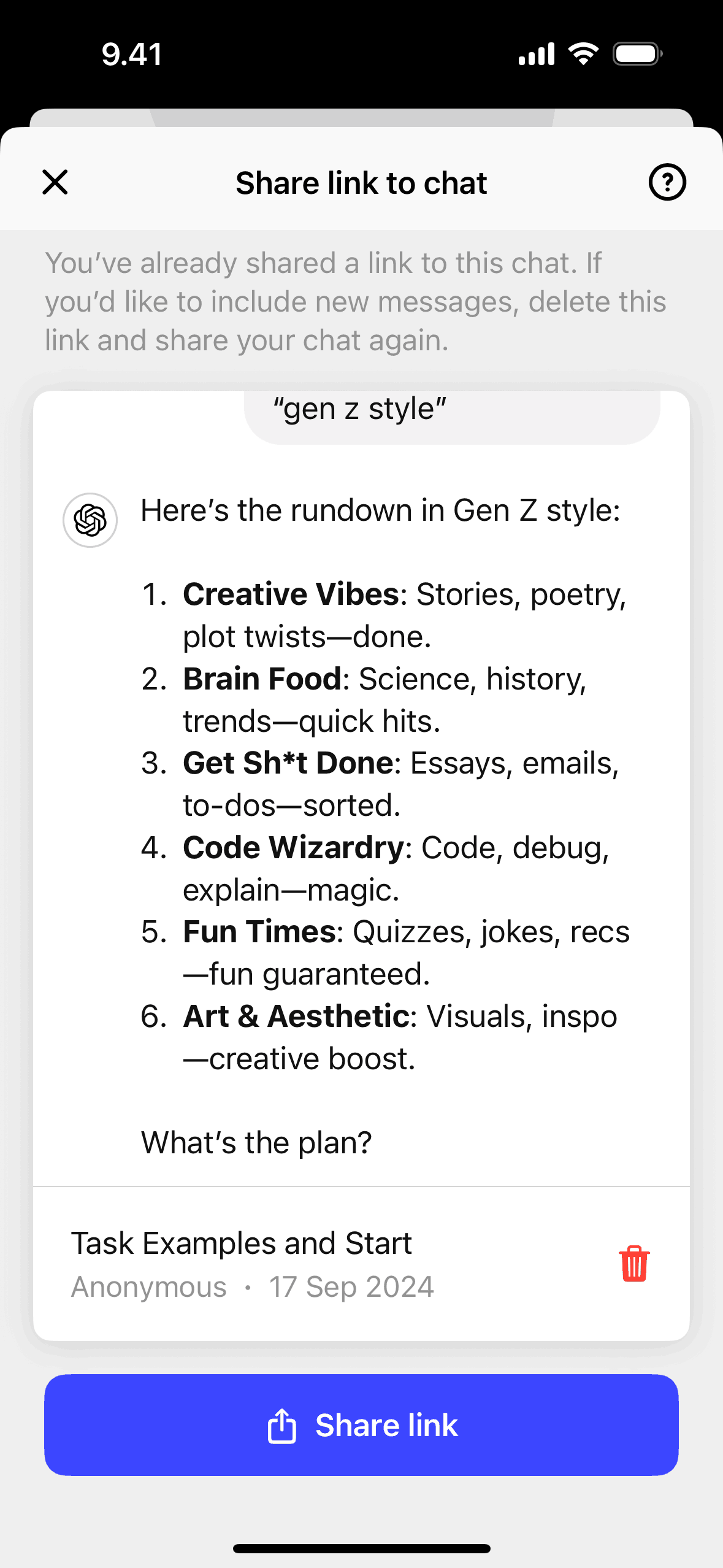 The user flow demonstrates sharing a chat by generating a shareable link. The user can also choose to share their name and has the option to delete the link.