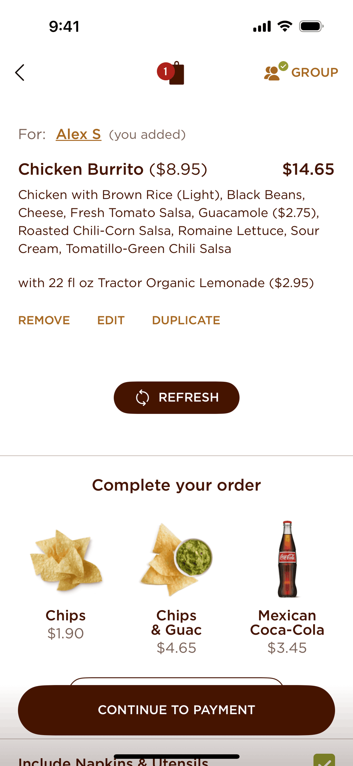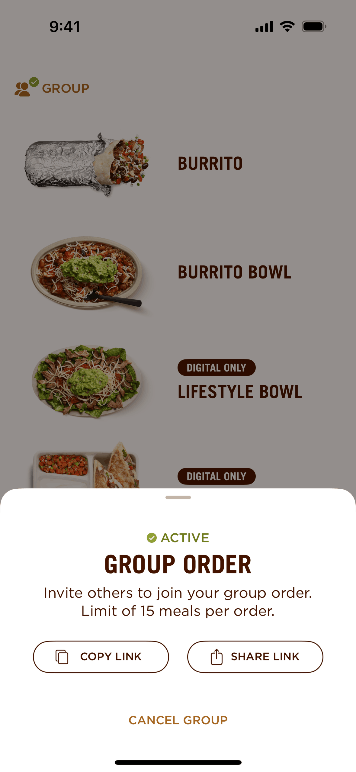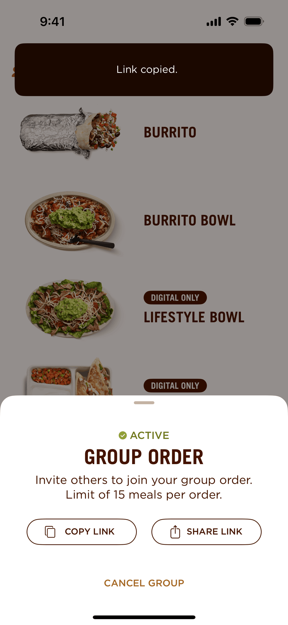 The user initiates a group order from the menu, copies the invitation link, and returns to the menu with the group order active. The flow demonstrates how to start and manage a group order.
