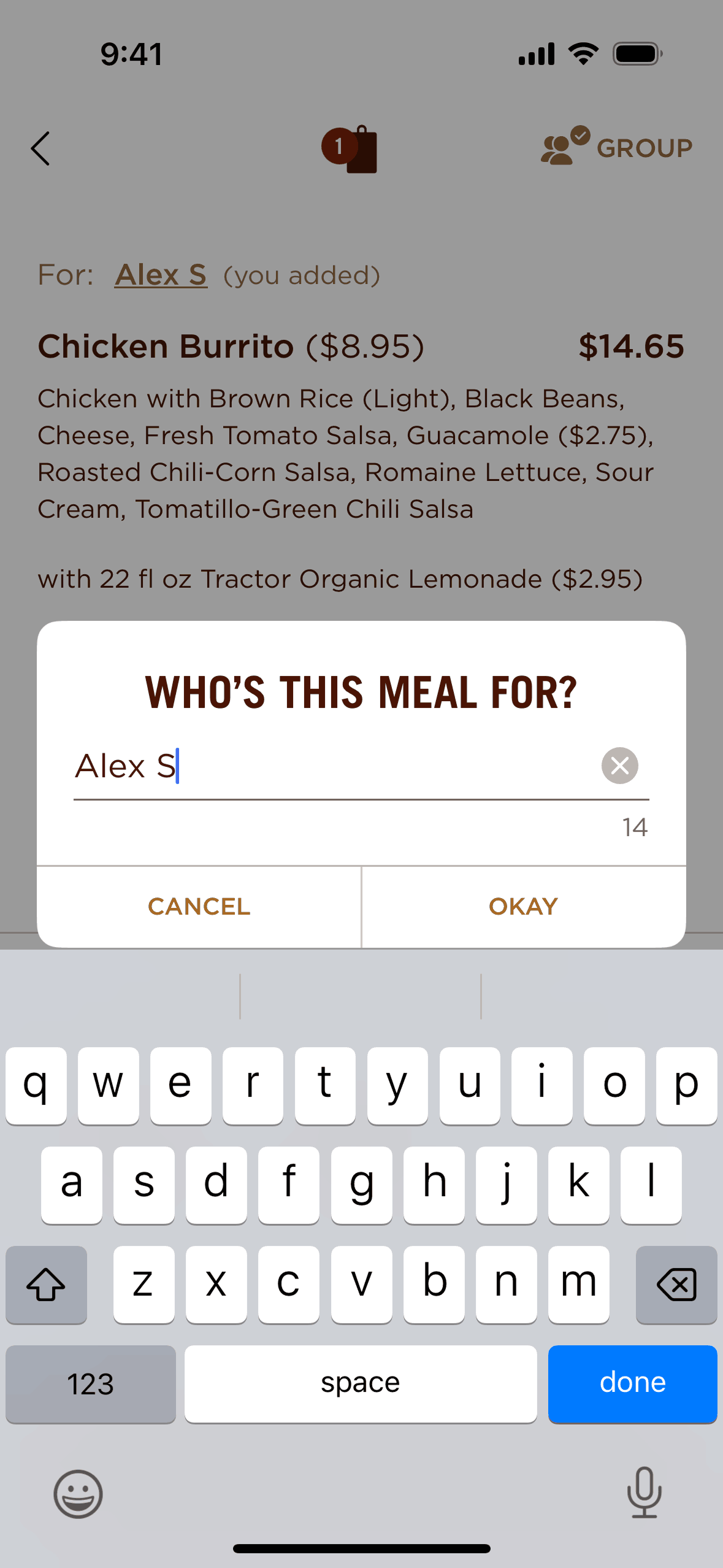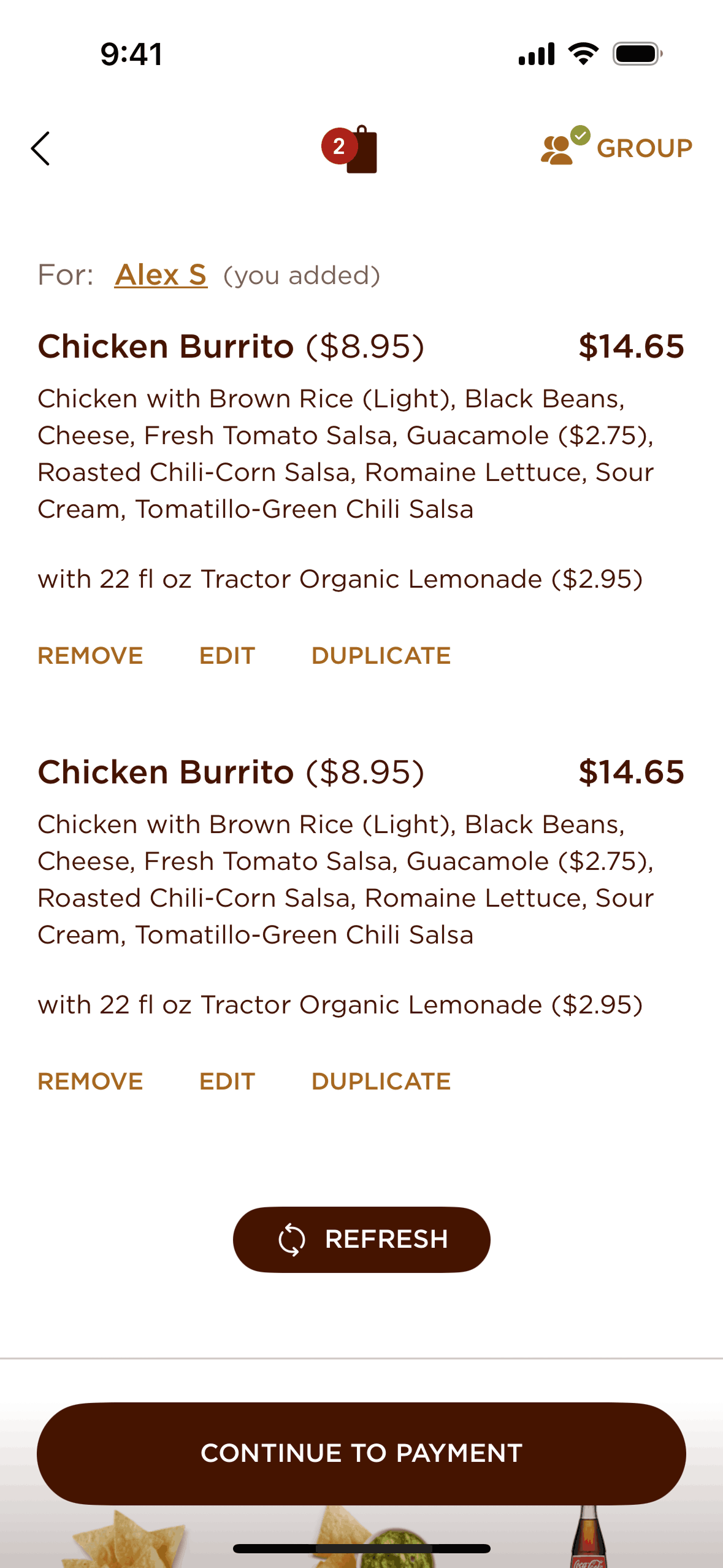 The user duplicates a menu item and assigns it to someone. The screen then confirms the duplication by displaying the item twice.