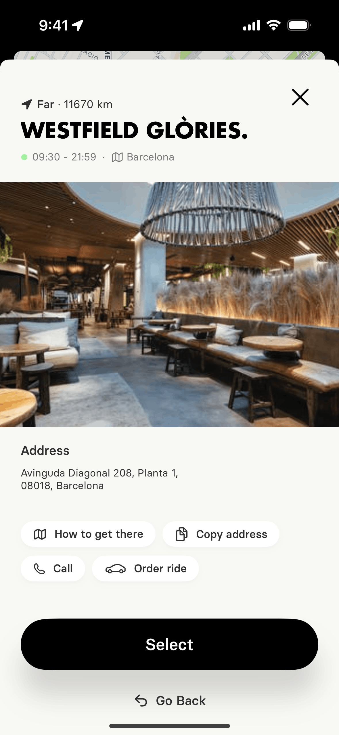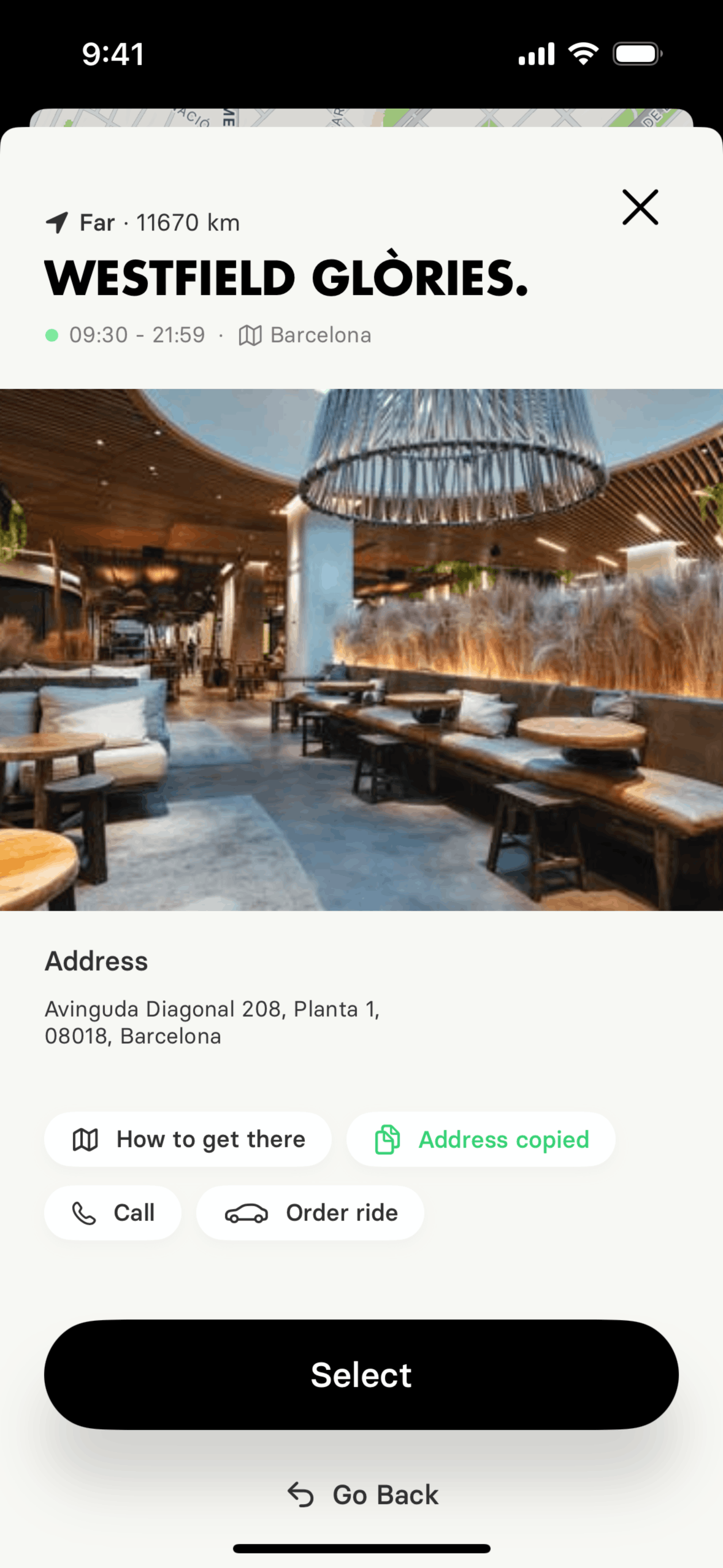 The user views a location on a map, navigates to the details, and copies the address. A confirmation message then appears.
