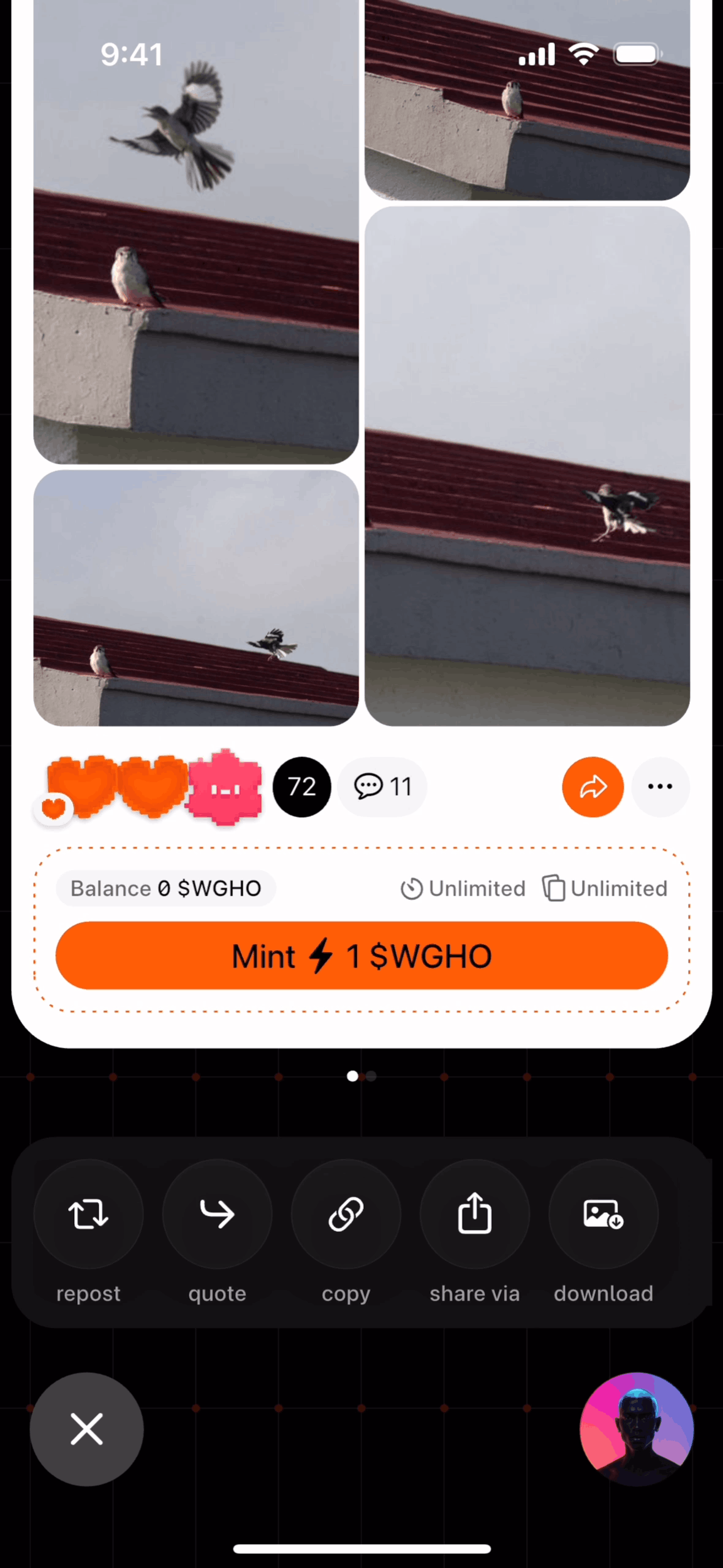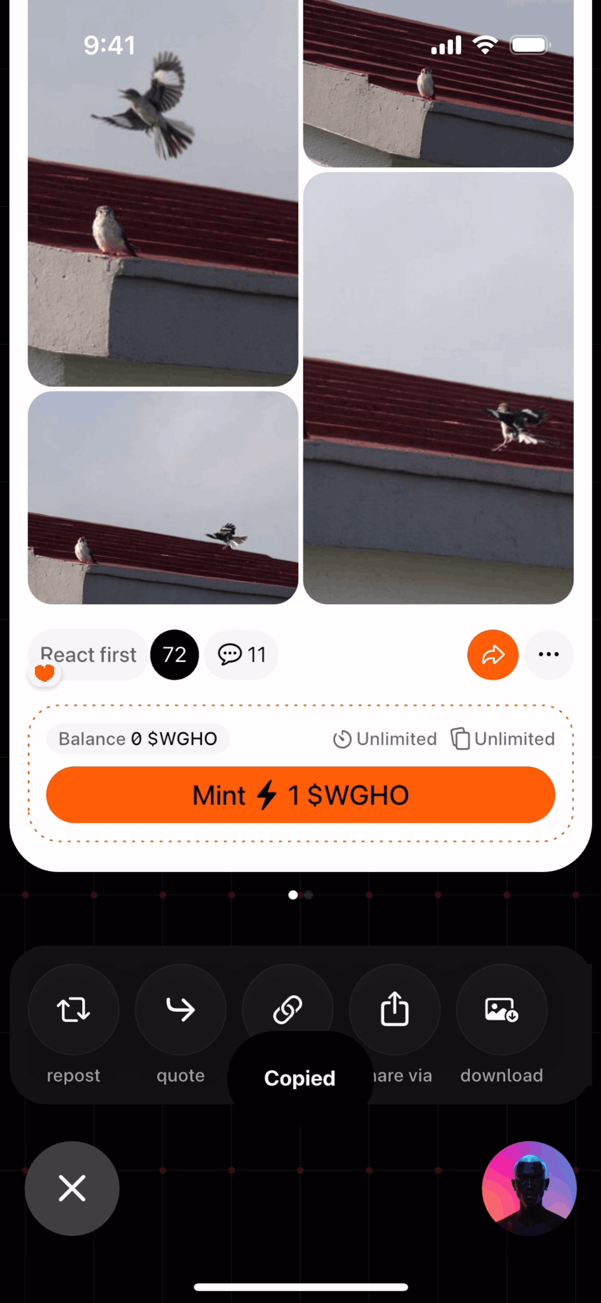 The user views a post and copies the post's content. A "Copied" message confirms the action.