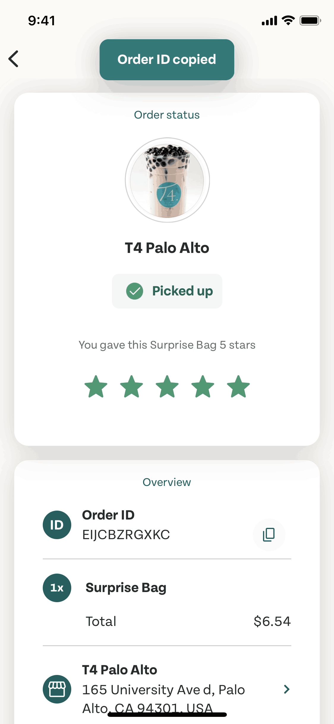 The user views order details and copies the order ID. A confirmation message appears after copying.