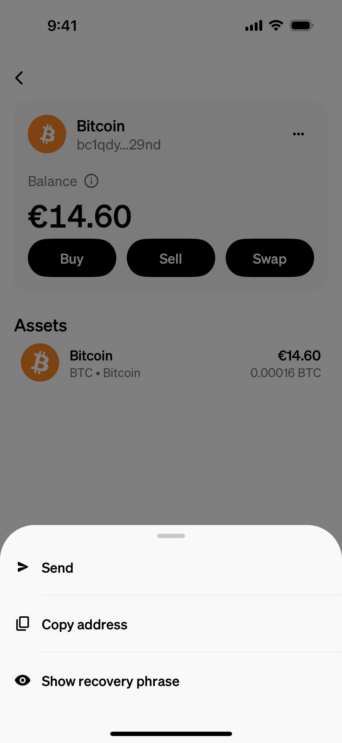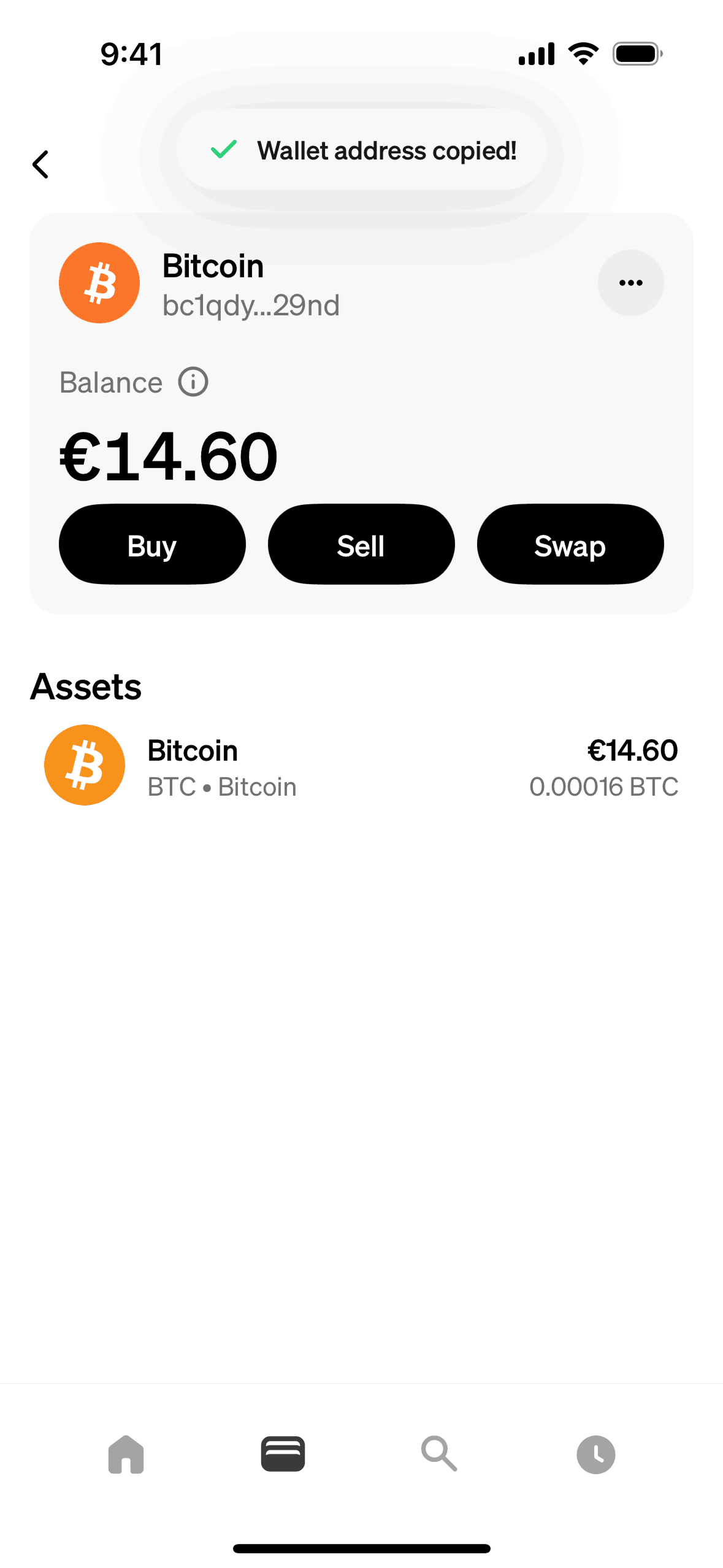 The user copies their Bitcoin wallet address. A confirmation message appears after the address is copied.