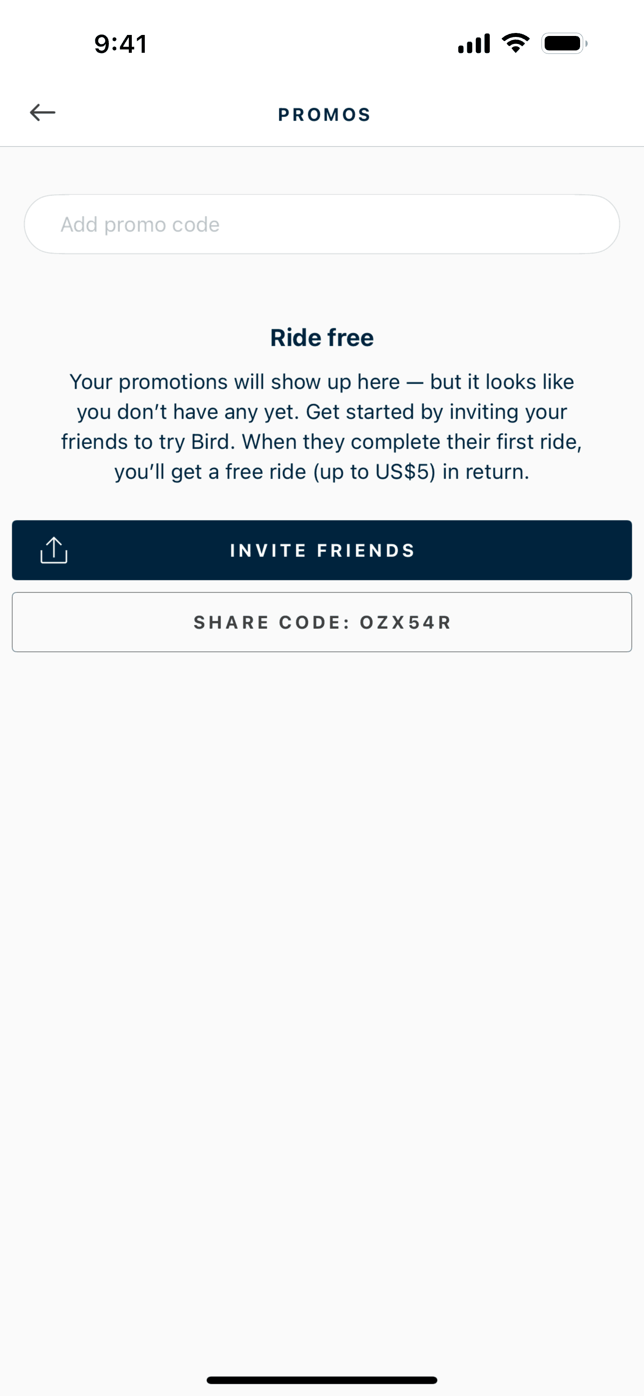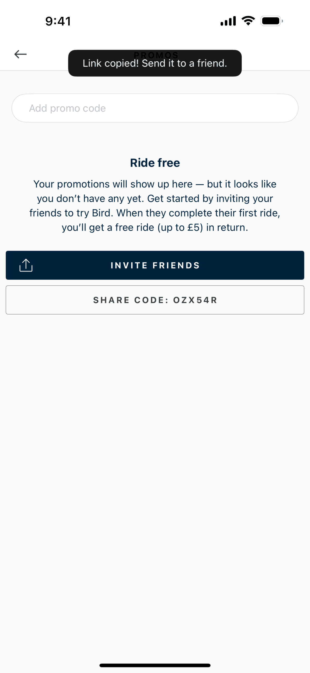 The user navigates to the promotions screen and copies the share code. A confirmation message appears after the link is copied.