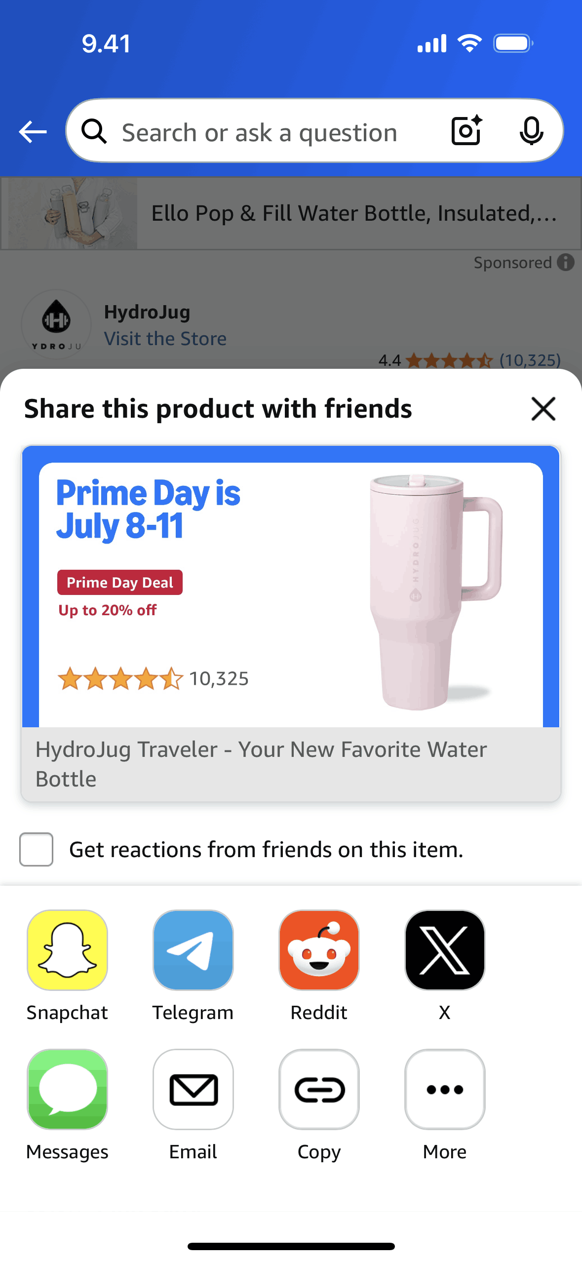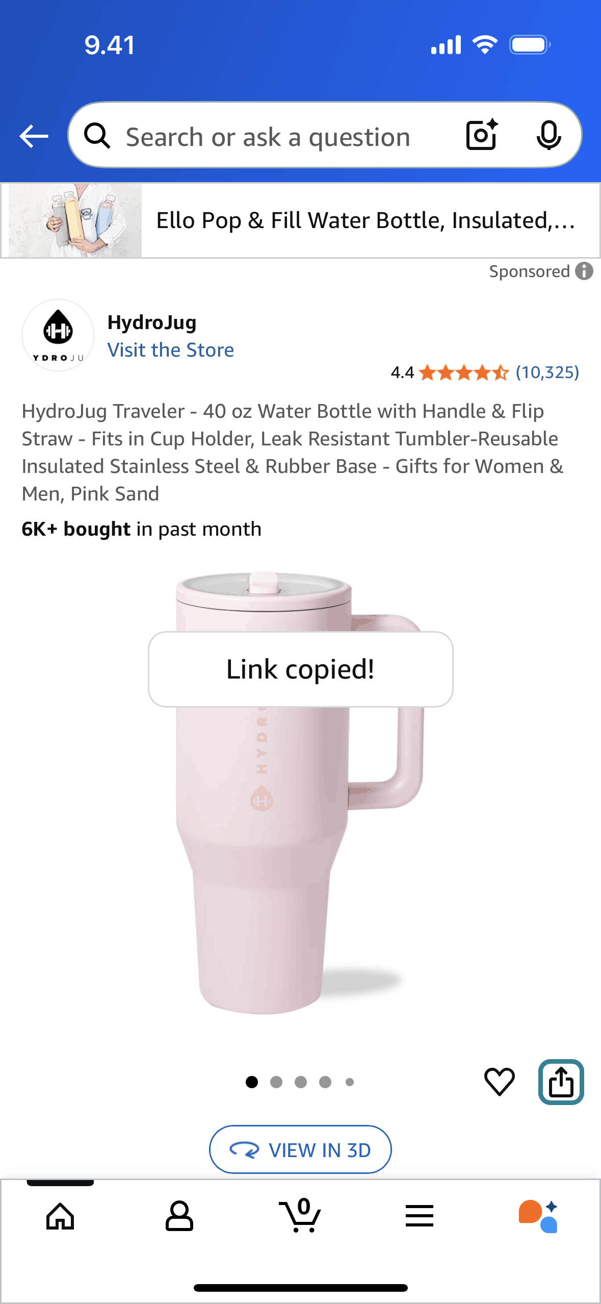 The user views a product, selects the share option, and copies the product link. A confirmation message appears after copying.