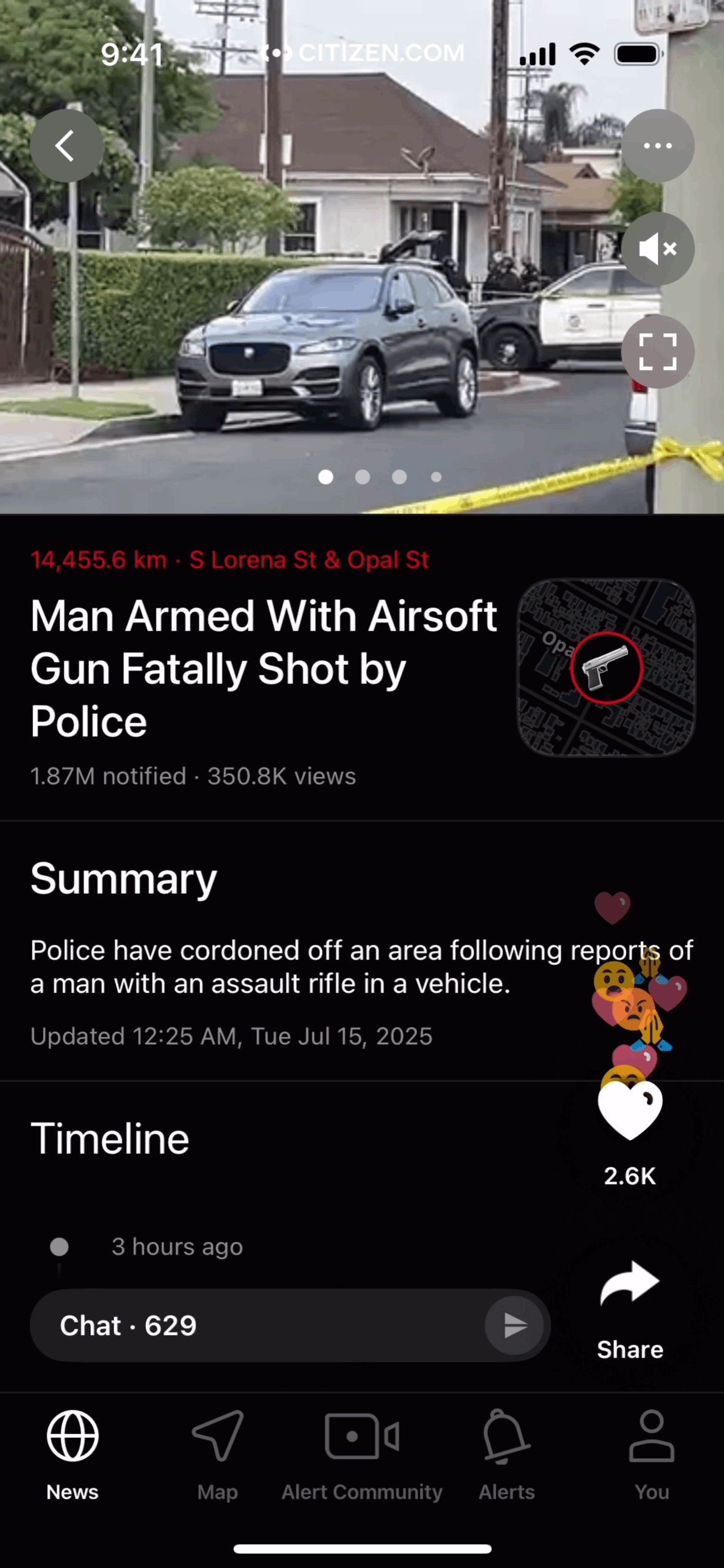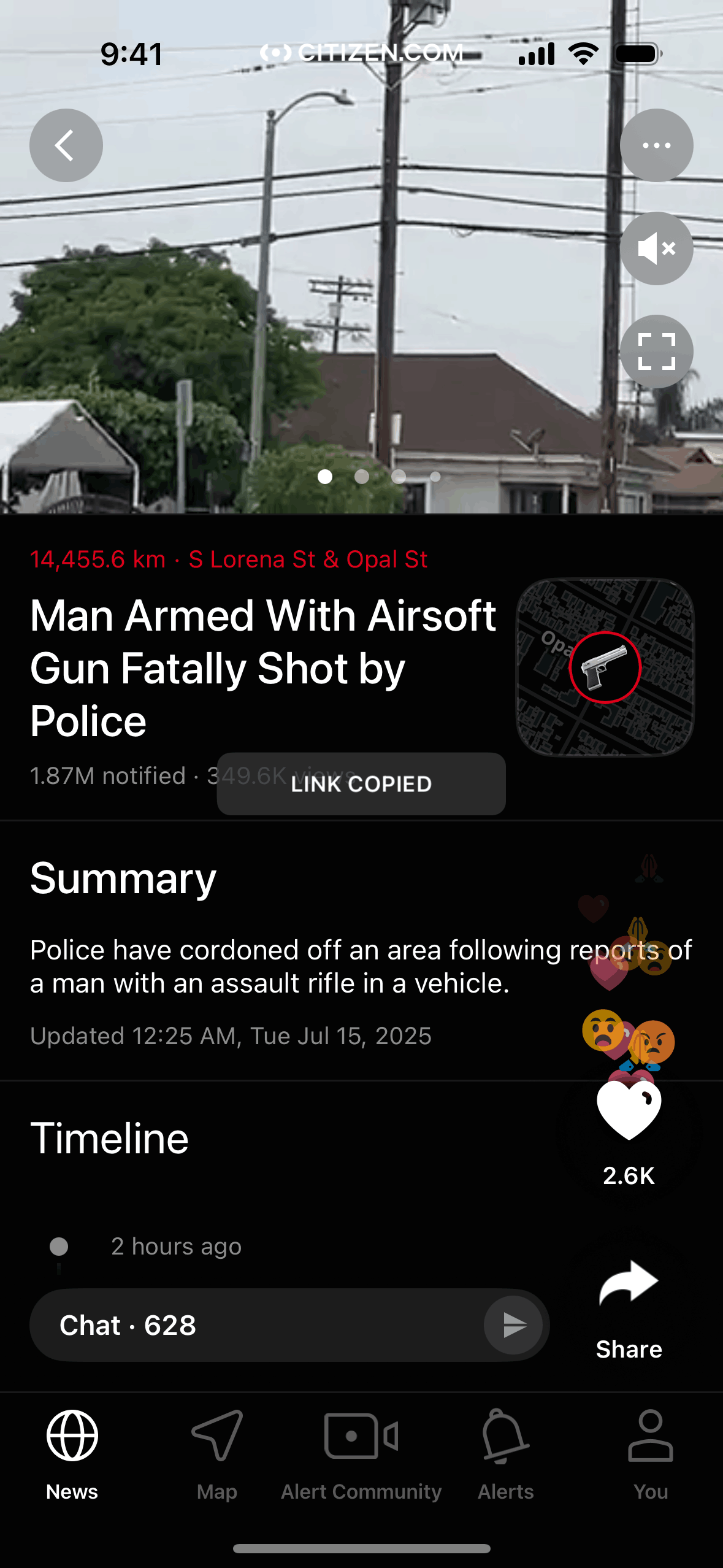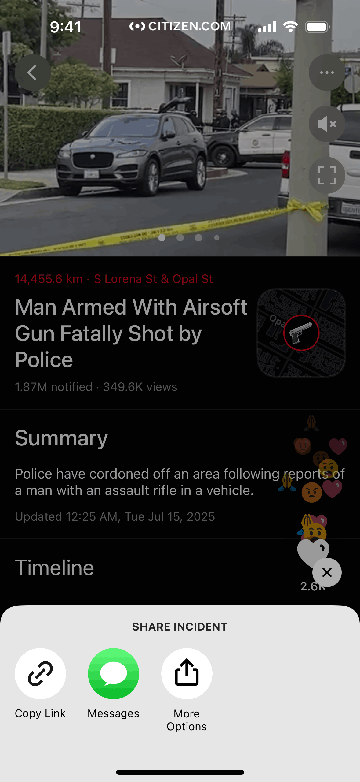 The user views an incident, taps the share button, and copies the incident link. A confirmation message appears.