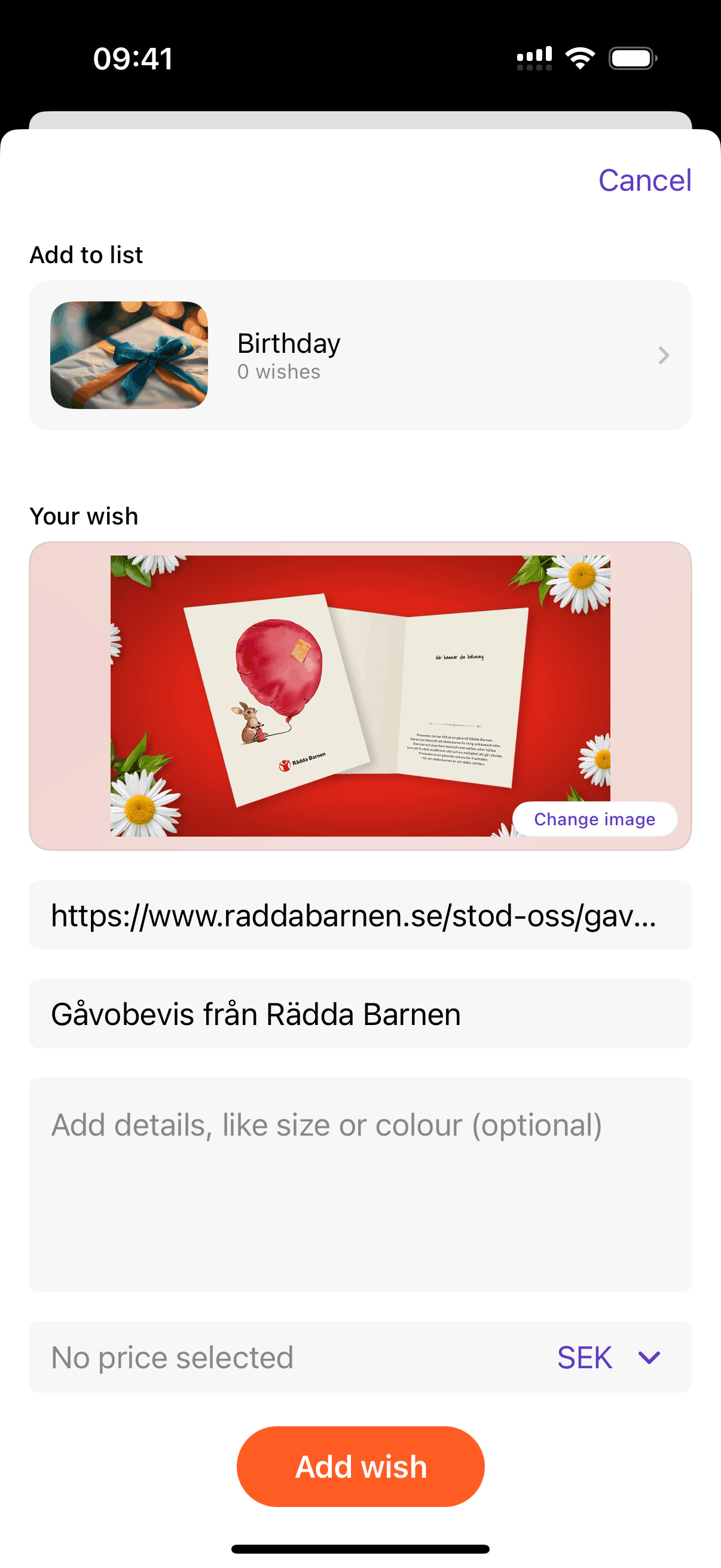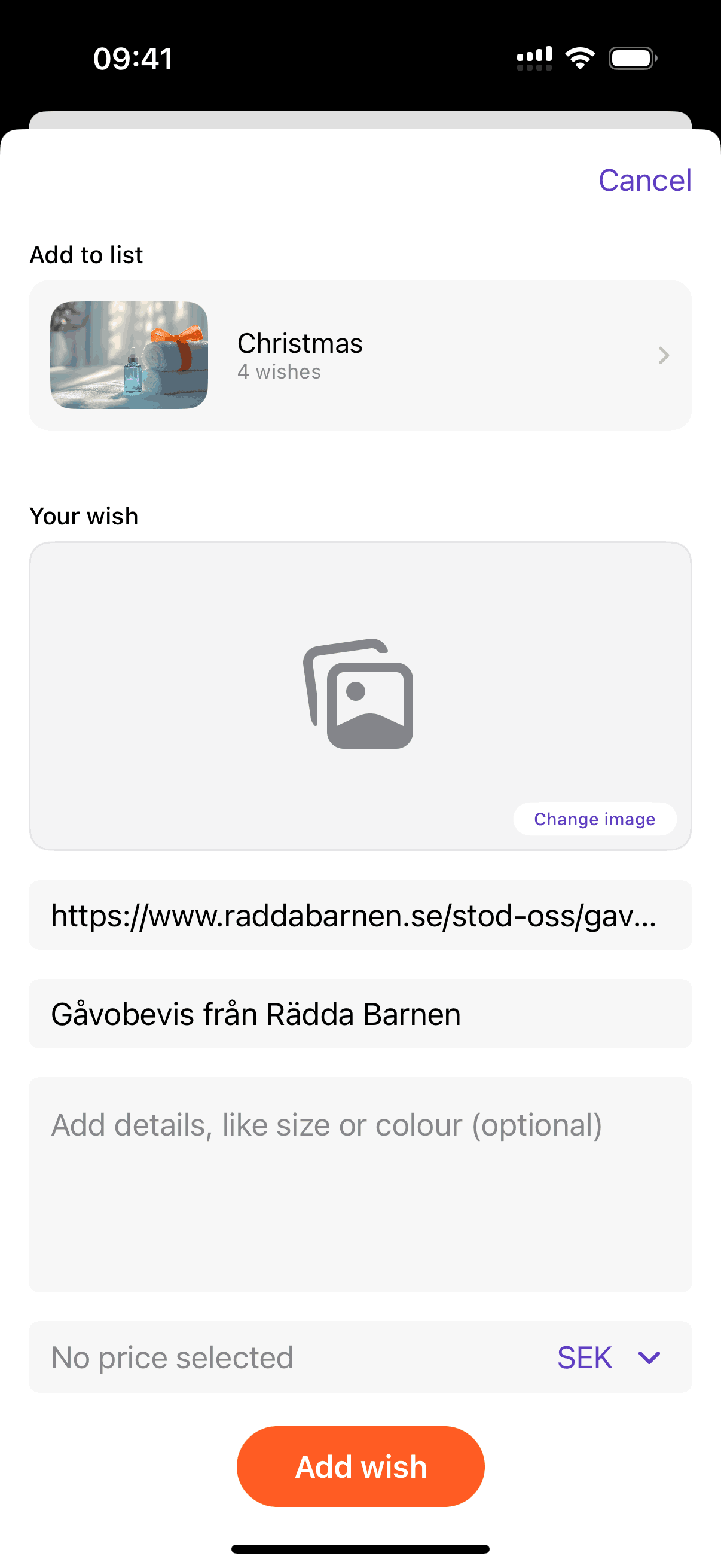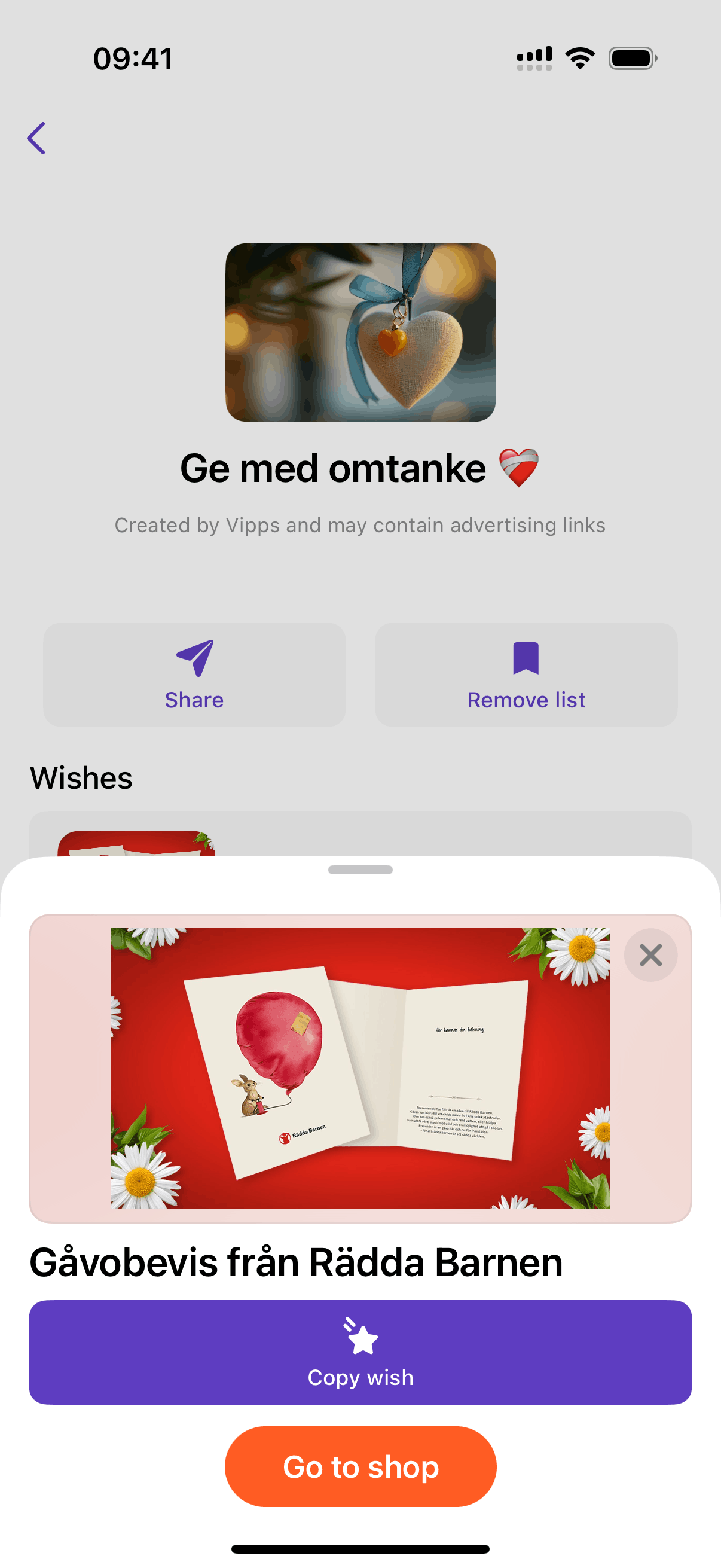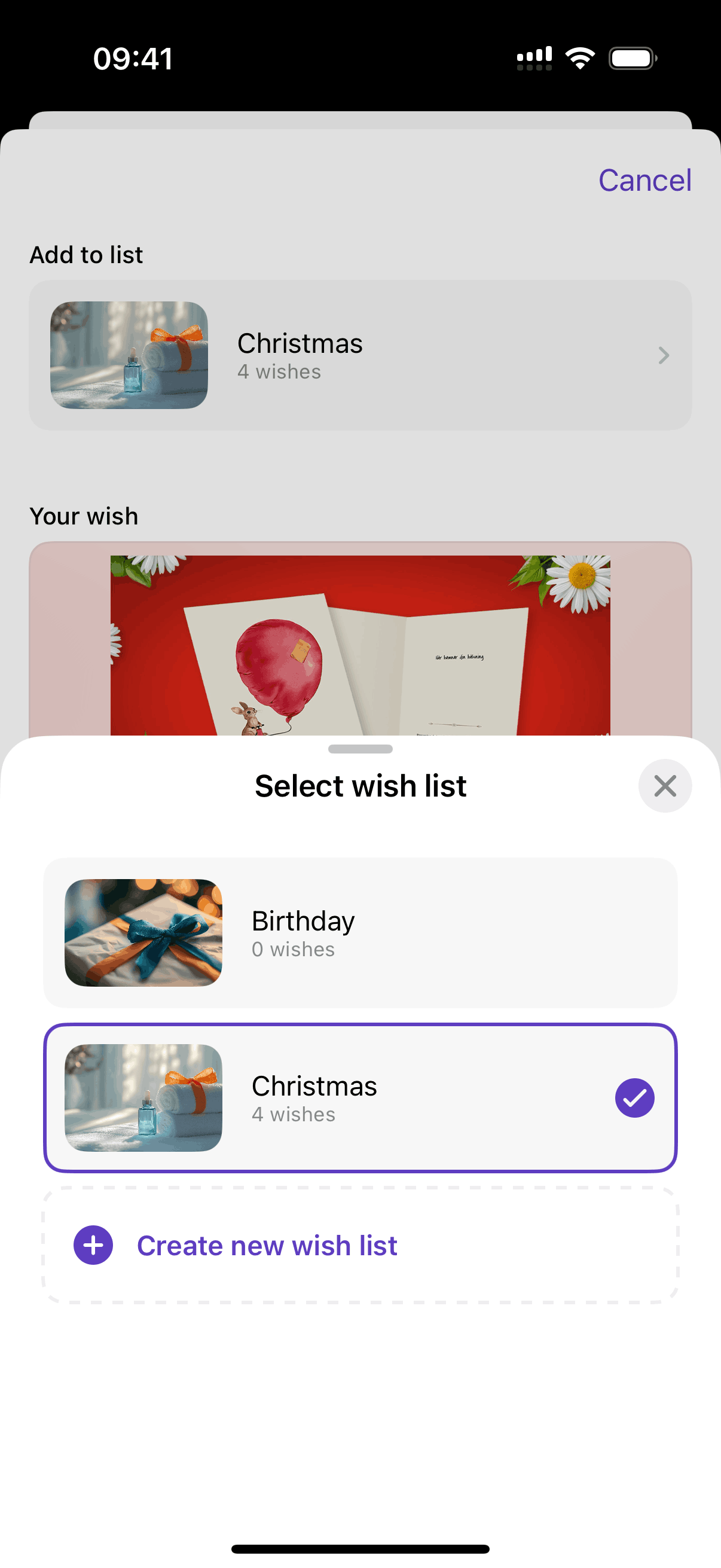 The user copies a wish from a wish list, selects a wish list to add it to, and views the updated wish list.