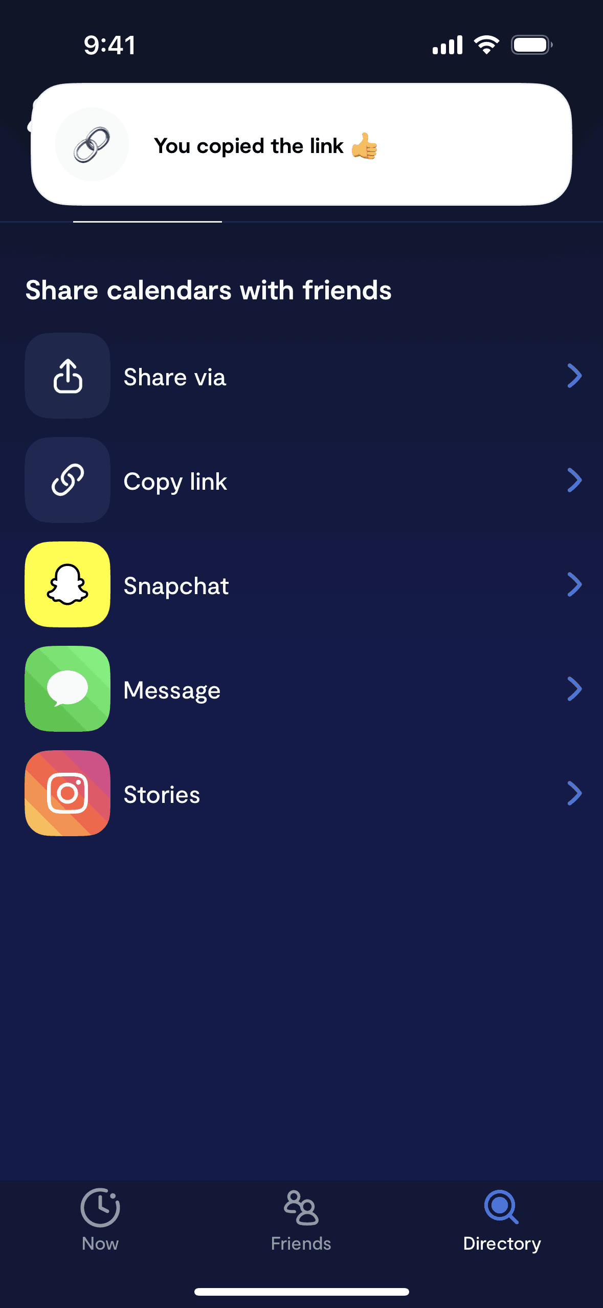The user navigates to sharing options and copies a link. A confirmation message then appears.