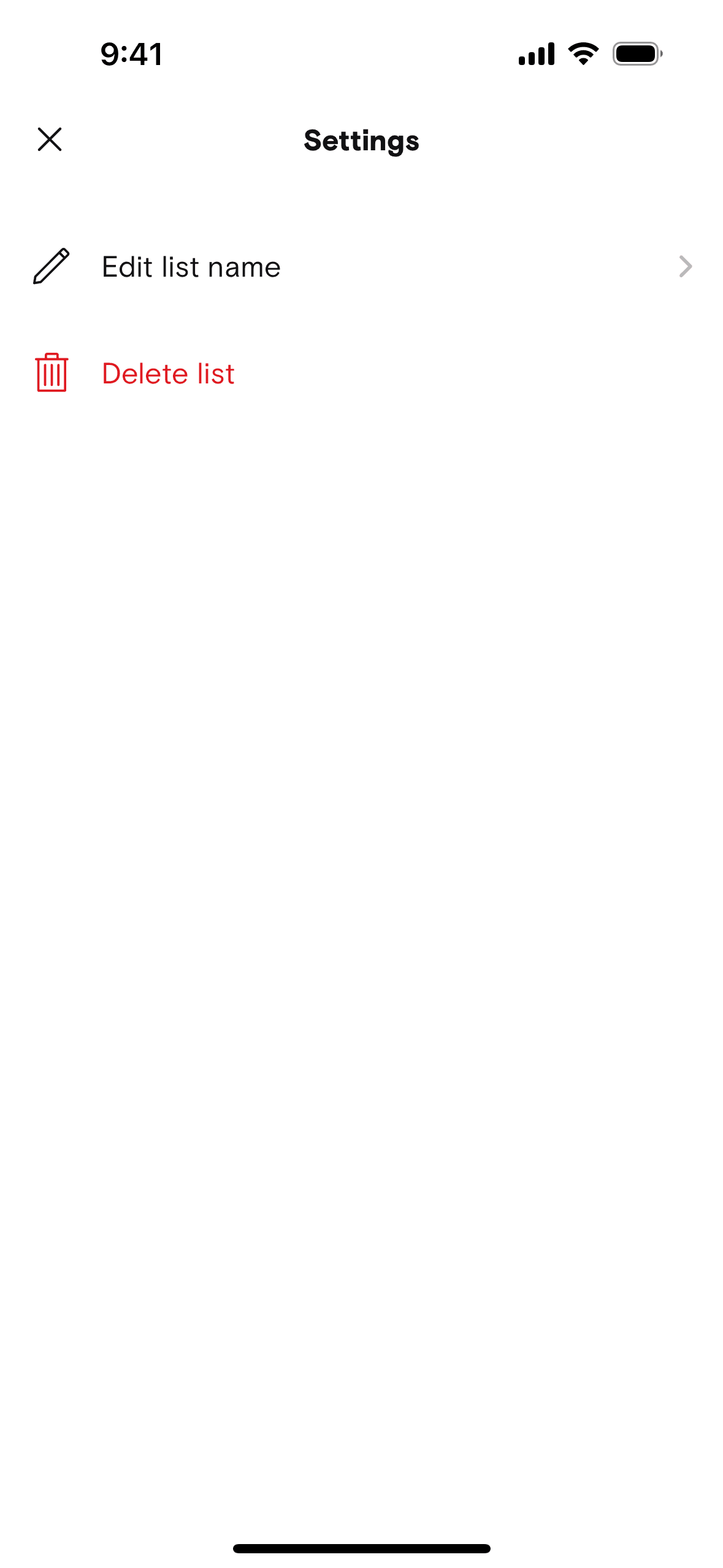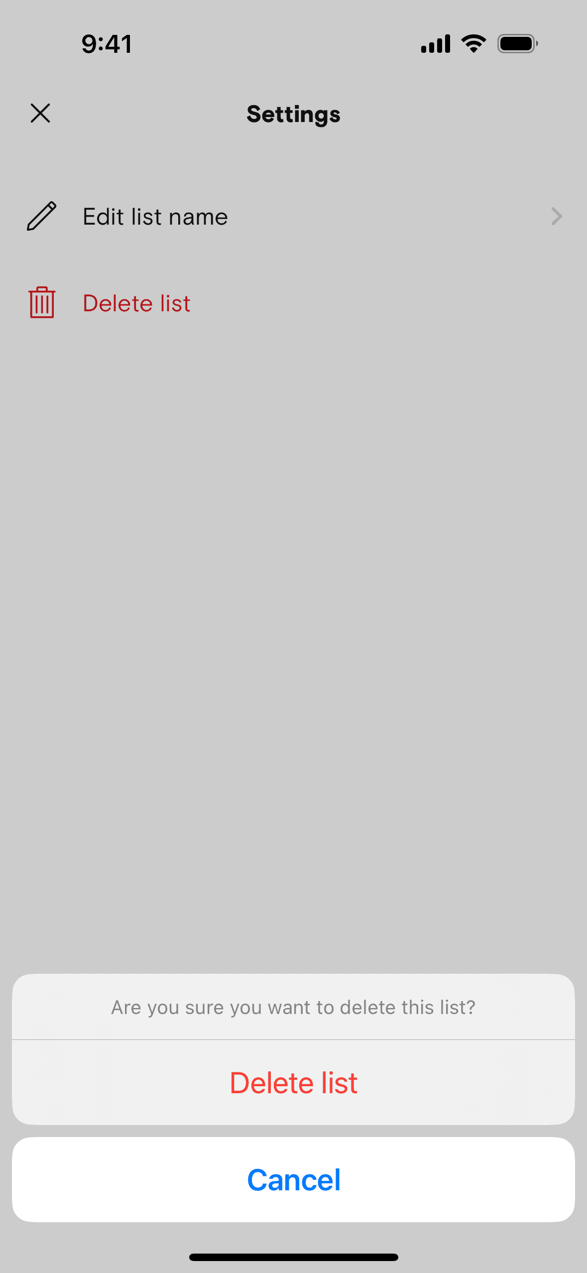 The user navigates to the settings of a list, confirms its deletion, and is then taken back to the favorites screen where the list is no longer present.