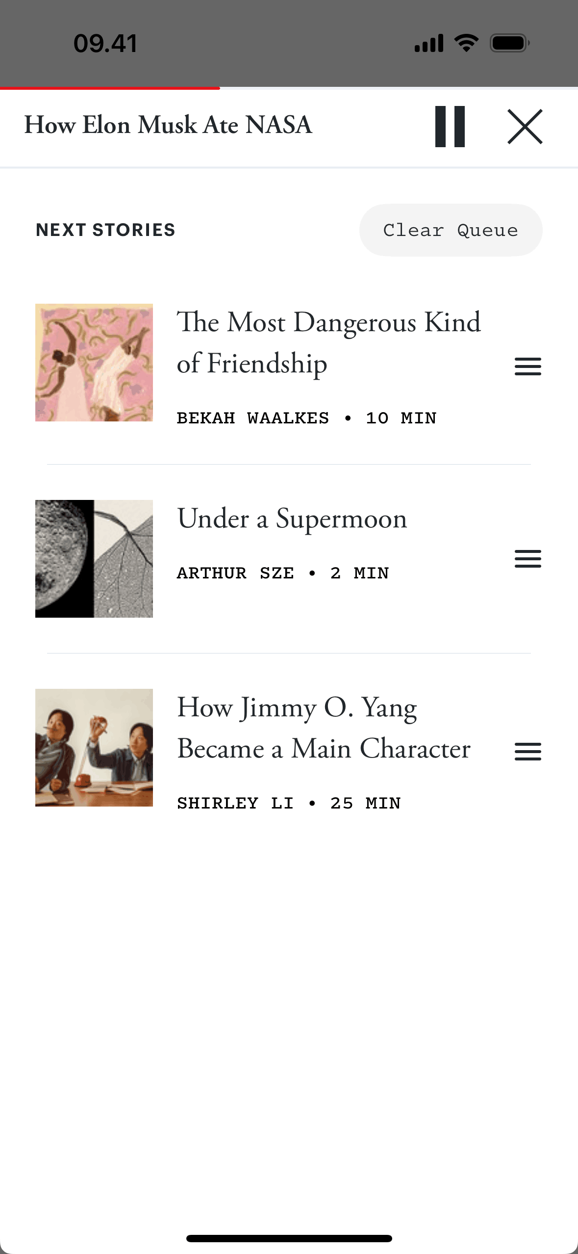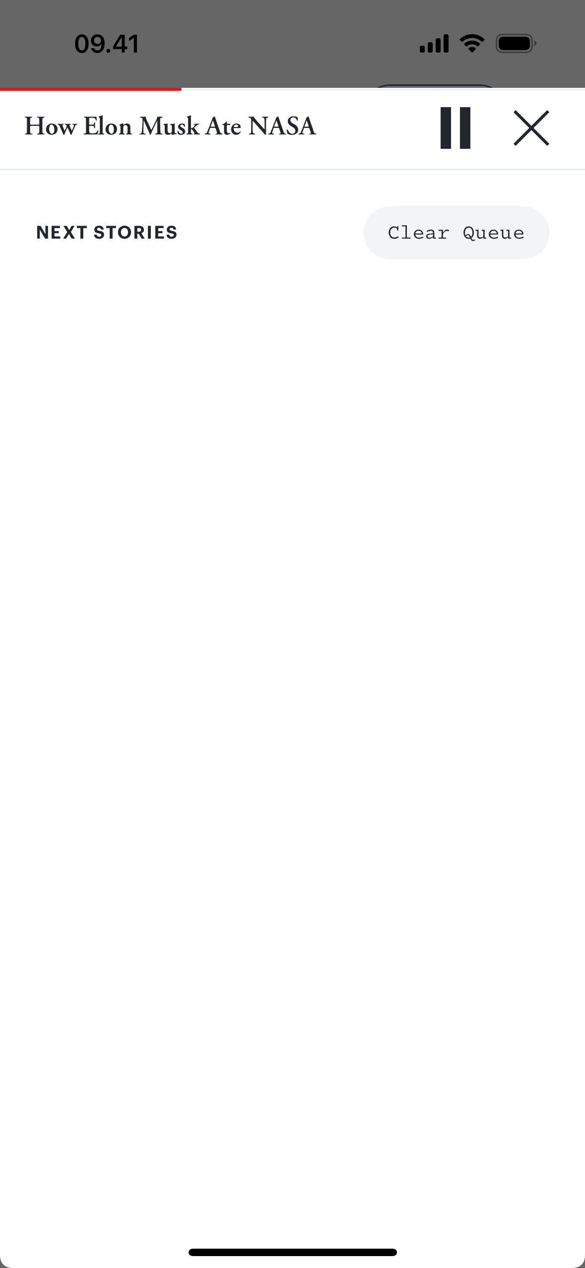 The user clears the queue of next stories. The user taps on the "Clear Queue" button, resulting in an empty queue.