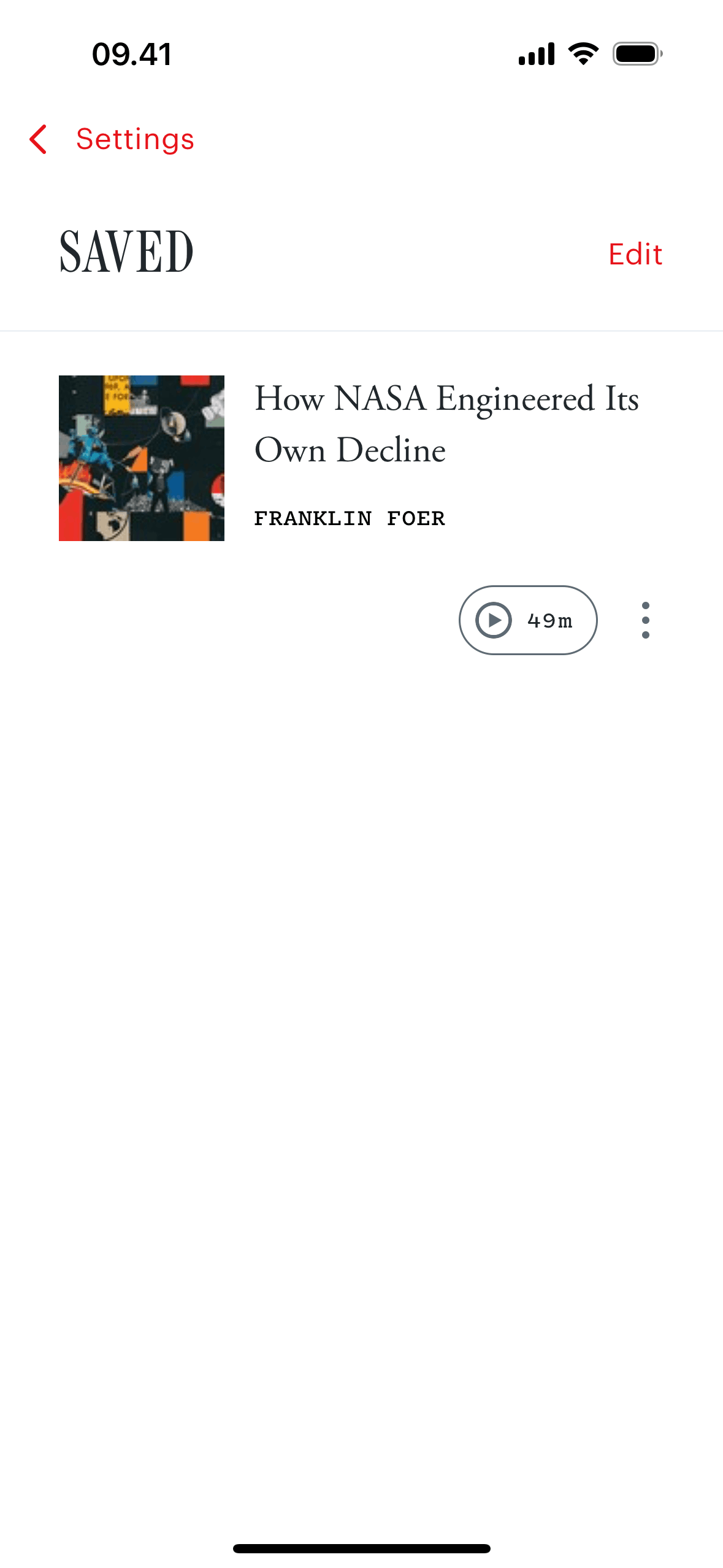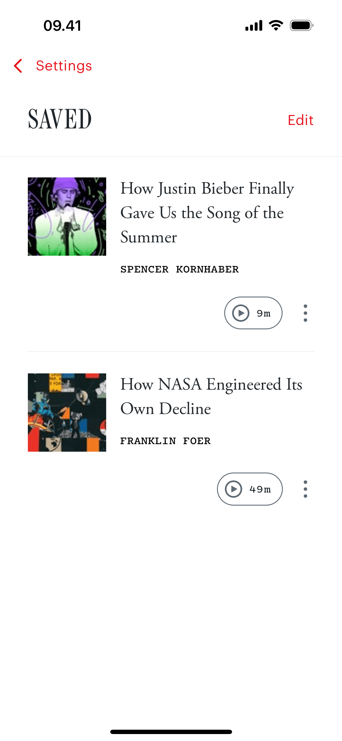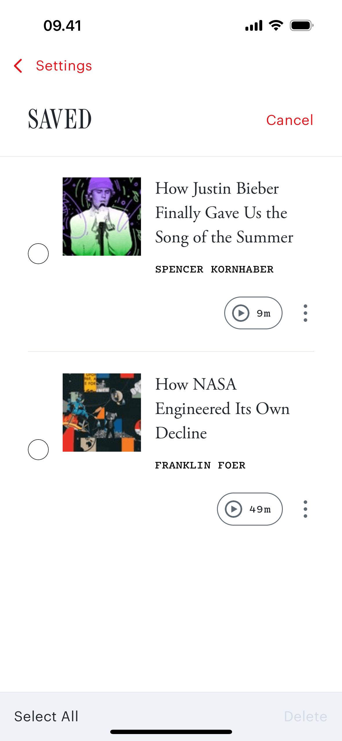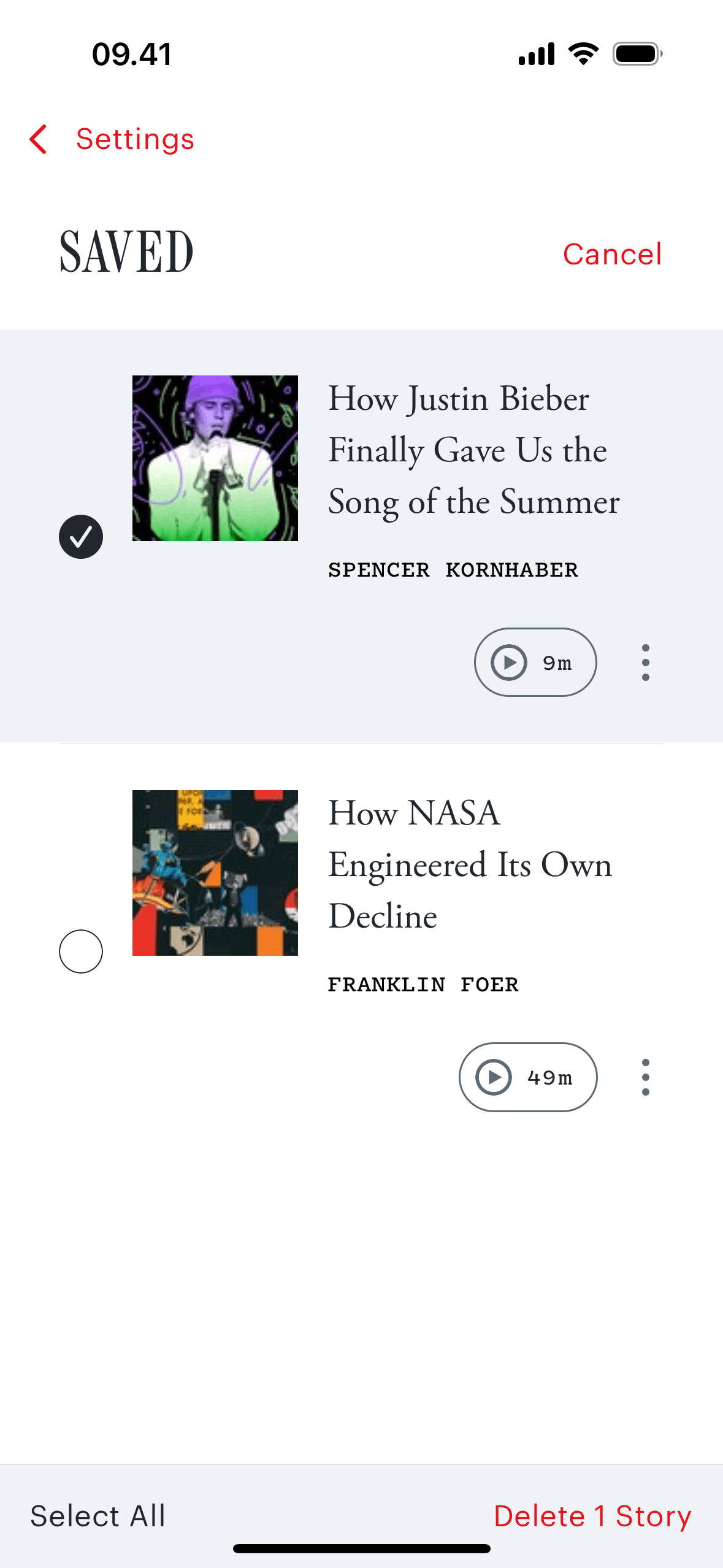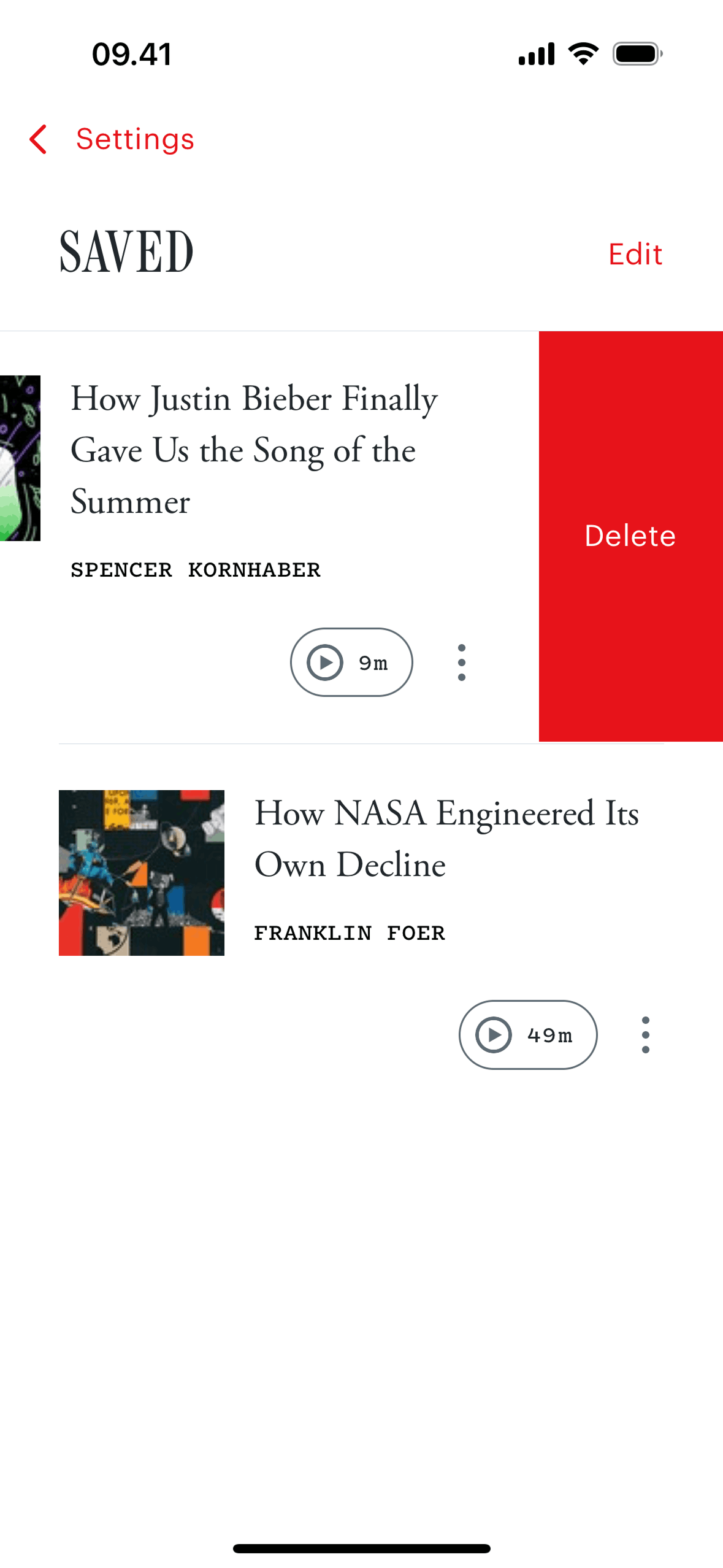 The user deletes a saved article by swiping to reveal the delete option. The article is then removed from the saved list.