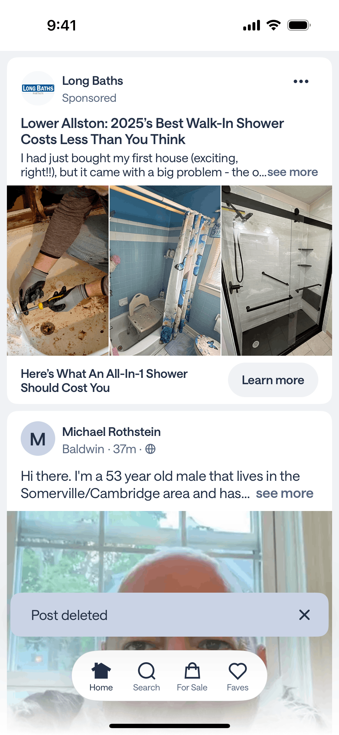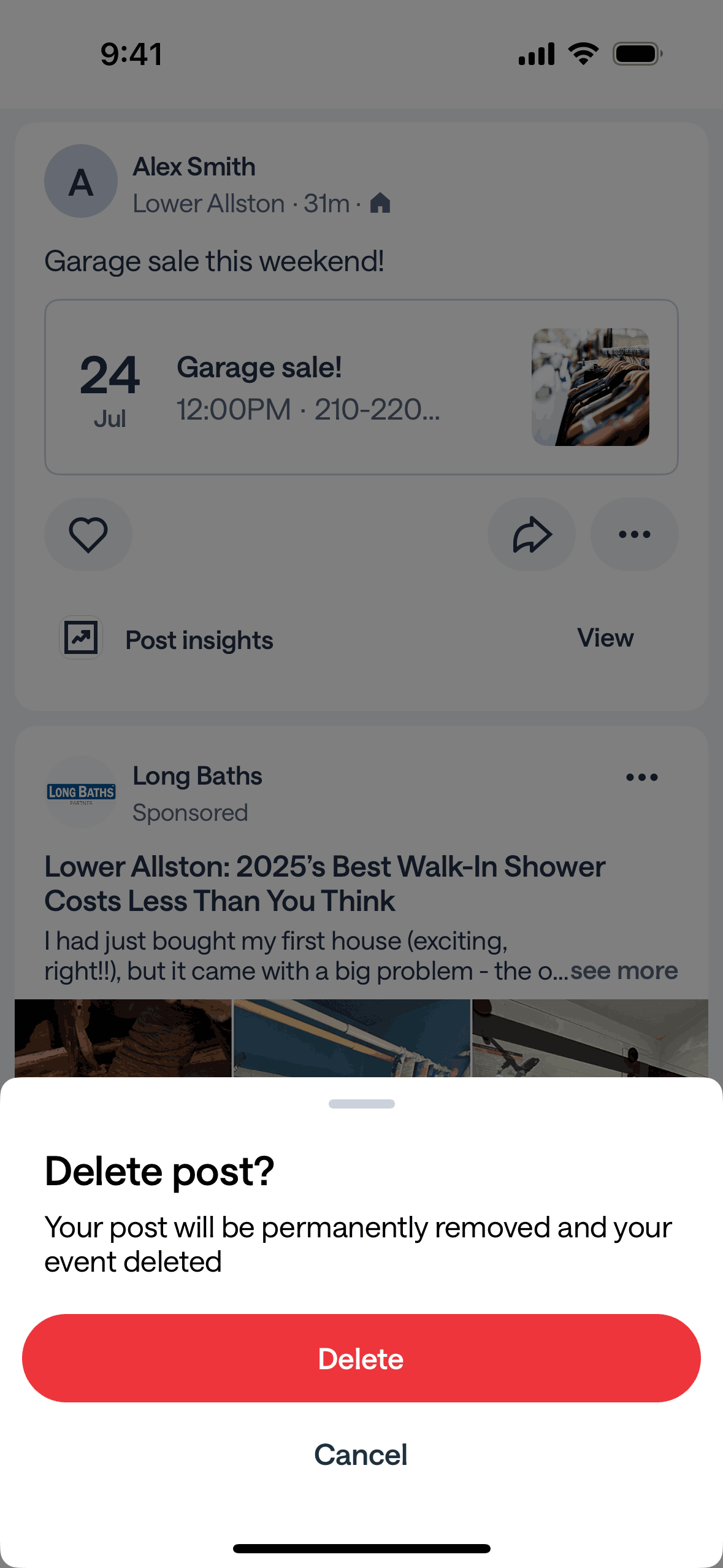 The user deletes a post by accessing the post options, confirming the deletion, and then viewing a confirmation message on the feed.