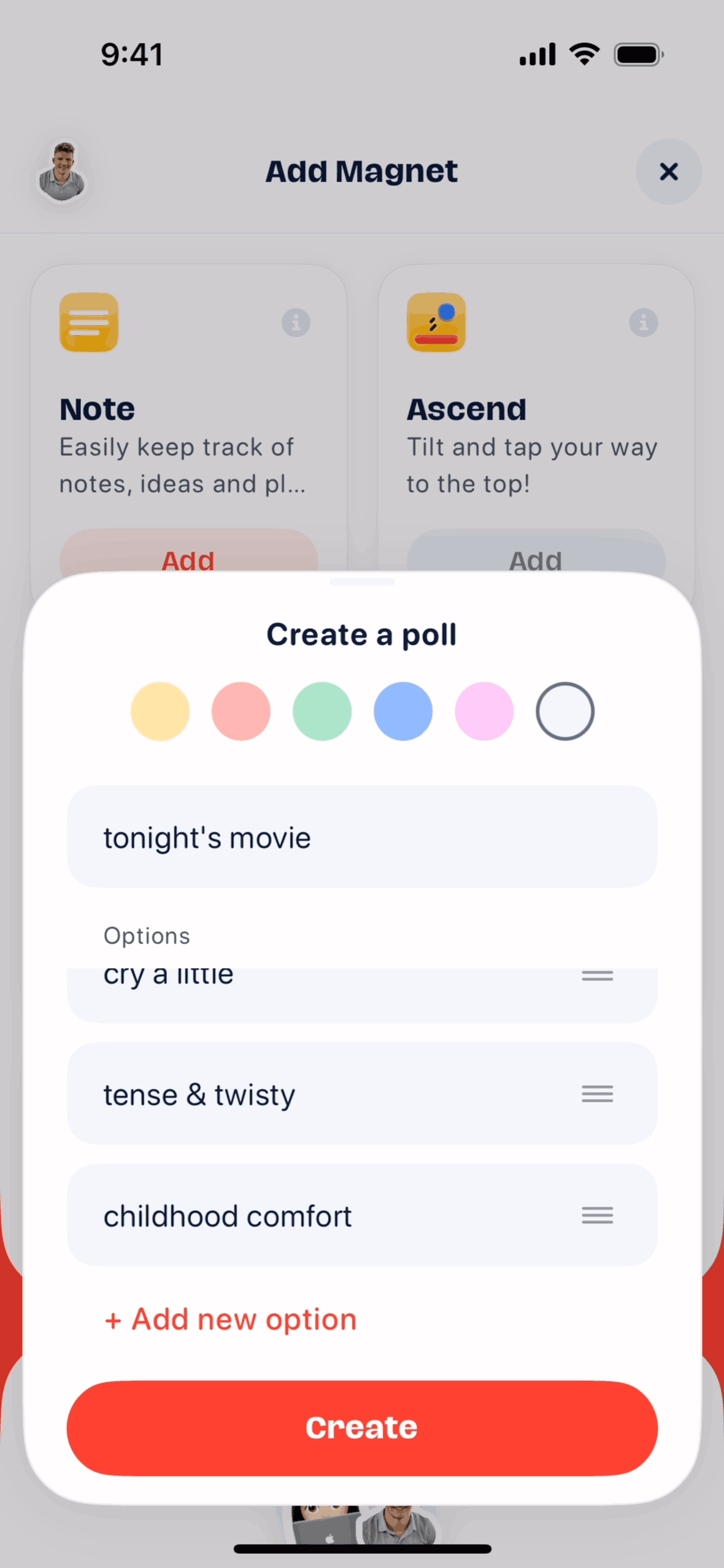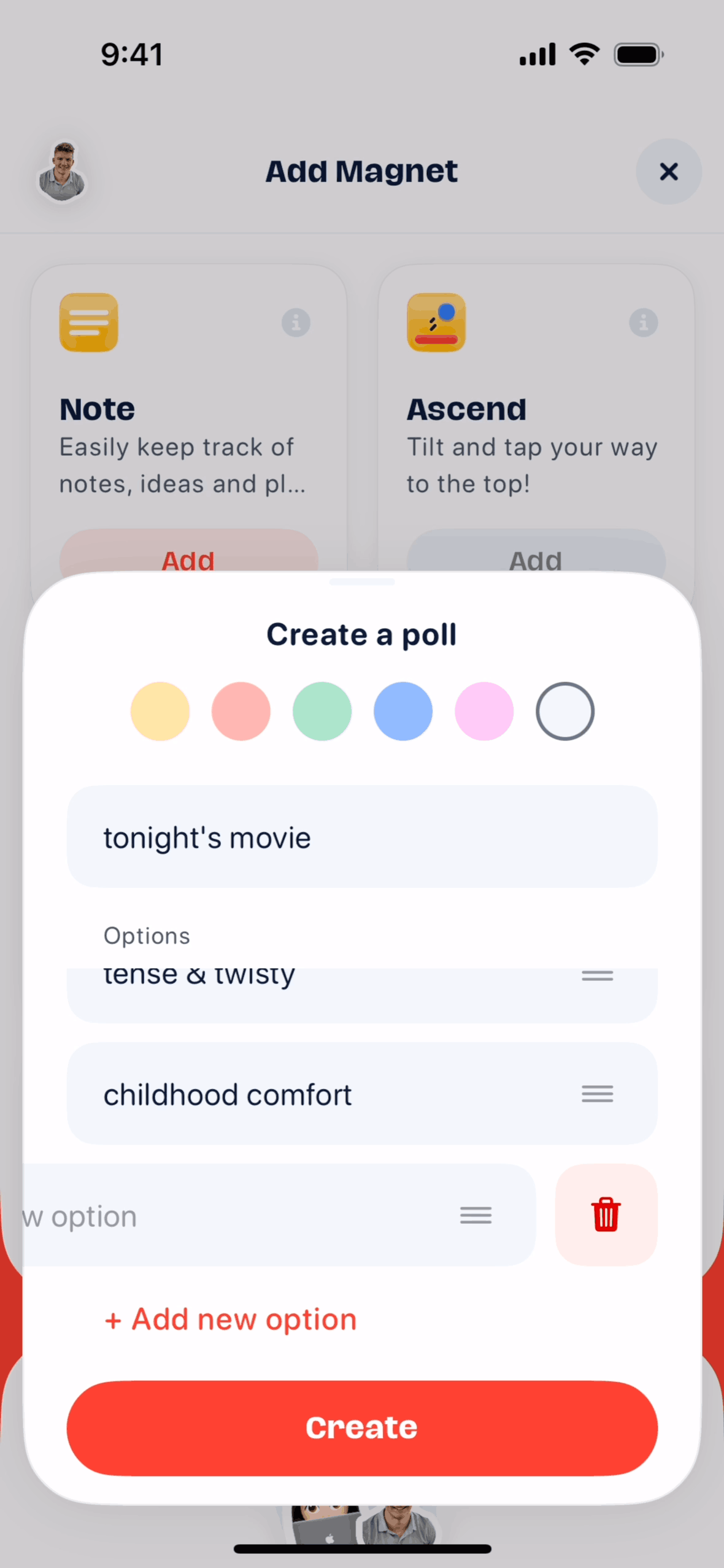 The user flow demonstrates deleting an option within a poll creation modal. It showcases the action and the resulting updated poll options.
