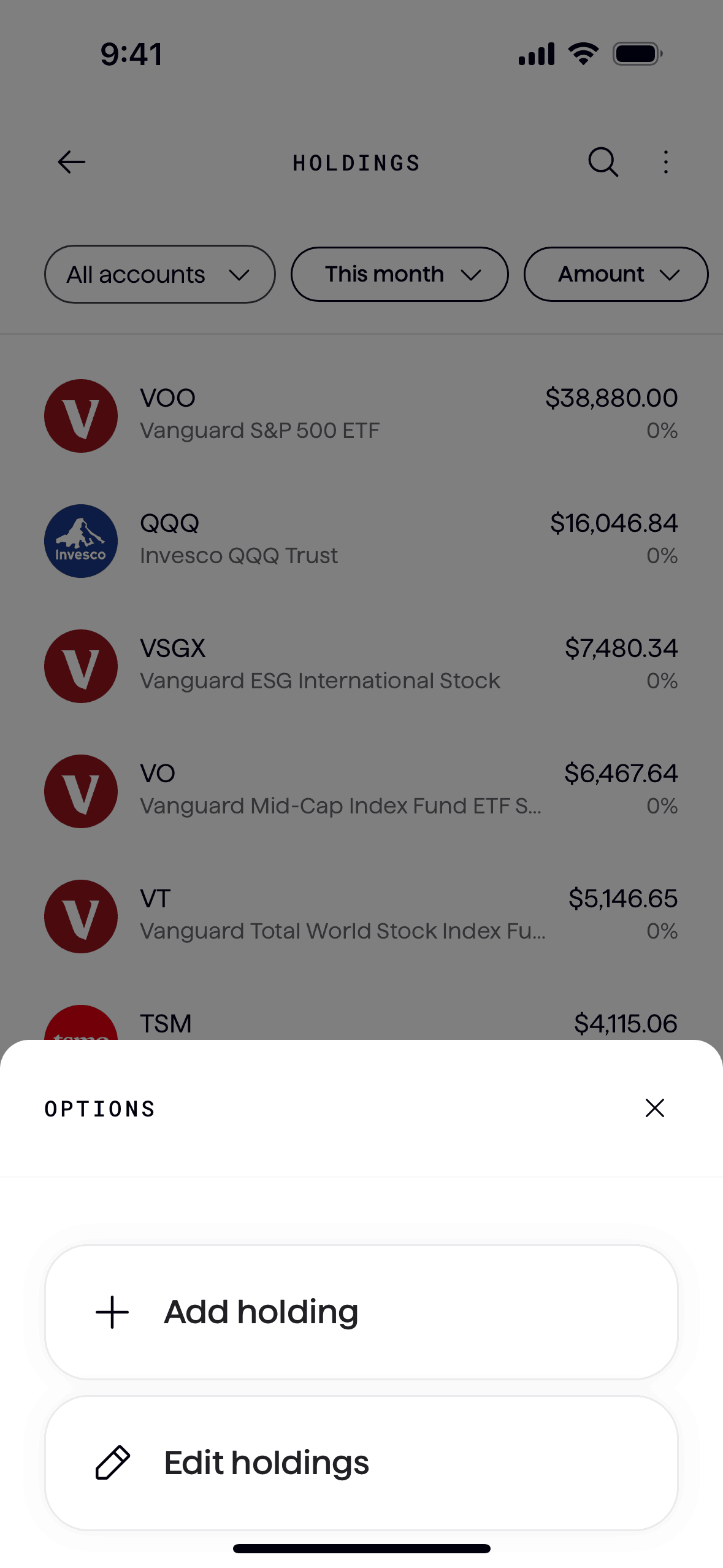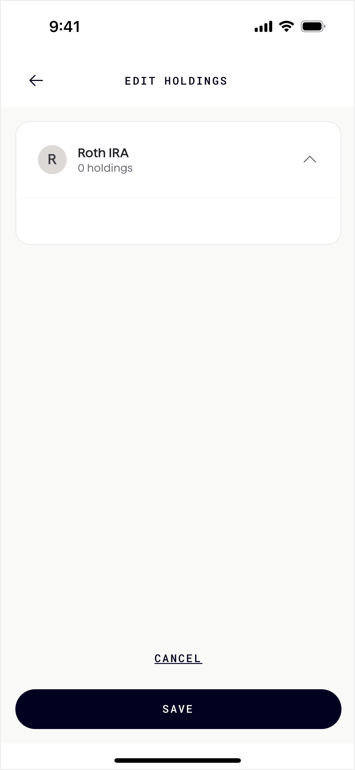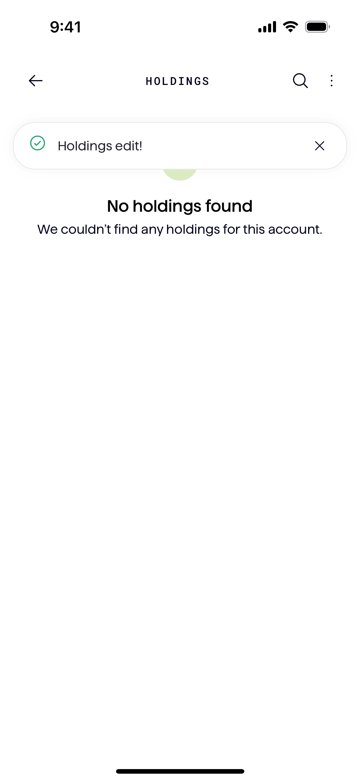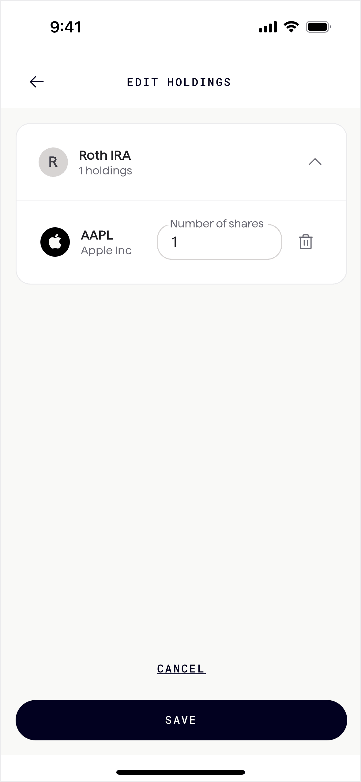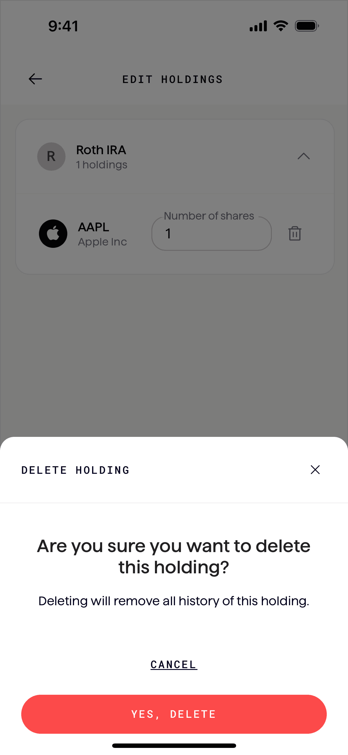 The user deletes a holding by navigating to the edit screen, selecting the delete option, and confirming the deletion. The holding is then removed from the account.