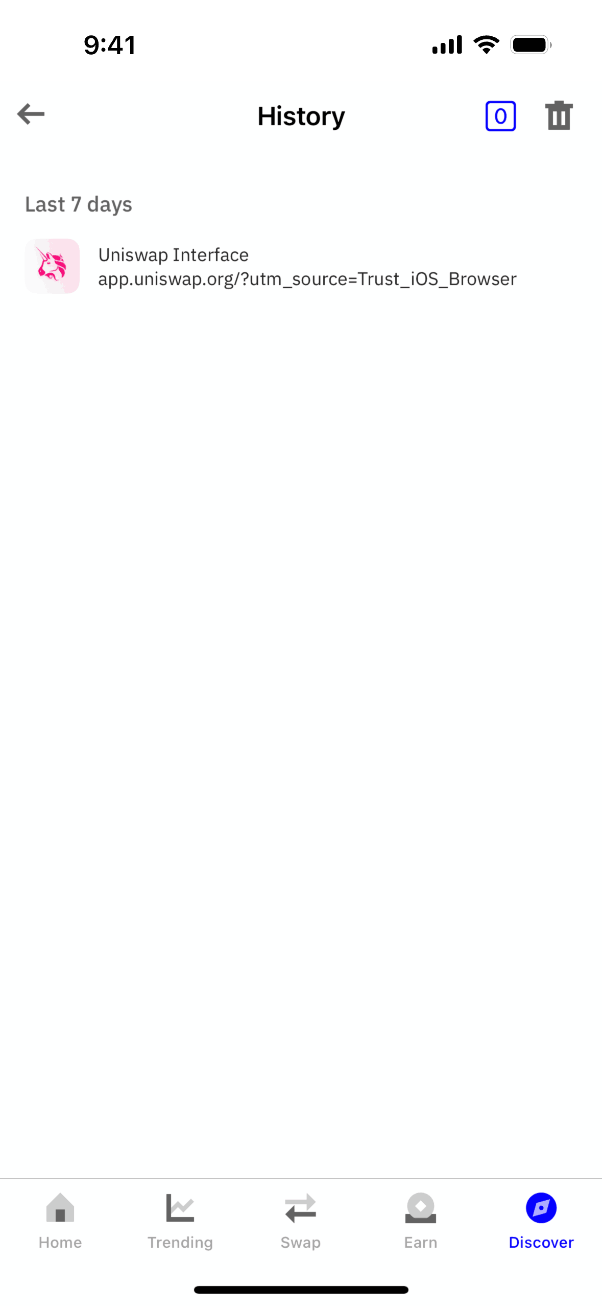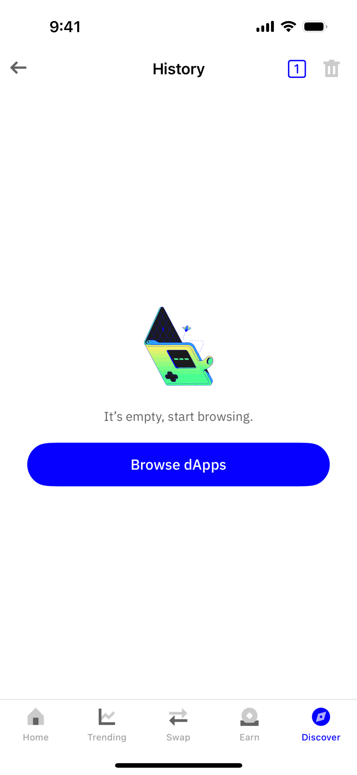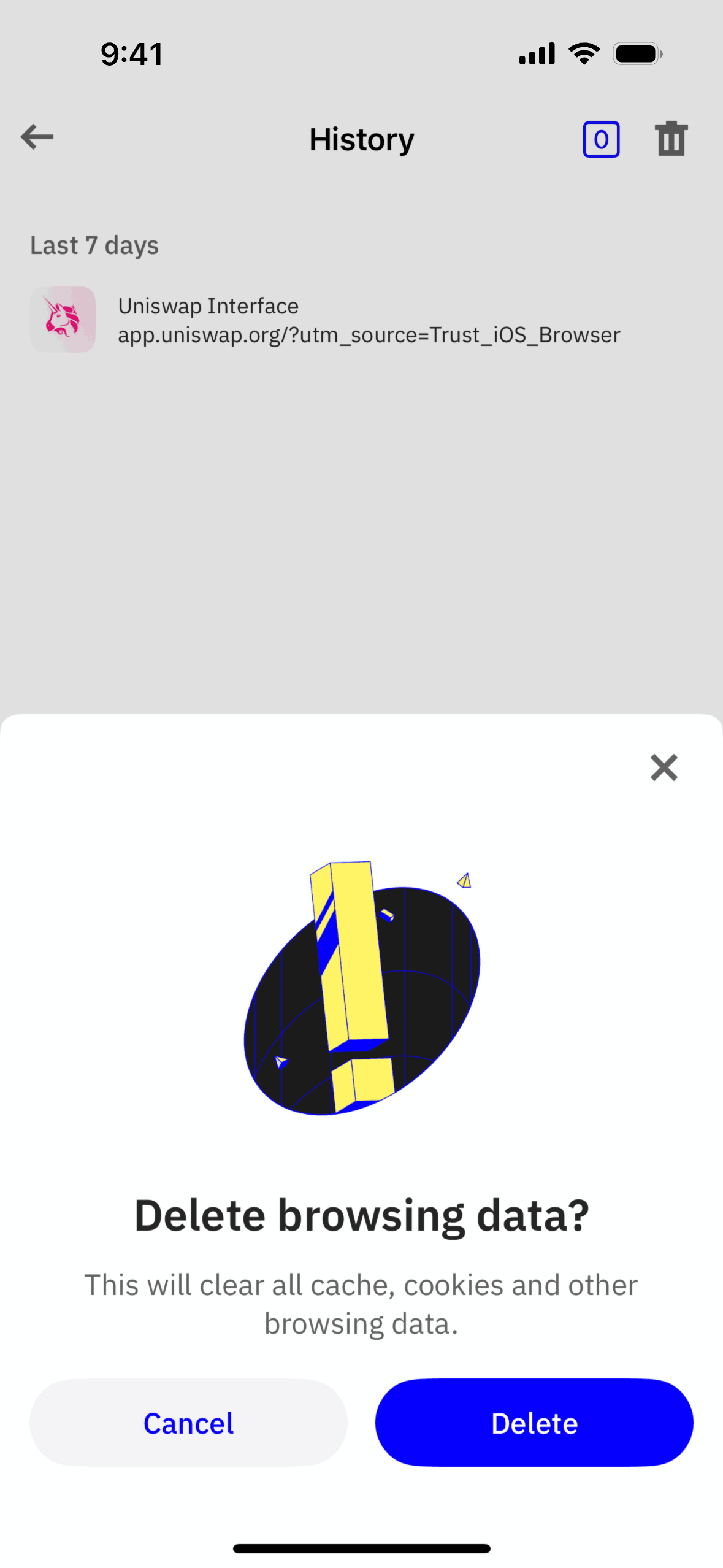 The user views their browsing history and then deletes it. The flow concludes with an empty history screen and a prompt to start browsing.