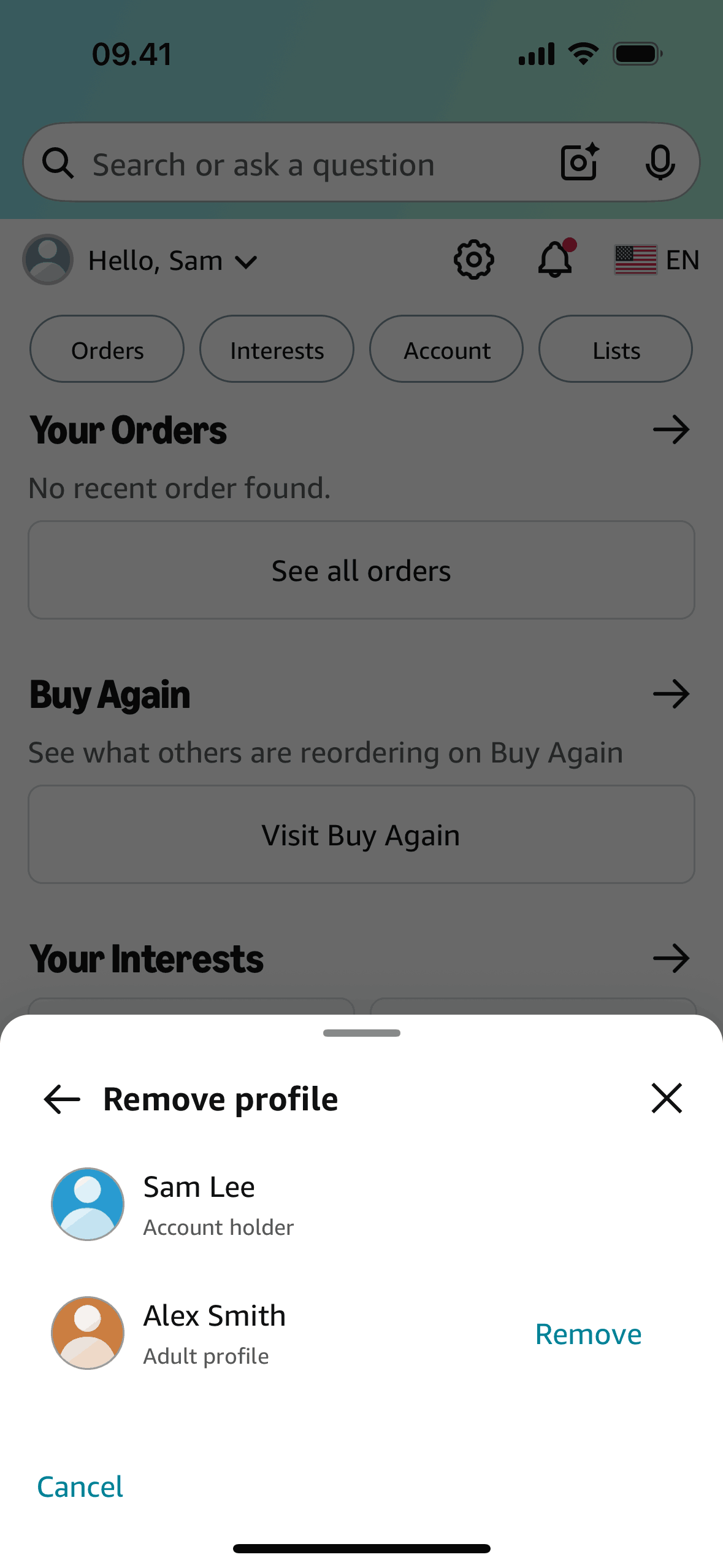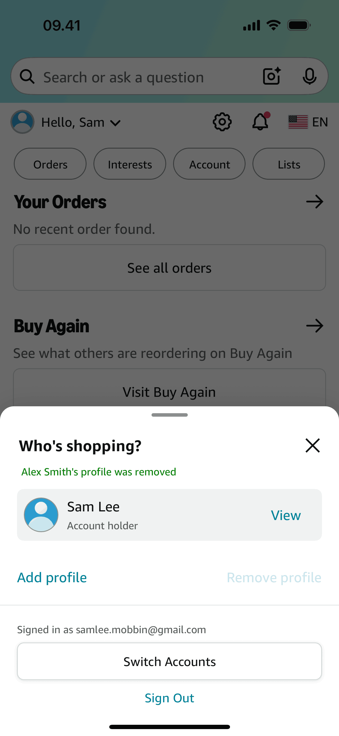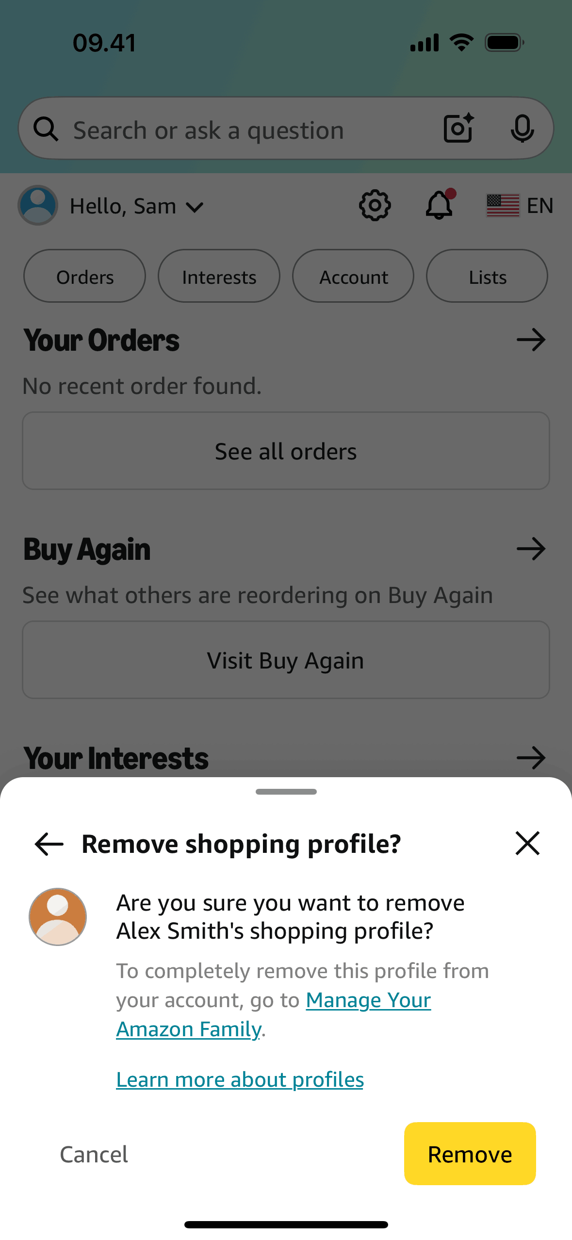 The user flow demonstrates removing a profile. It involves confirming the removal and then receiving a confirmation message.