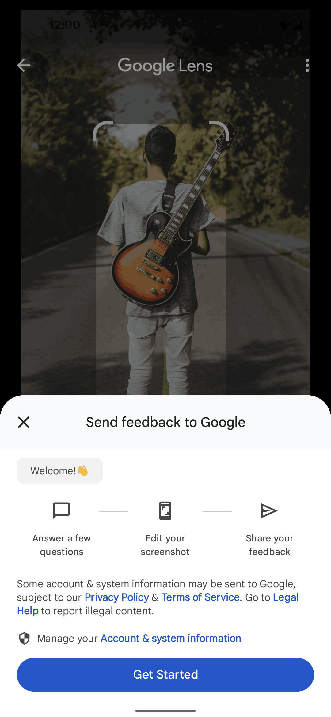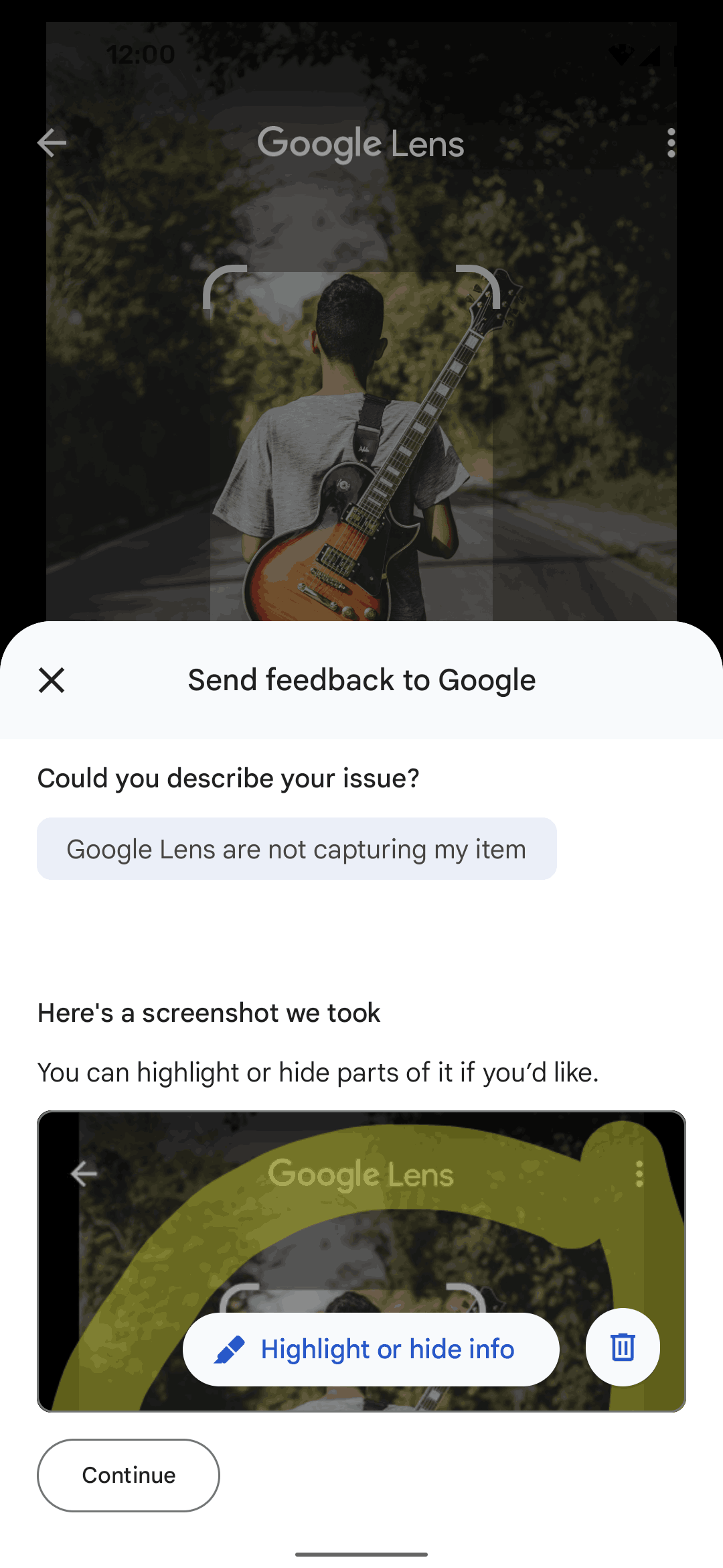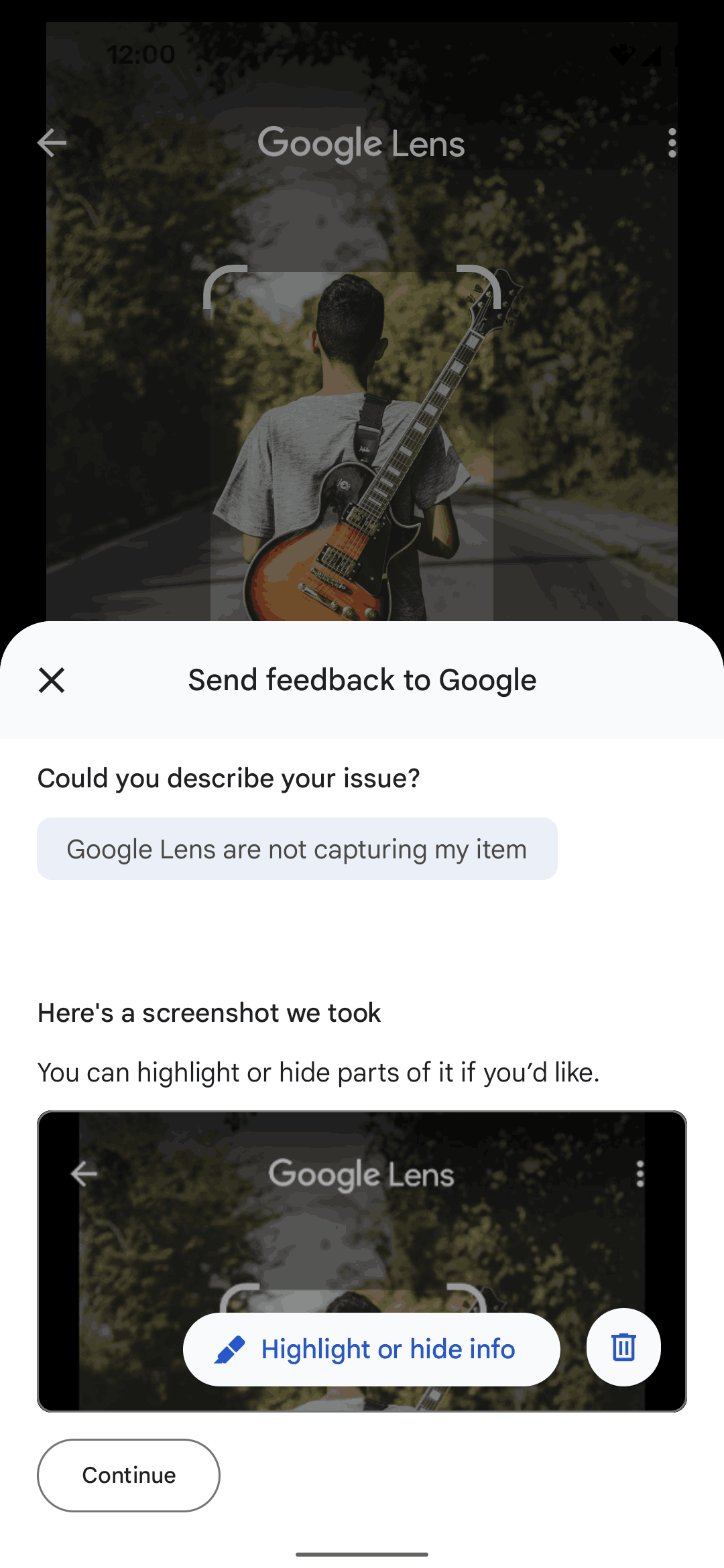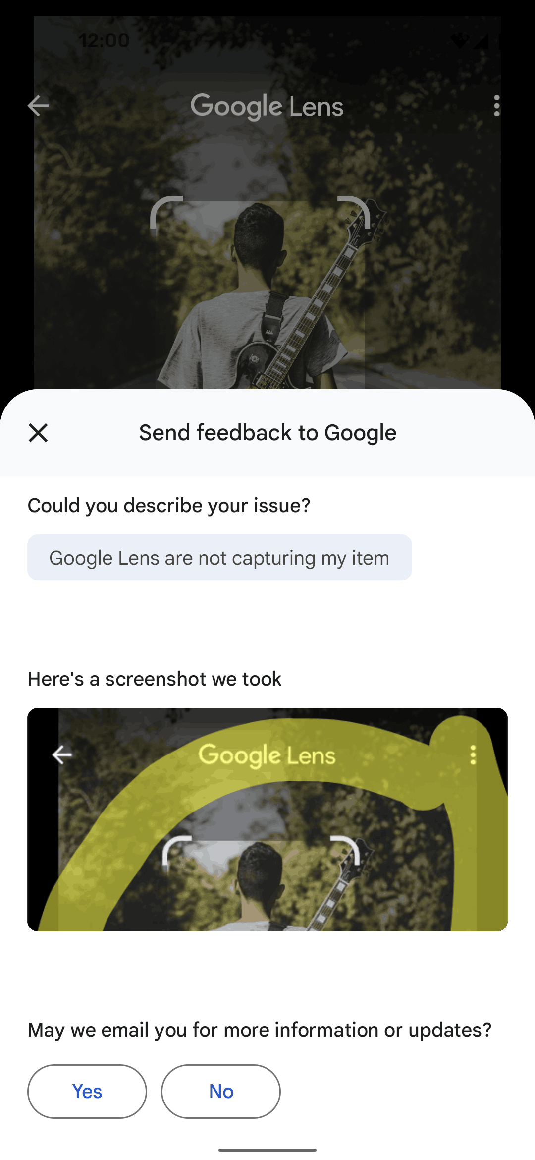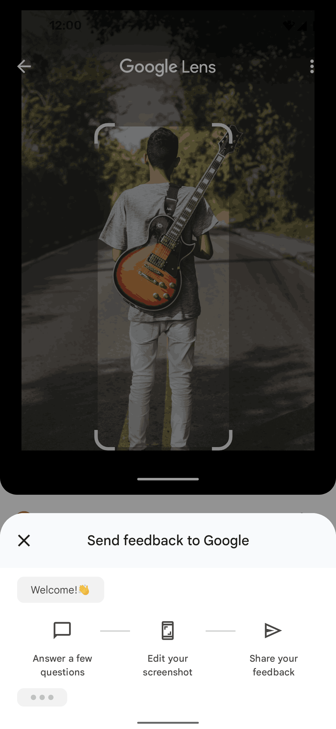 The user provides feedback on a Google Lens scan by describing an issue and editing a screenshot. The flow ends with a confirmation message.