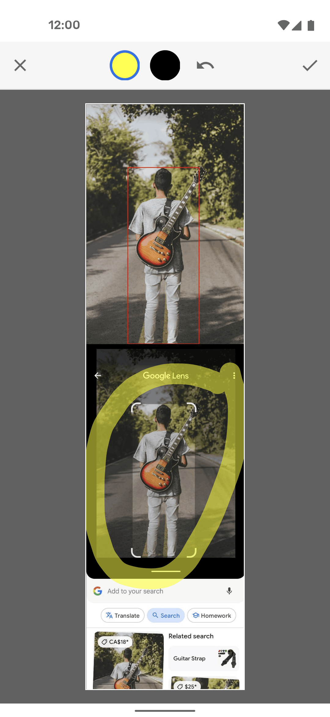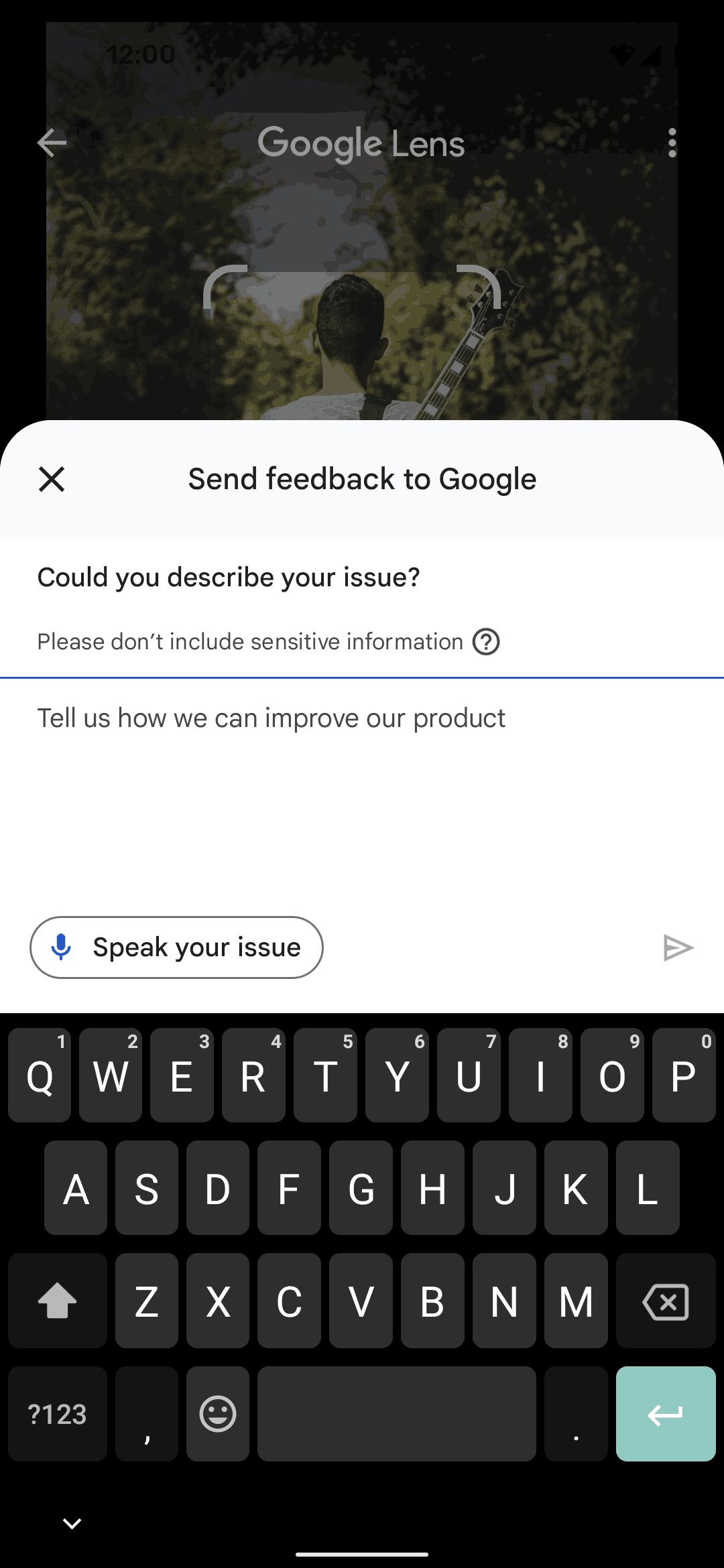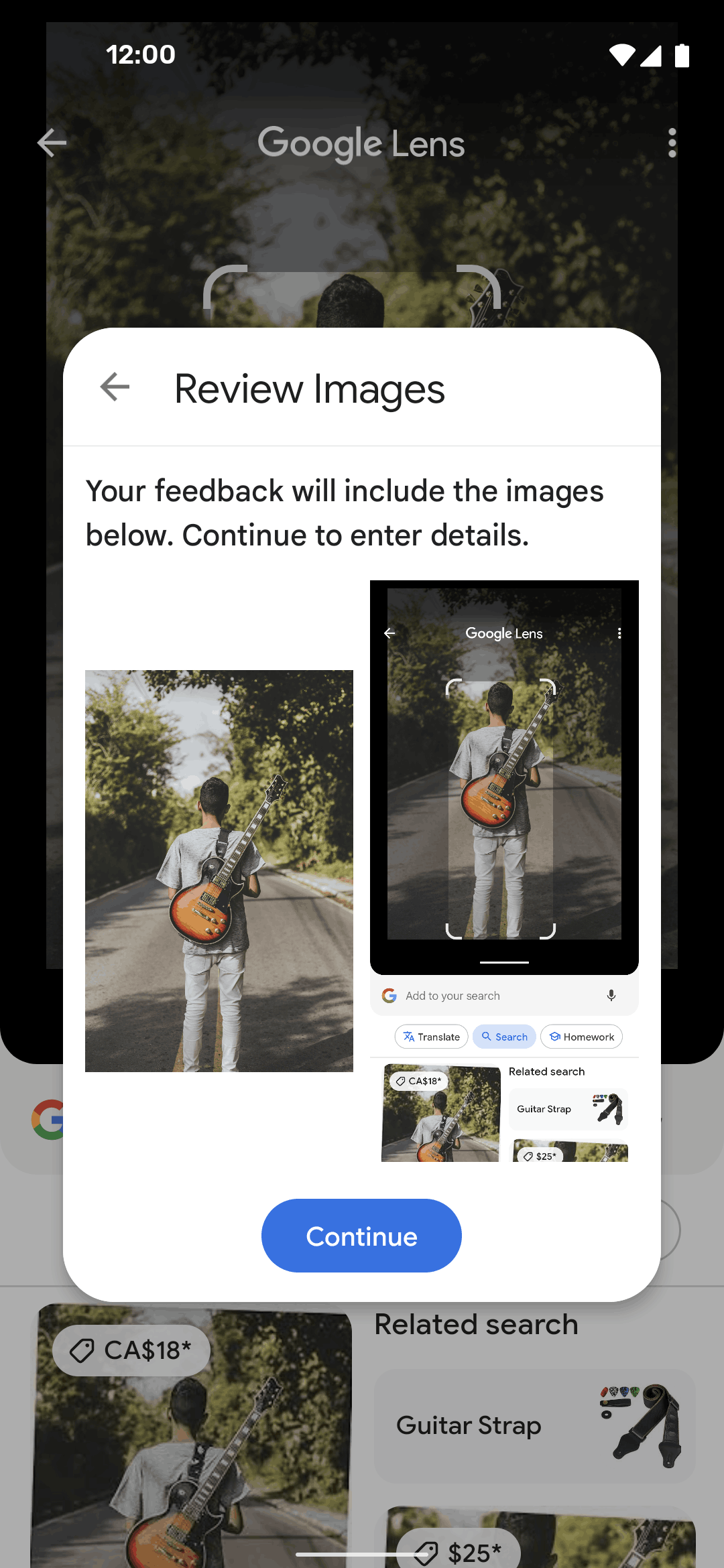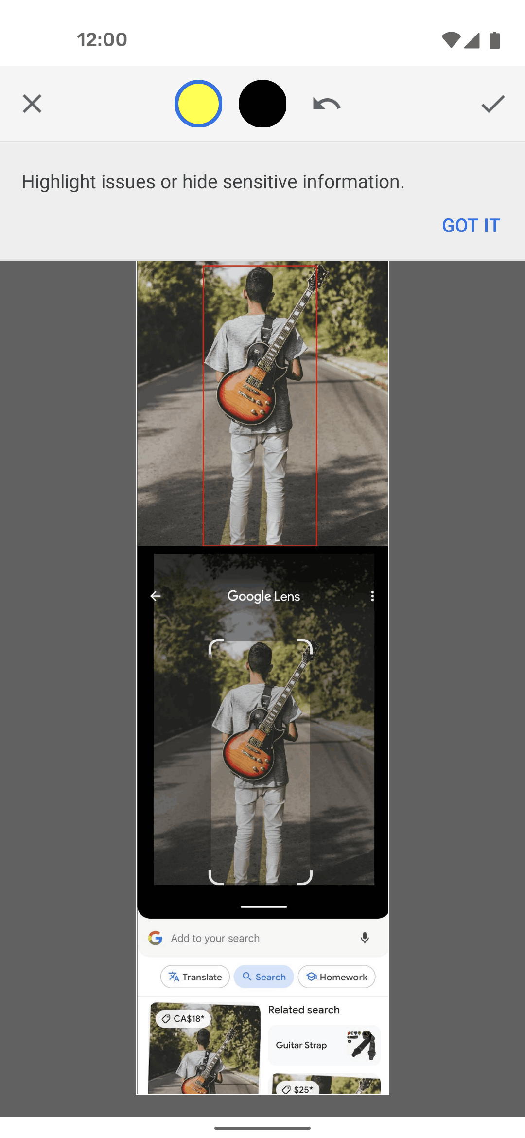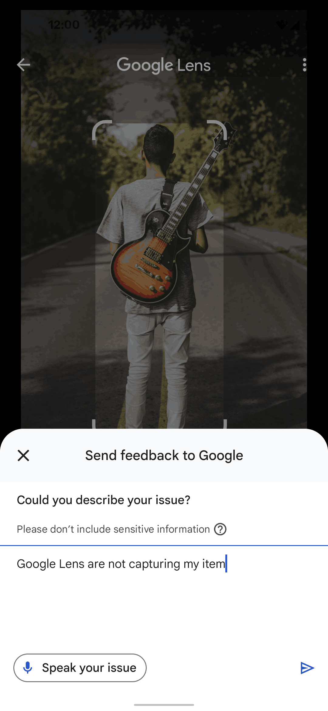 The user provides feedback on a Google Lens scan by describing an issue and editing a screenshot. The flow ends with a confirmation message.