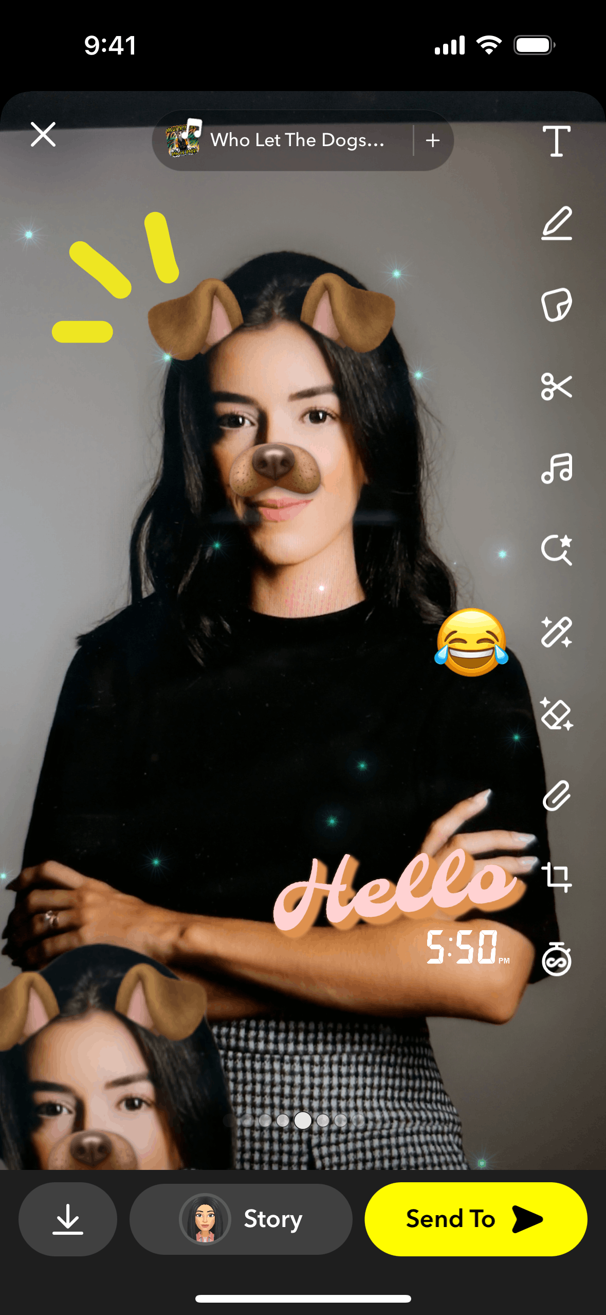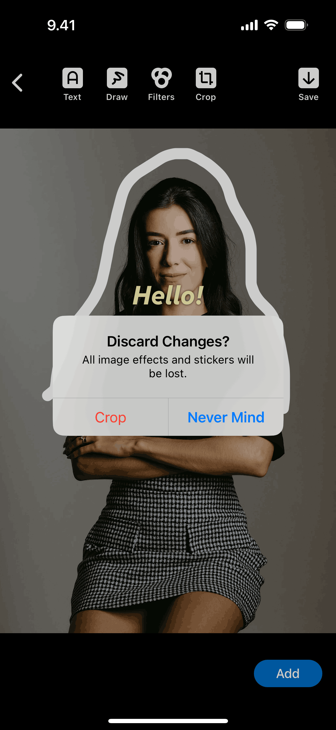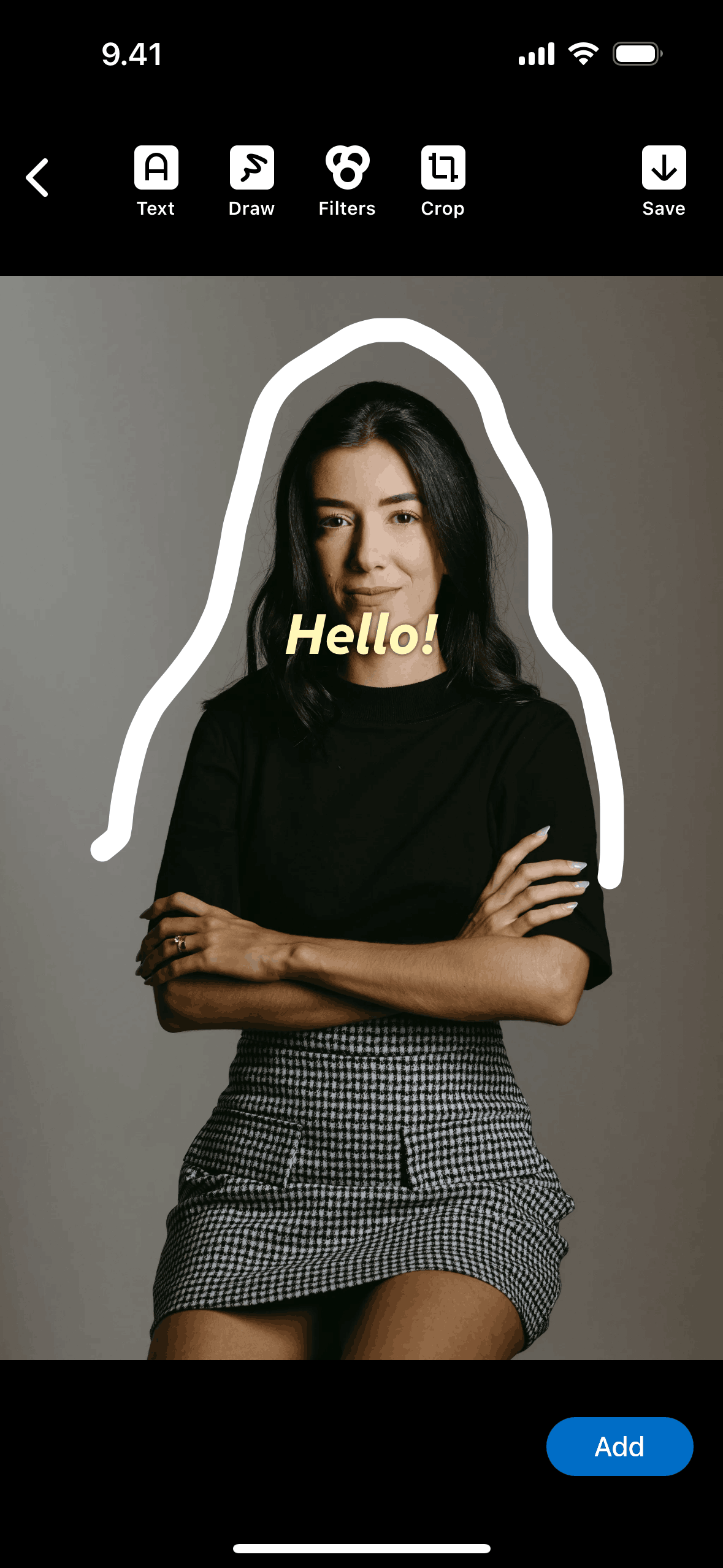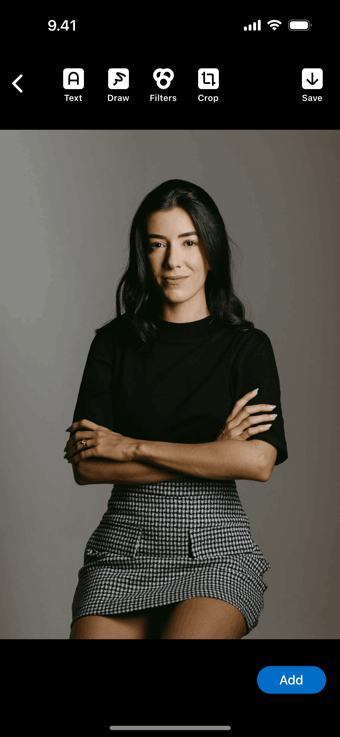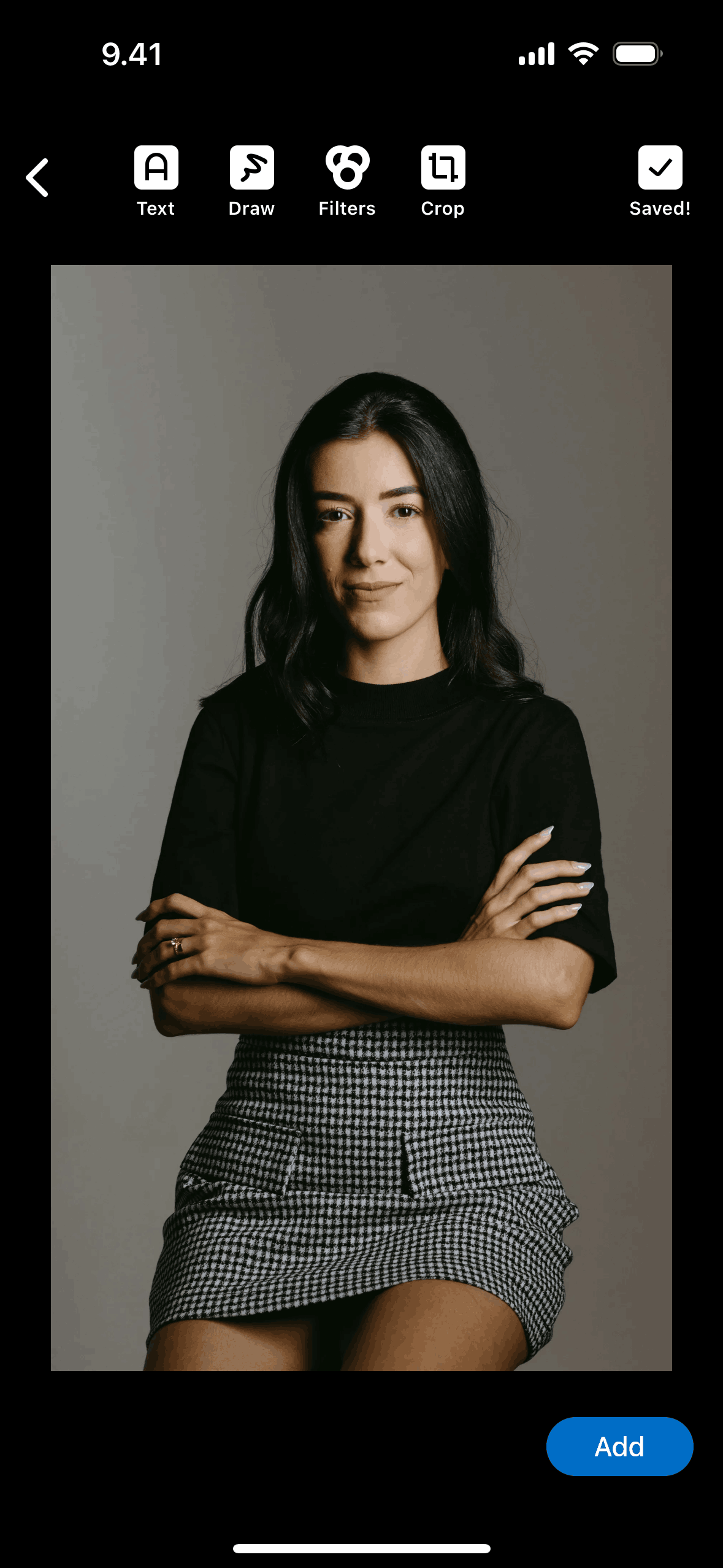 The user edits an image by adding text, drawings, and filters, then crops it. The final edited image is then shared in a post.
