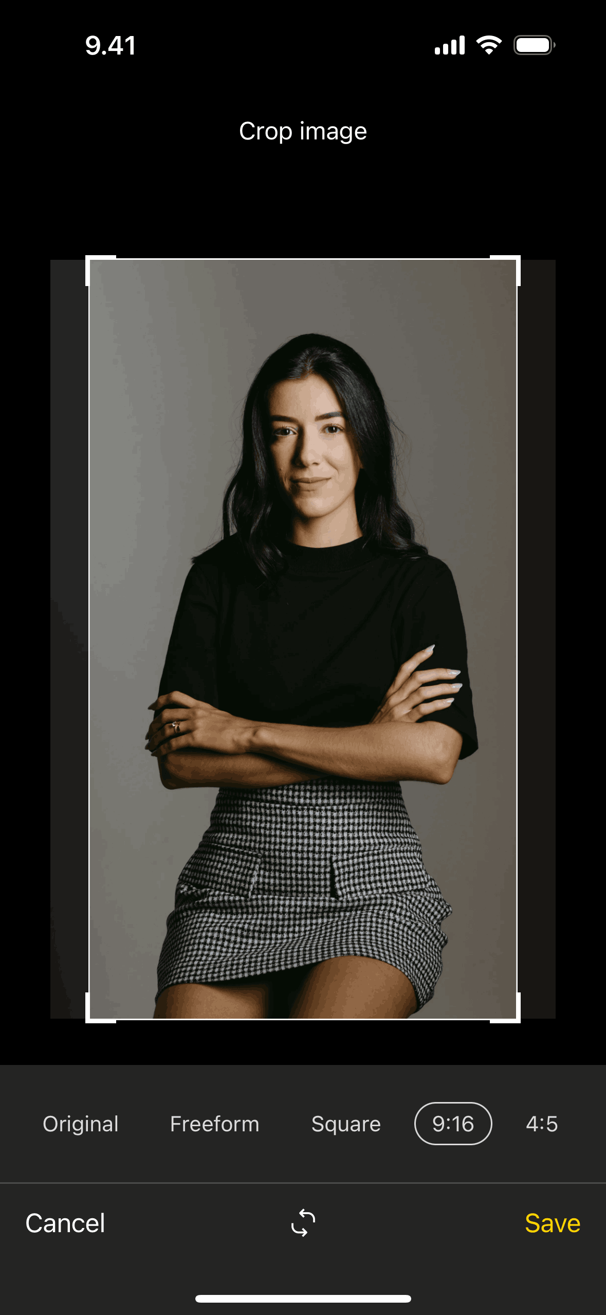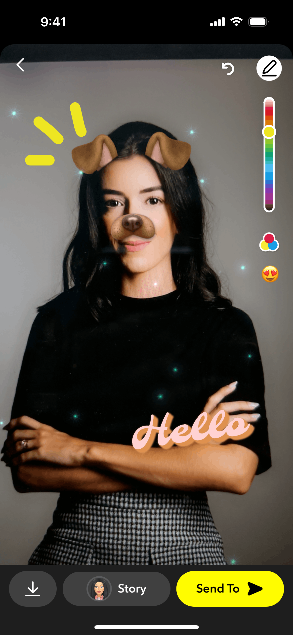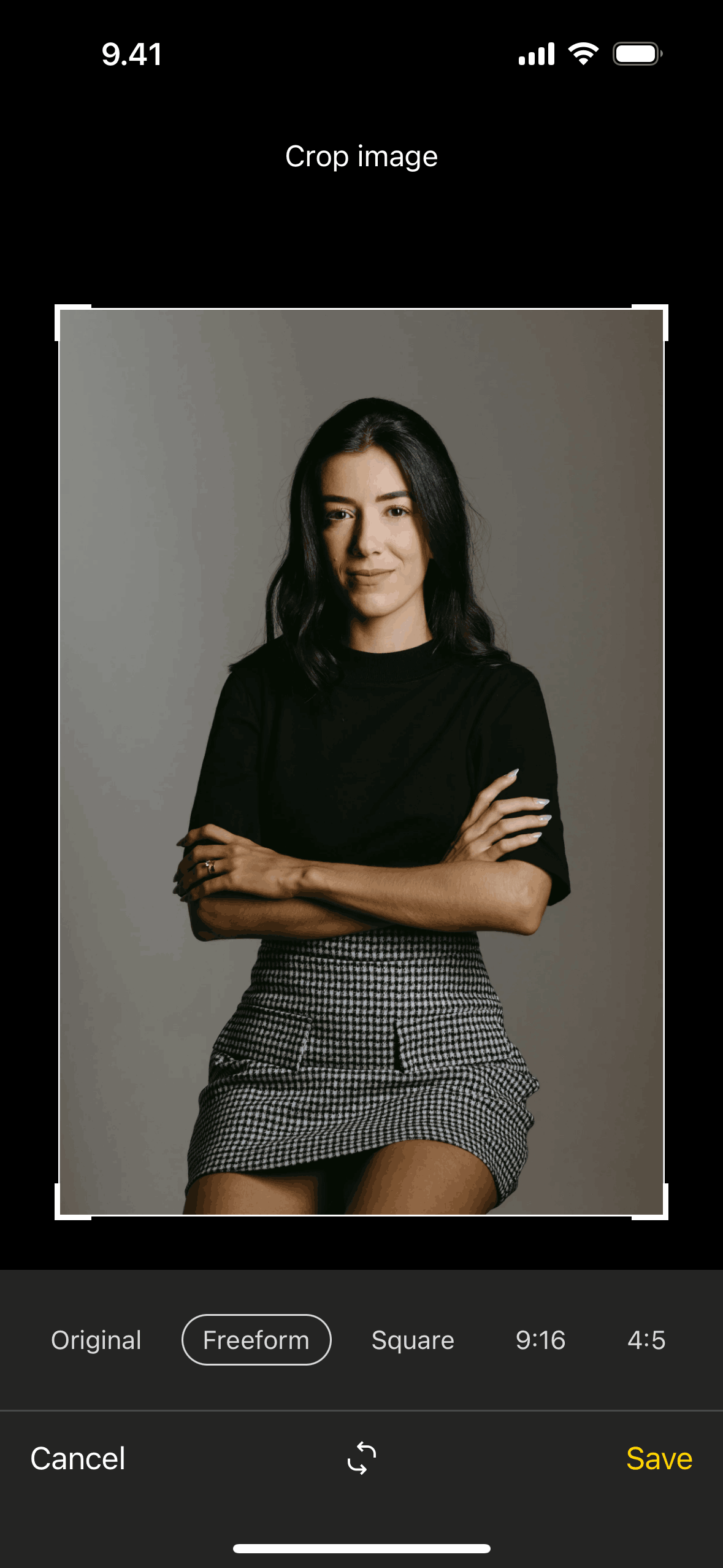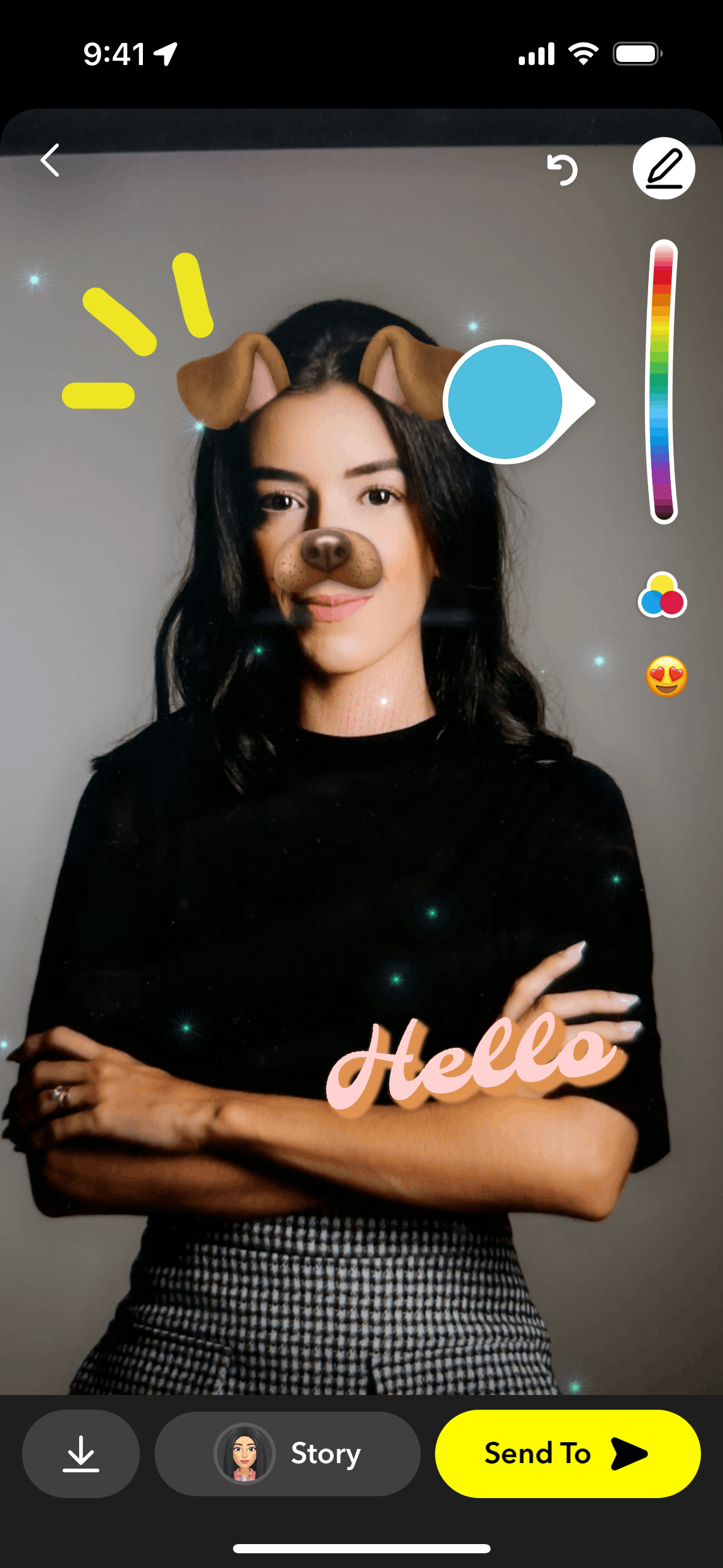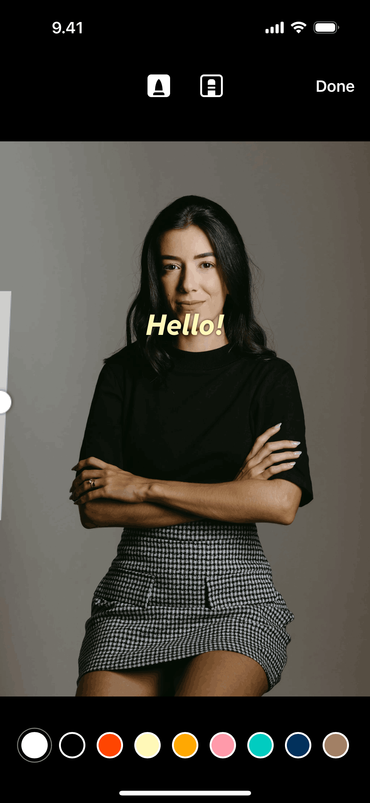 The user edits an image by adding text, drawings, and filters, then crops it. The final edited image is then shared in a post.