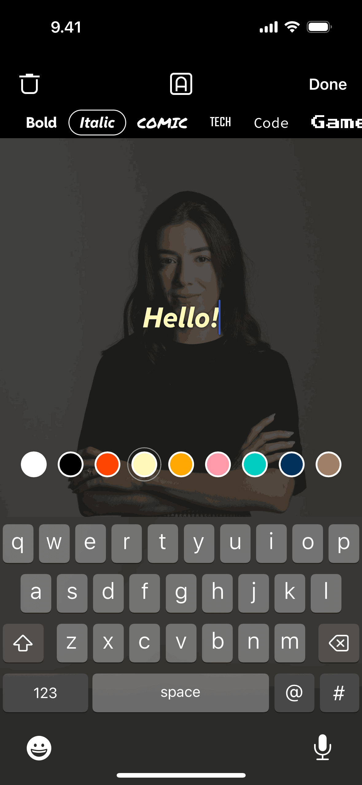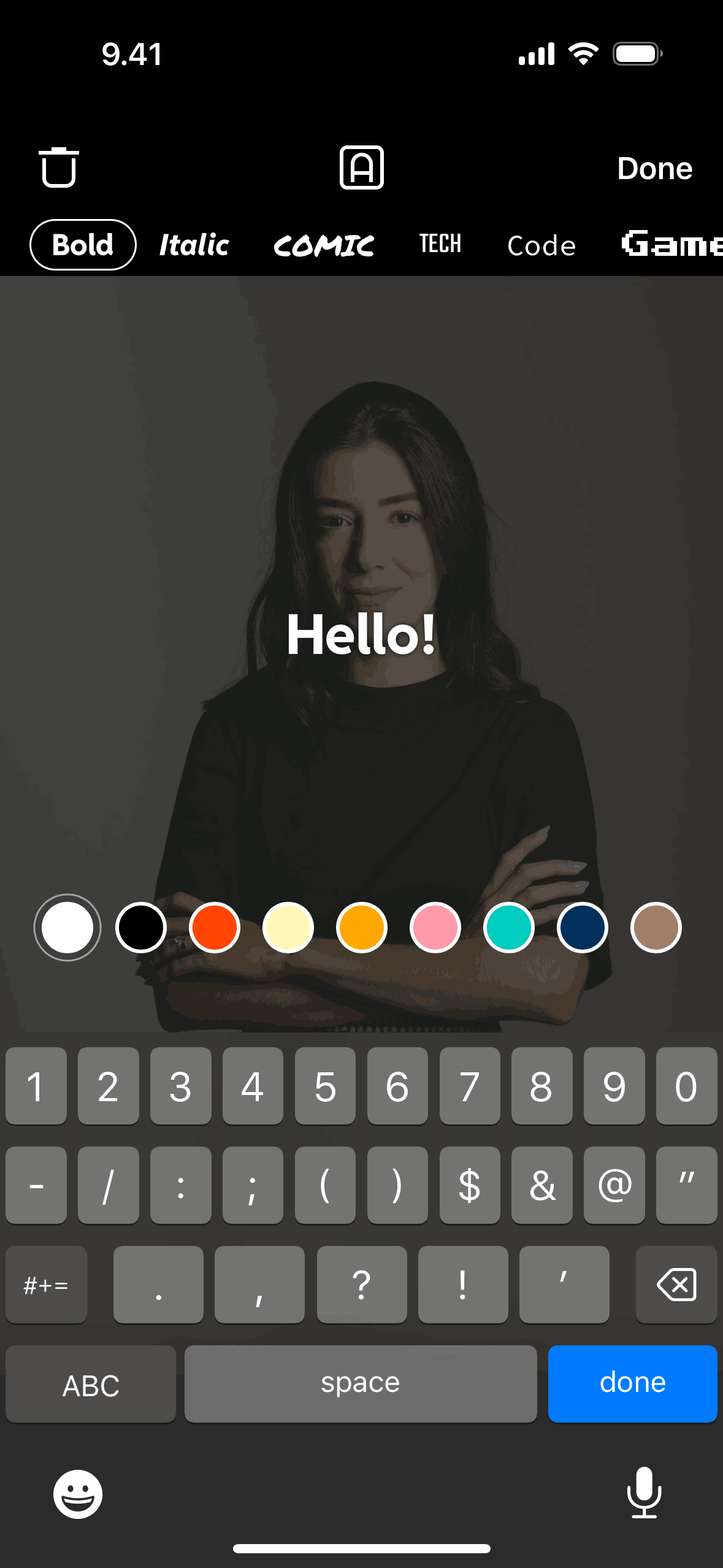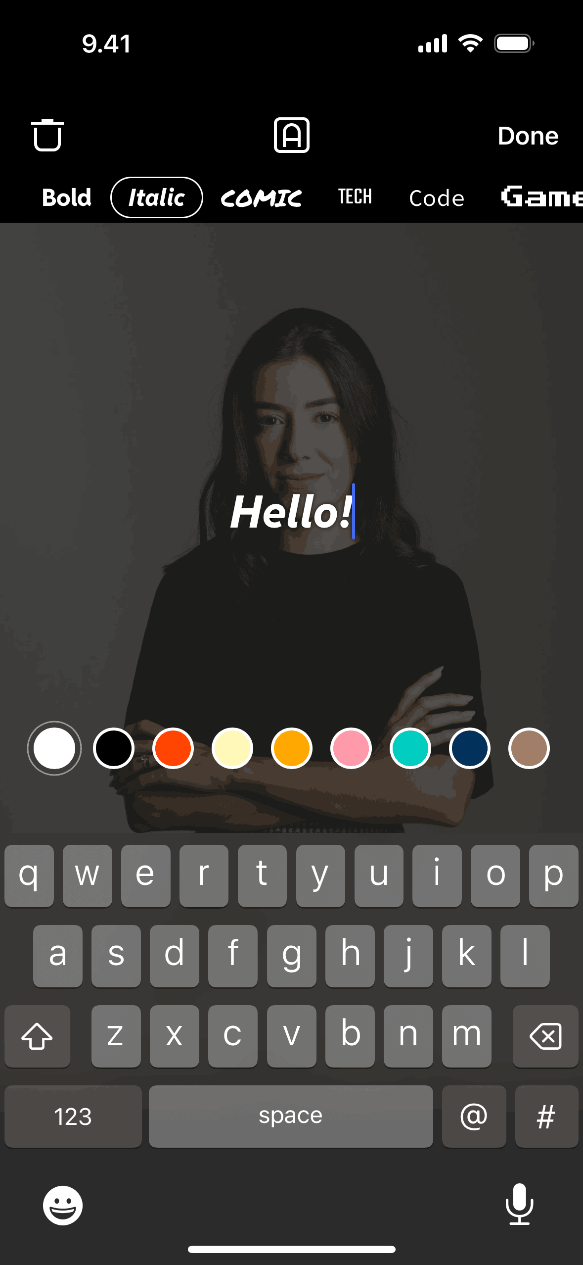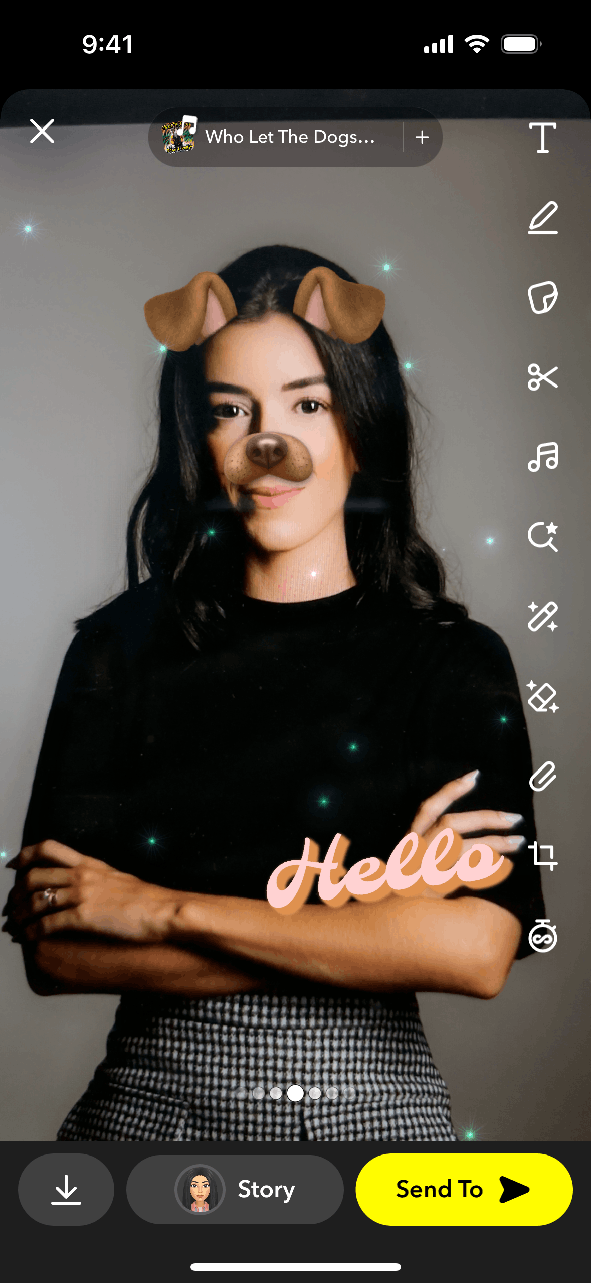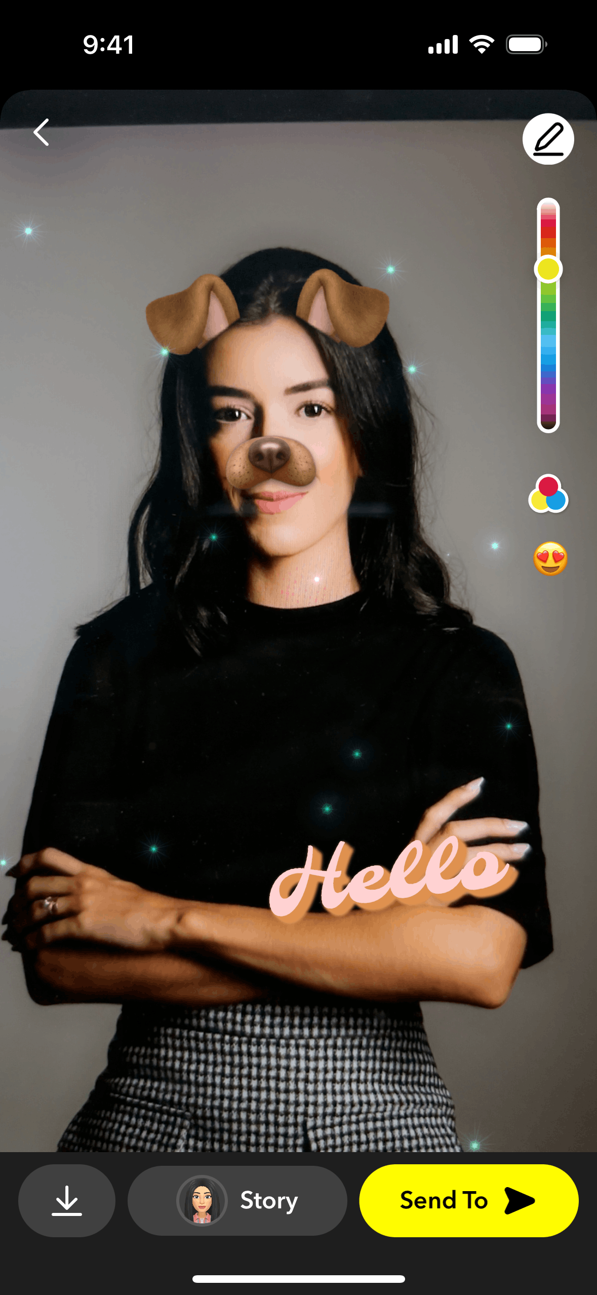 The user edits an image by adding text, drawings, and filters, then crops it. The final edited image is then shared in a post.